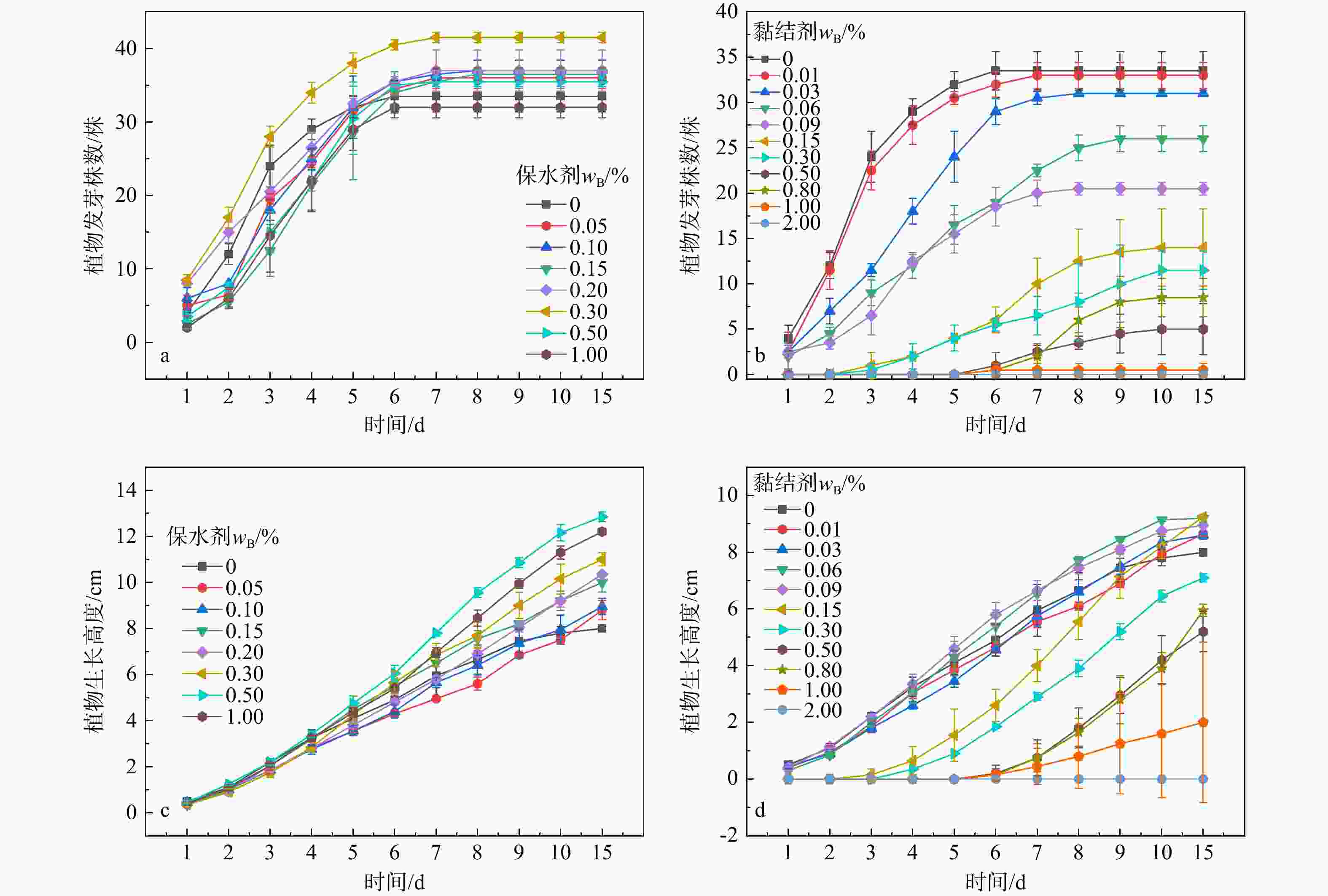 Results The results showed that a moderate content of water-retaining agent can increase the germination rate and height of the plants, whereas a slightly higher content of binder (greater than 0.15%) not only decreased the height of the plants but also reduced their growth rate. The properties of the soil substrates with different compositions differed significantly, but almost all the indicators were better than those of the natural soil in the blank control group. After screening, the soil substrates in groups P6, P10, P16, P1, and P15 presented good plant growth, physical structure, and water retention. With the increase of slope and rainfall intensity, the amount of substrate loss increased significantly, and the soil substrates in group P15 demonstrated greater erosion resistance.