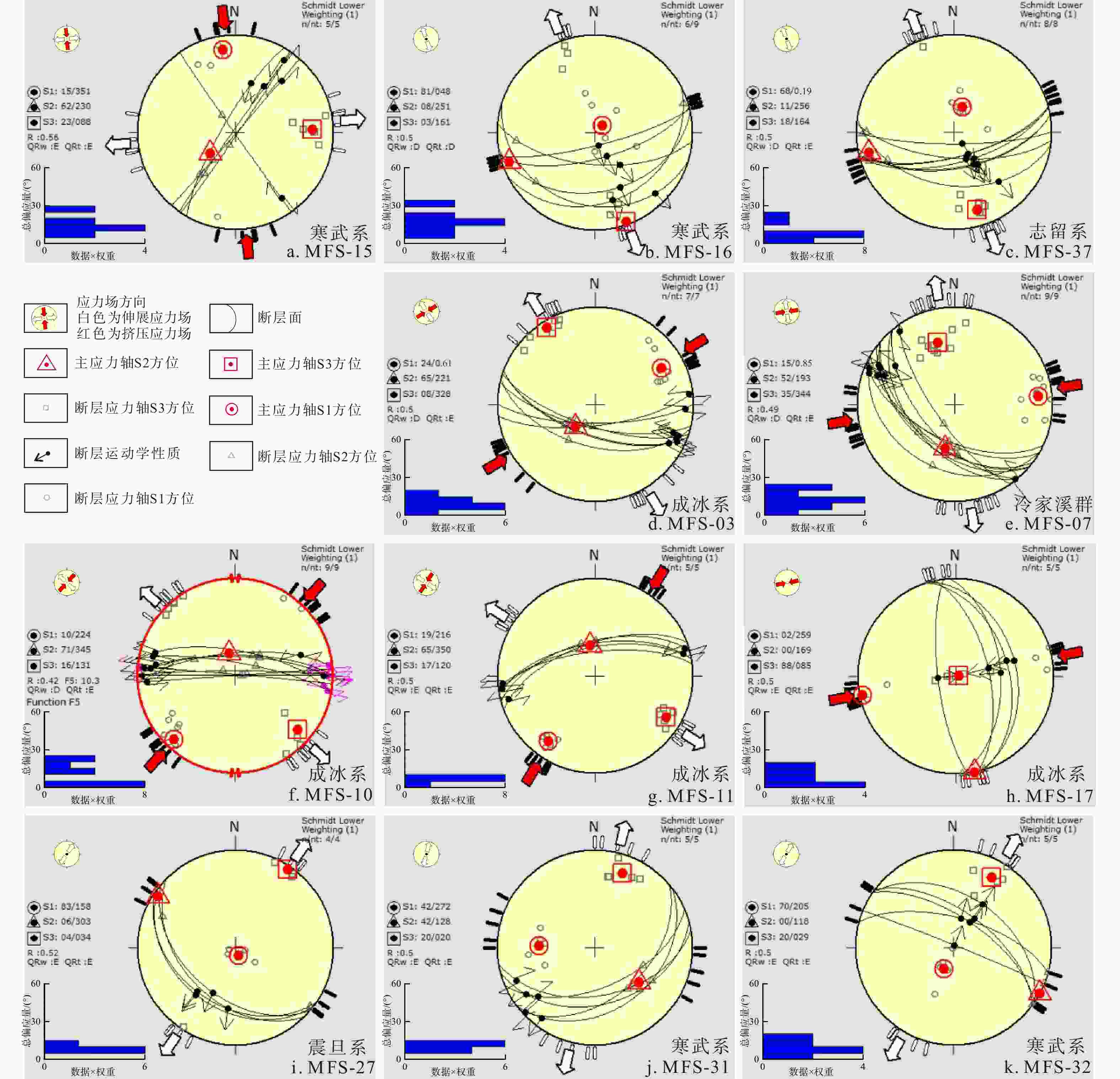 a. 第一期走滑应力场,N-S向水平的最大主应力,E-W向水平的最小主应力;b,c. 第二期NW-SE向伸展应力场,NW-SE向水平的最小主应力,中间主应力直立;d,e,f,g,h. 第三期走滑应力场,NE-SW向水平的最大主应力,NW-SE向水平的最小主应力;i,j,k. 第四期NE-SW向伸展应力场,NE-SE向水平的最小主应力,中间主应力直立;Schmidt Lower. 施密特网下半球投影;Weighting. 权重;n. 数据个数;S1. 最大主应力轴方位;S2. 中间主应力轴方位;S3. 最小主应力轴方位;R. 应力比;Function. 函数;QRw. WSM(世界地应力图)定义的质量等级;QRt. TENSOR程序中定义的质量等级