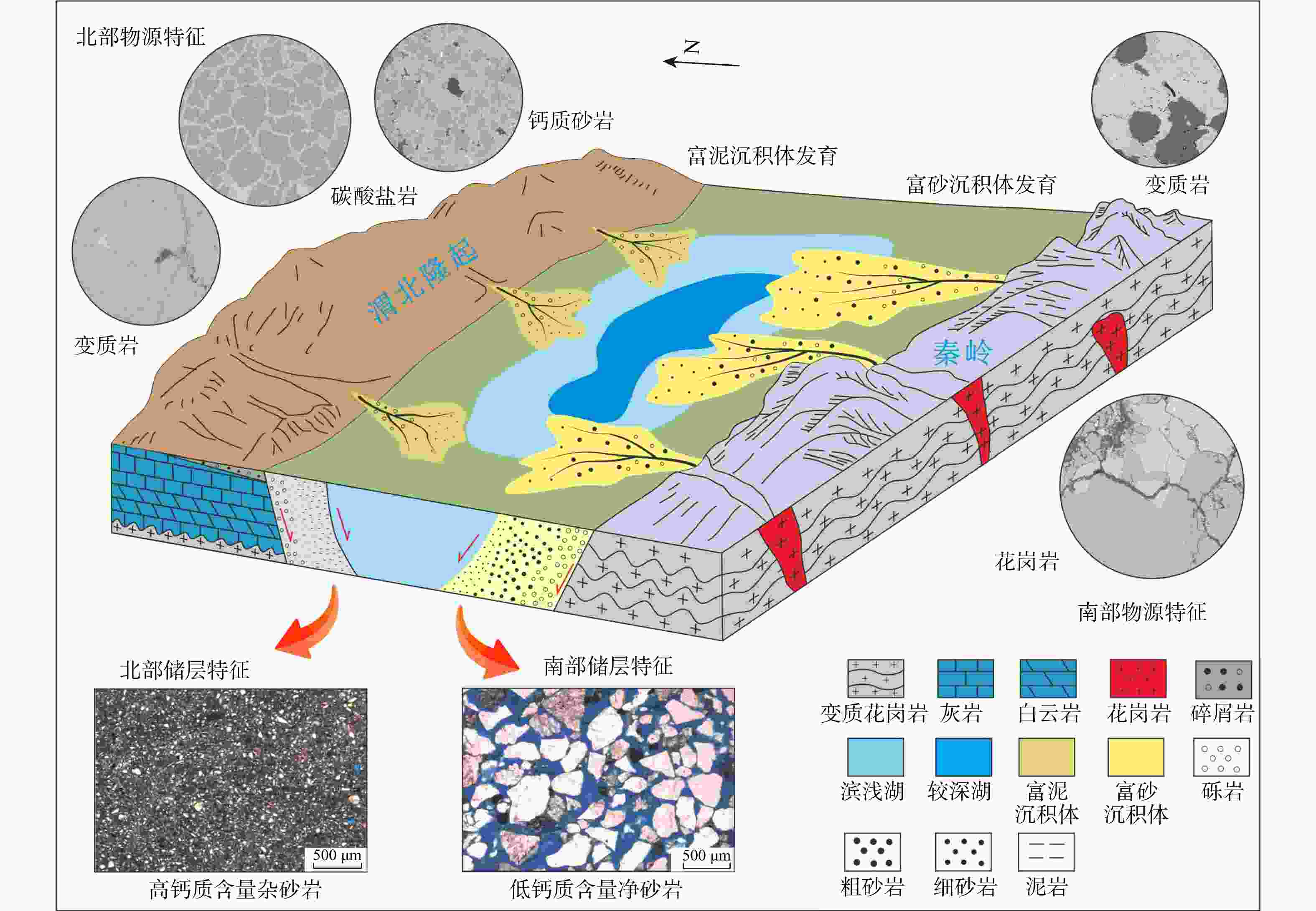 Results The findings reveal that the detrital zircons in the northern Huacheng section exhibit two prominent ancient peaks from the North China Craton, alongside a younger peak corresponding to Caledonian and Hercynian tectonic movements. The conglomerate gravel types at the base of the sequence predominantly consist of carbonate rocks, calcareouss clastic rocks, and metamorphic rocks, which reflect distinct characteristics of Paleozoic carbonate and clastic rocks from the Weibei Uplift in the north. In contrast, the southern profiles are dominated by detrital zircons from late Caledonian and Late Indosinian peaks, with gravel types primarily consisting of granites and metamorphic rocks, indicative of provenance from the southern Qinling Mountains. Observations of profiles demonstrate that these provenance differences result in significant disparities in the sedimentary system and reservoir characteristics. The carbonate provenance area of the Weibei Uplift corresponds to a small, mud-rich sedimentary body, where the bottom conglomerate transitions directly to silty sand and mudstone, resulting in high calcium content in the reservoir. Conversely, the southern Qinling orogenic belt features extensive sedimentary bodies, multi-cycle sand-rich deposits, and low calcium content.