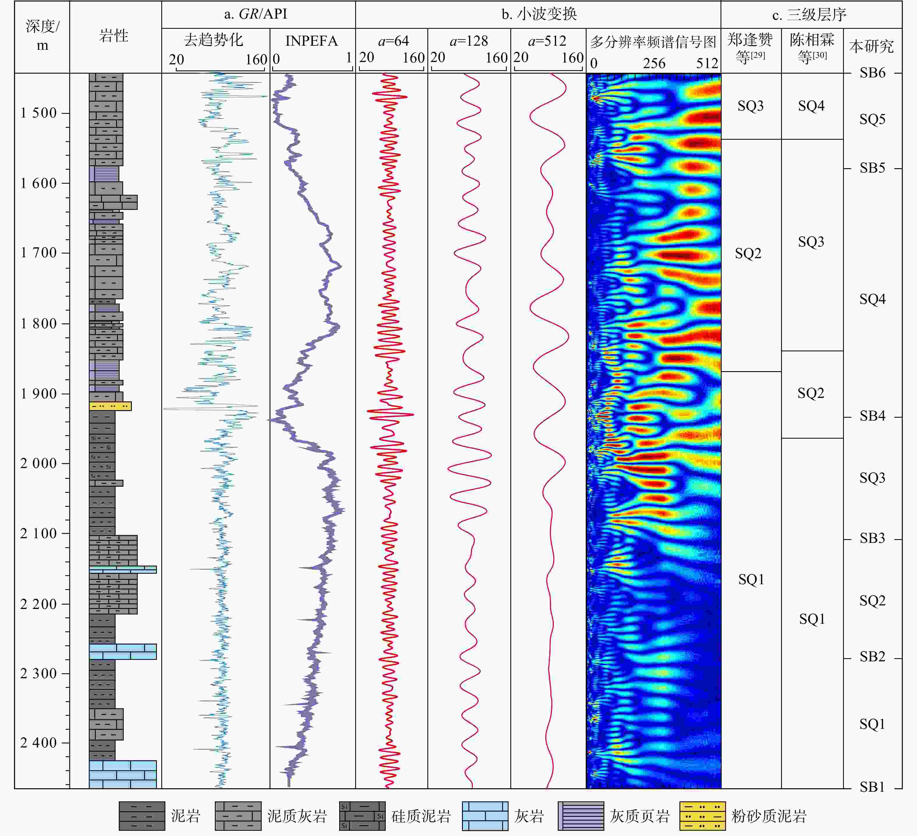 1457 –2466 m) from the Well Qian Shui Di-1 in Southwest Guizhou.Methods Utilizing the natural gamma ray (GR) log as a proxy indicator, methods including time series analysis, INPEFA (integrated noise-enhanced population evolutionary frequency analysis), and wavelet analysis were applied to conduct cyclostratigraphic and sequence stratigraphic investigations. The aim is to achieve a "quantitative" division of the sequence stratigraphy for this shale unit from an astronomical forcing perspective.
