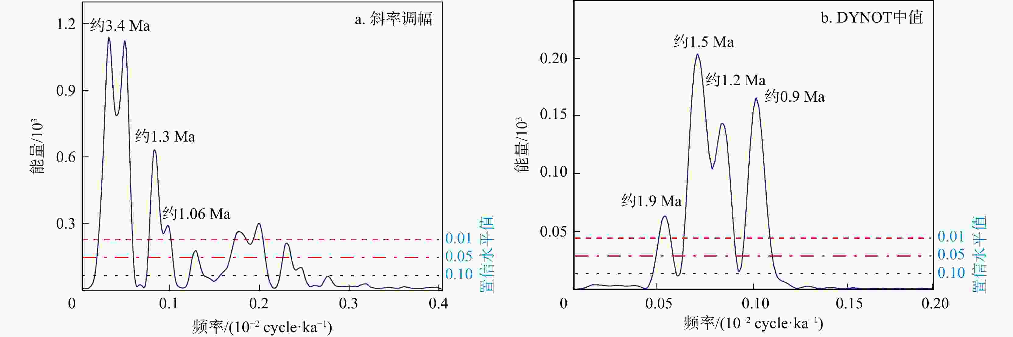 1457 ~2466 m)页岩为研究对象,以自然伽马测井曲线为替代指标,采用时间序列分析、合成预测误差滤波分析(INPEFA)和小波分析等方法,开展旋回地层学分析与层序地层学研究,旨在从天文旋回的角度,实现对该套页岩的层序地层“定量”划分。研究表明,黔西南下石炭统打屋坝组页岩地层记录了天文周期信号,相关系数法(COCO)估算显示其最优沉积速率为16.4 cm/ka,对应405 ka长偏心率周期的66.42 m沉积厚度。对黔水地1井GR分段(1457 ~1932 m和1932 ~2466 m)进行频谱分析和天文检验,上段和下段的最优沉积速率分别为16.5,11.2 cm/ka,打屋坝组一共记录了19个长偏心率周期,建立了“浮动”天文年代标尺,估算持续时限约7.86 Ma。通过沉积噪音模型(DYNOT和ρ1)恢复了相对海平面变化曲线。在旋回地层学研究建立的时间框架基础上,结合相对海平面极值、INPEFA和小波分析,识别了6个三级层序界面,划分出5个三级层序,并认为三级层序的发育受控于稳定的约1.2 Ma斜率振幅调制周期。应用旋回地层学开展了黔西南打屋坝组页岩地层的层序划分,探讨不同时间尺度下天文轨道参数与相对海平面变化的关系,实现了三级及四级层序地层的划分。该方法为海相页岩万年时间尺度的等时对比提供了可能,可为页岩油气勘探中优质烃源岩发育层段的预测提供精细的年代框架,进而为页岩油气勘探提供理论指导。Abstract:The Lower Carboniferous Dawuba Formation in Southwest Guizhou hosts a shale sequence with significant exploration potential. Current disagreements regarding its sequence division scheme and developmental mechanisms have somewhat hindered the understanding of the spatial distribution patterns of this high-quality shale.