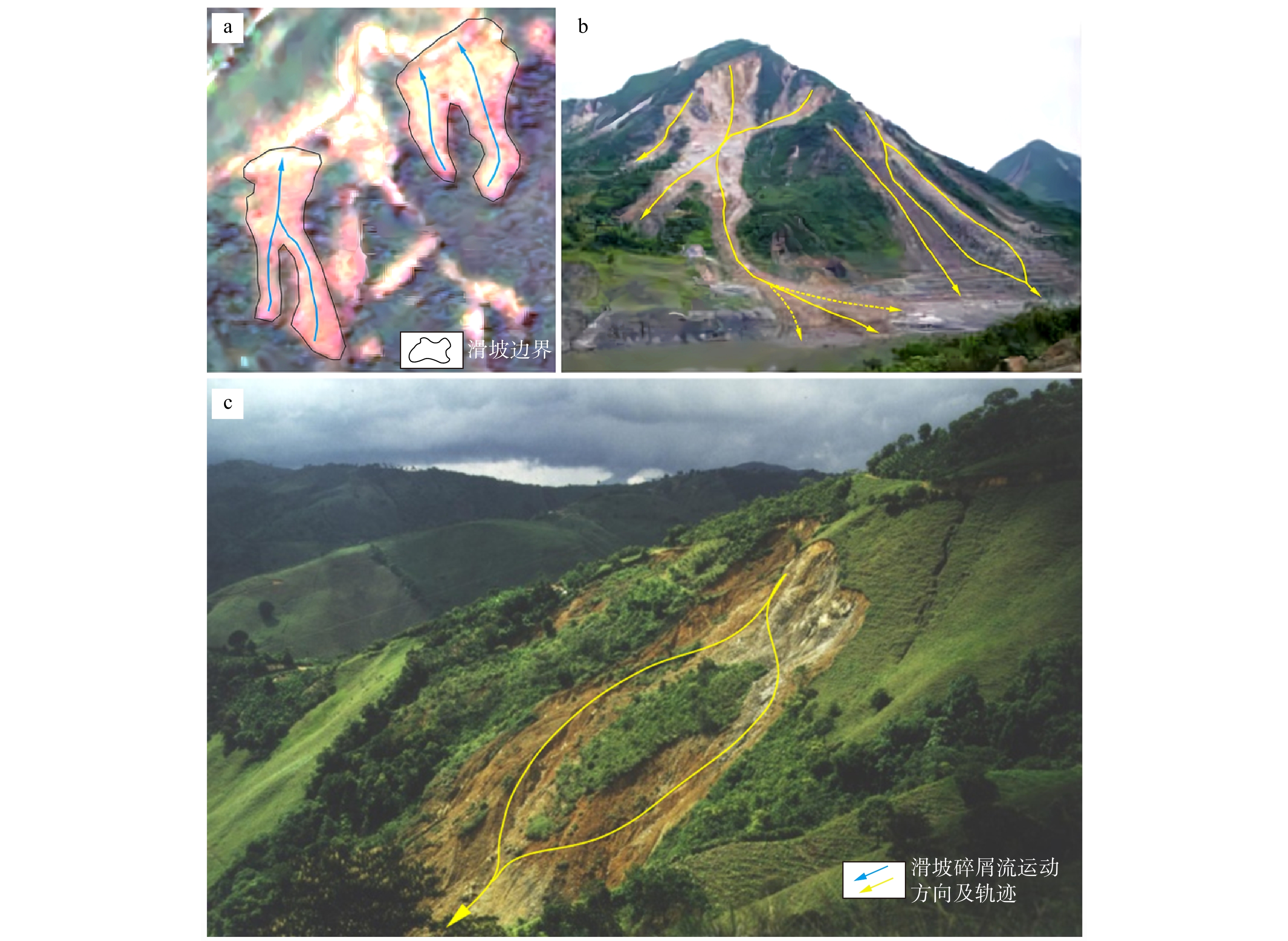 a. 福建南平滑坡;b. 汶川地震引发的滑坡;c. 交织滑坡(据文献[35]修改)