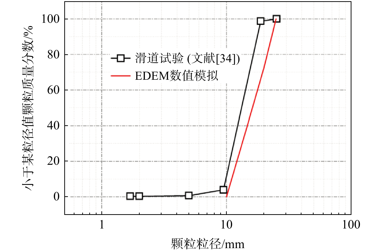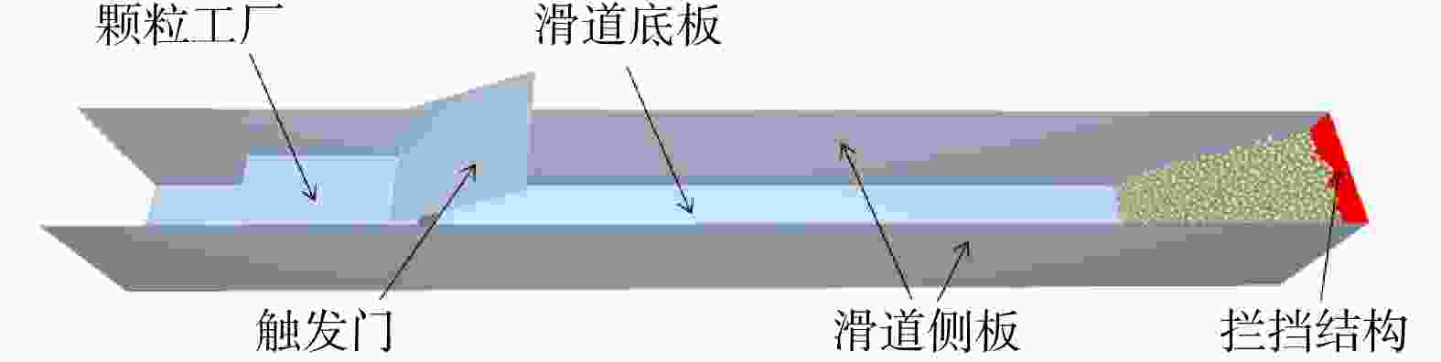 接触参数 取值 恢复系数 0.5 颗粒静摩擦系数 1.330 颗粒滚动摩擦系数 0.080 滑道静摩擦系数 0.466 滑道滚动摩擦系数 0.010 拦挡结构静摩擦系数 0.384 拦挡结构滚动摩擦系数 0.010 表 2 EDEM中模型与颗粒的属性取值