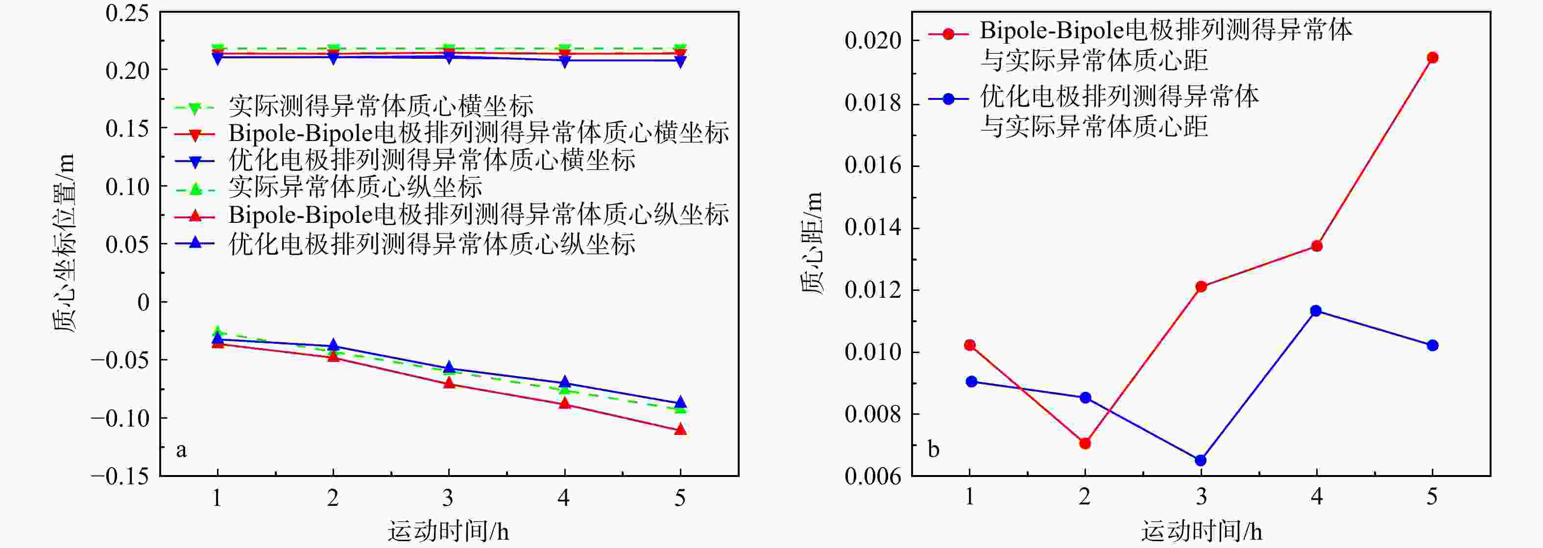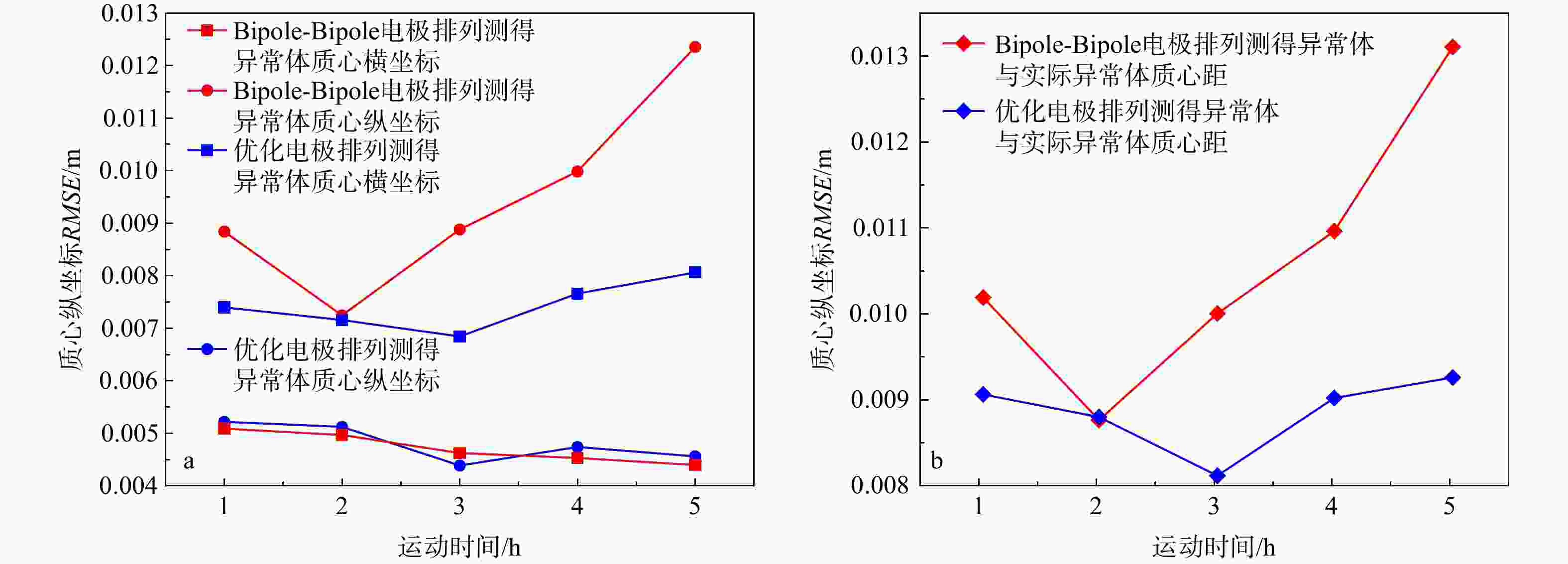 图 6 不同电极排列测得异常体质心坐标 (a) 及其与实际异常体质心距 (b) 的均方根误差(RMSE)