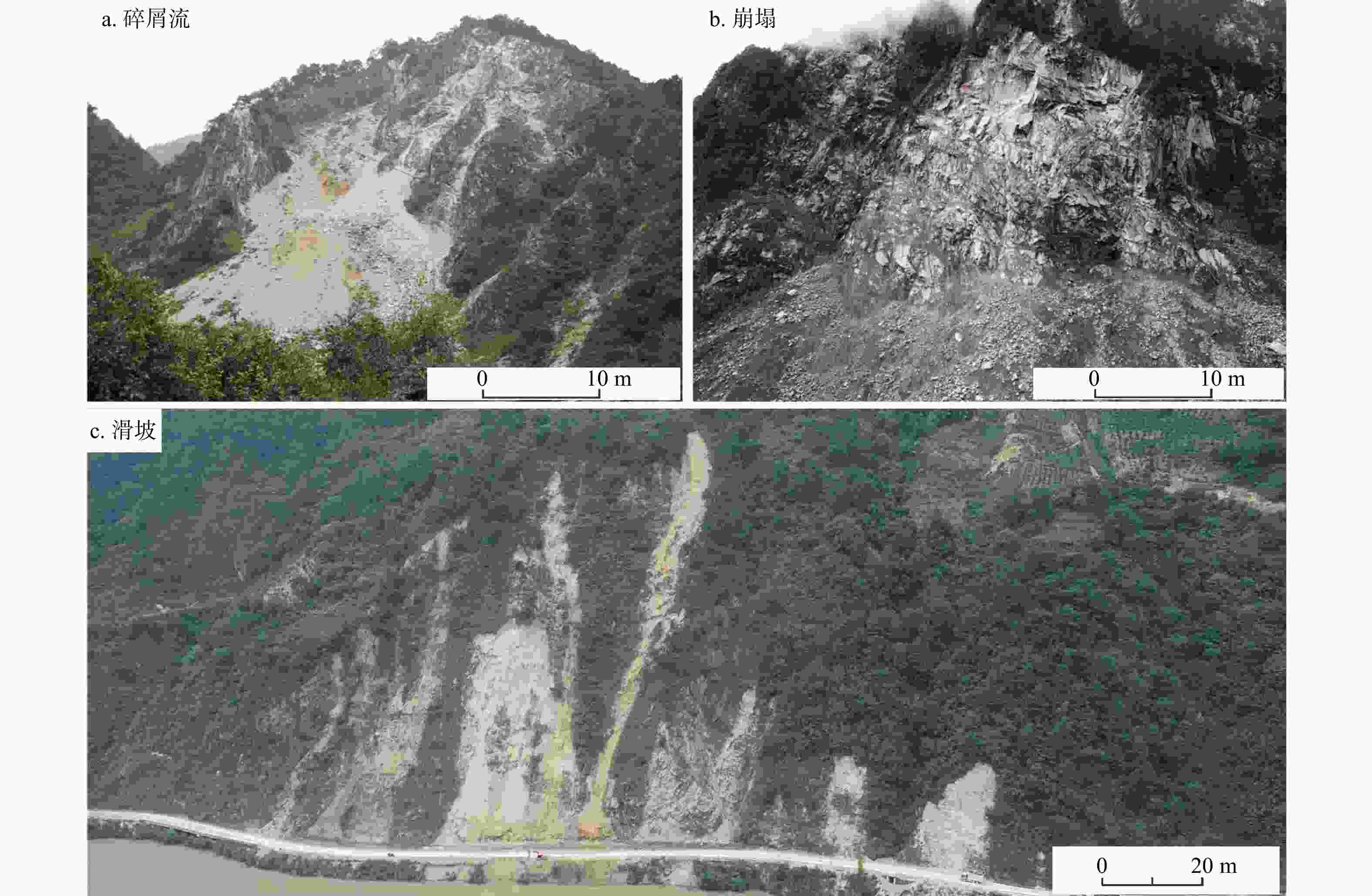 文献来源 研究区面积/km2 滑坡数量/个 滑坡总面积/km2 滑坡最小面积/m2 高程/m 坡度/(°) 坡向 距发震断层距离/km 地层岩性 文献[1-2] 419.2 3633 13.78 49 1200 ~1400 40~45 E 1 花岗岩 文献[3] 2600 4528 28.1 / 1200 ~1500 40~45 / 1 花岗岩 文献[21] 3056 2692 47 220.77 1800 ~2000 40~45 E 1 砂岩板岩 文献[25] 19000 8685 30.7 / / / / 2 / 文献[26] 4393 5007 17.36 65 1300 ~1500 40~50 E 1 花岗岩 文献[40] 166 513 8.88 / 1400 ~2200 40~45 E、SE 3 / 本研究 682 9248 46 15.5 1600 ~1800 40~45 E 0.5 花岗岩 -