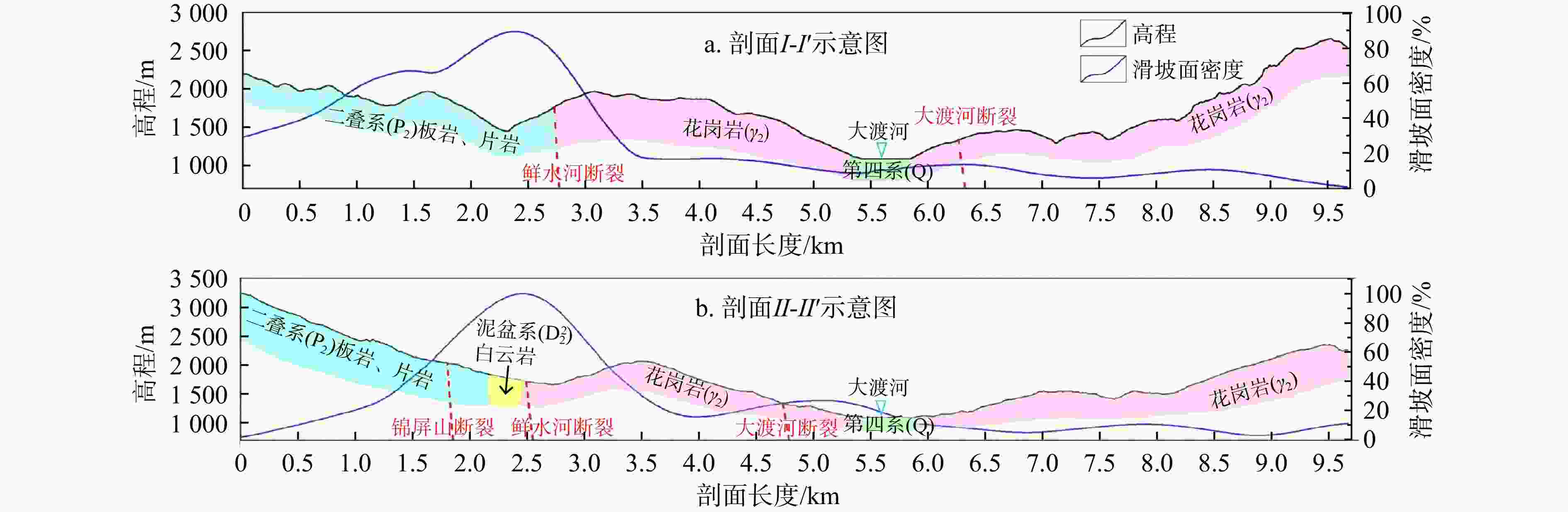 图 5 地震滑坡面密度、高程、地层岩性的剖面图(剖面位置见图4b)
