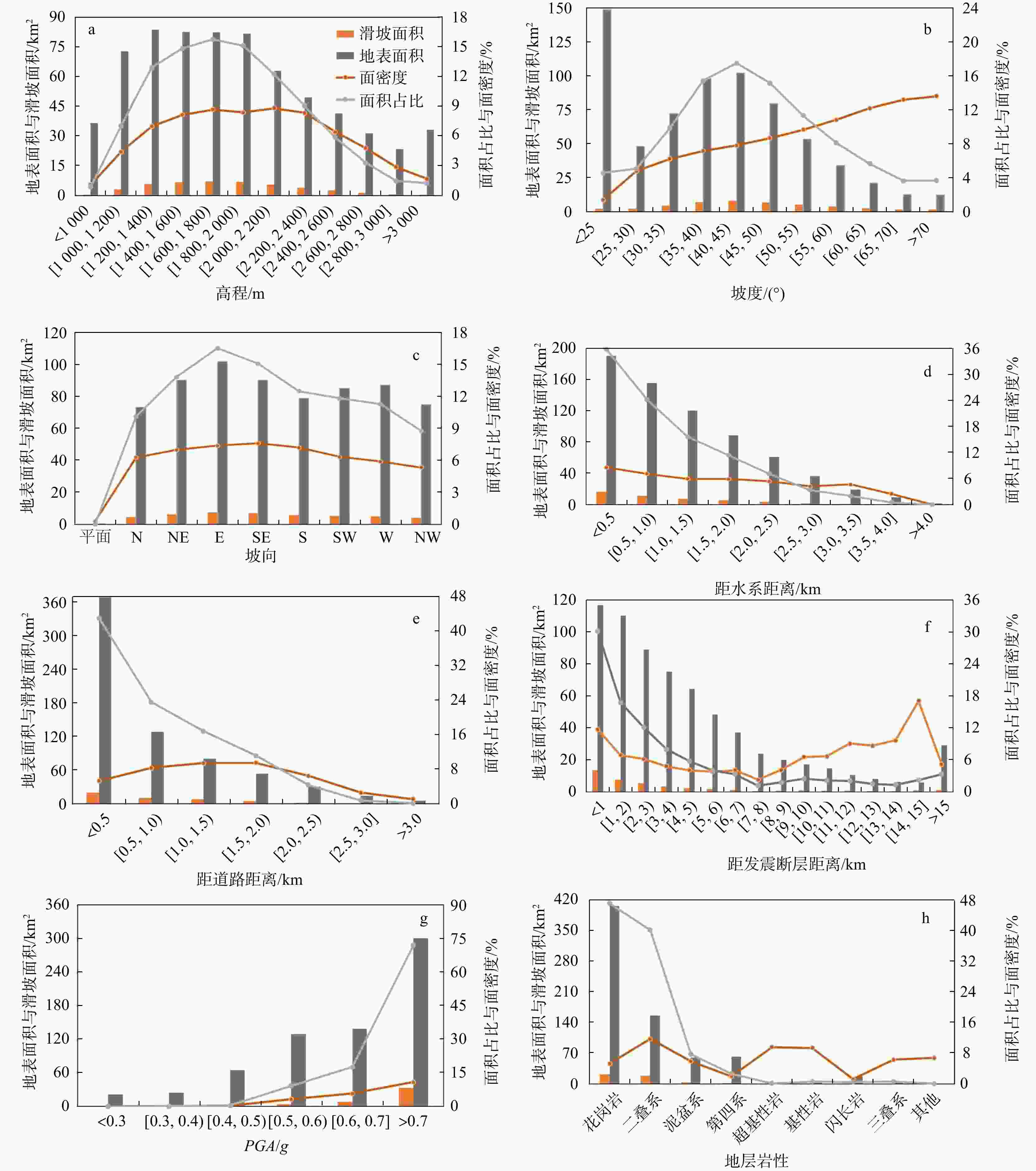 9248 landslides, covering an area of approximately 680 km2, with the majority classified as small- to medium-sized. The highest landslide density was observed at the tectonic intersection of the Xianshuihe fault, Daduhe fault, and Jinping mountain fault. The cumulative landslide area reached approximately 45.57 km2, with an average landslide area of4941 m2. ② The spatial distribution of landslide in the earthquake-affected region is predominantly controlled byPGA and fault structures, with the majority of landslides concentrated in areas wherePGA exceeds 0.6g and within 1 km on either side of the seismogenic fault. Furthermore, landslide occurrence exhibits a negative correlation with proximity to water systems and roads. At a local scale, topographic factors significantly influence landslide distribution, with the highest frequency observed at elevations ranging from1200 to2400 m, on slopes inclined between 30° and 60°, and predominantly facing east or southeast. Additionally, landslides are more prevalent in areas underlain by hard rock strata. ③ The number and area of landslides exhibit an exponential relationship with the magnitude of the Luding earthquake. Leveraging high-precision data, our analysis identified a significantly higher number of earthquake-induced landslides compared to previous studies, with a reduced minimum landslide area and an increased total affected area.Conclusion The findings of this study have been implemented to support post-disaster recovery and reconstruction efforts in the Luding earthquake-affected region, providing a scientific basis for enhancing resilience and reducing future earthquake risks.