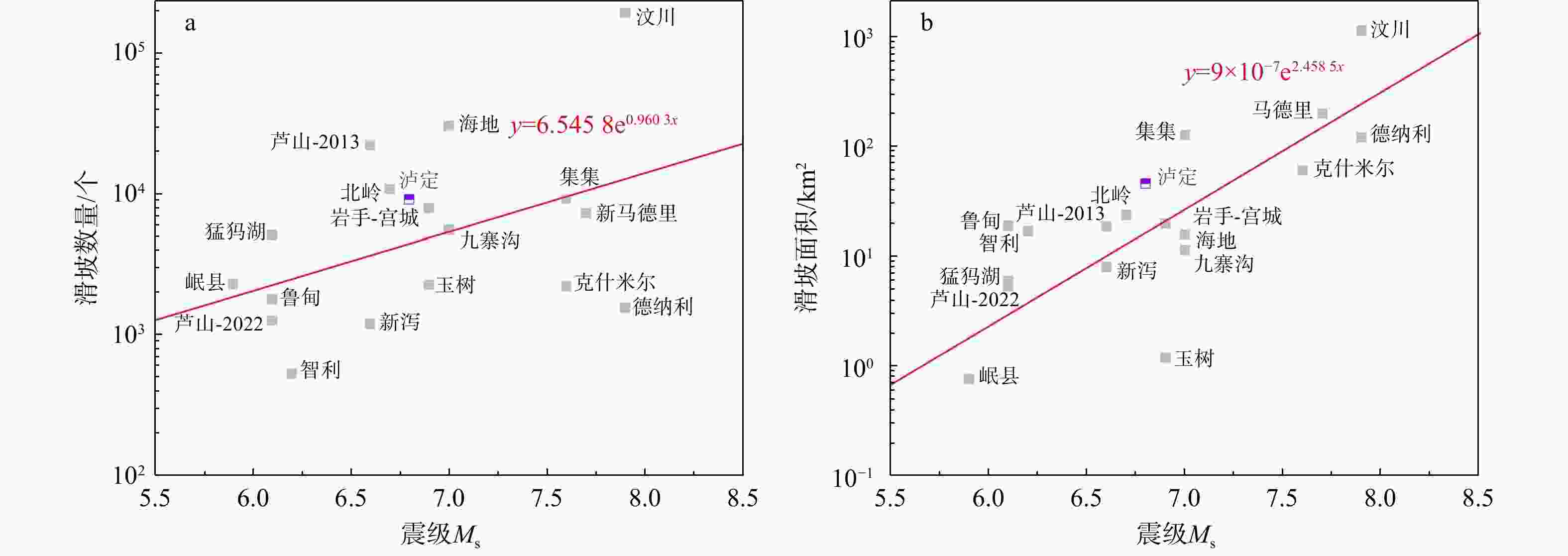M s 6.8级地震为例,首先基于获取得到的震后0.2 m分辨率光学影像(digital orthophoto map,简称DOM)和0.5 m分辨率的数字高程模型(digital elevation matrix,简称DEM),采用人工目视三维遥感解译地震诱发滑坡,再结合野外调查修正,确定最终地震诱发滑坡数量,并在此基础上分析地震诱发滑坡分布与地形地貌、地质构造、地震因子等地质背景的关系。结果表明:①此次泸定地震事件在约680 km2的研究区内引发了9248 处滑坡,且以中、小型滑坡为主,滑坡面积密度最高集中在鲜水河断裂、大渡河断裂以及锦屏山断裂3条断裂交汇处;滑坡总面积约45.57 km2,平均滑坡面积可达4941 m2。②本次地震滑坡分布主要受地面峰值加速度PGA 以及断裂构造影响,多分布在PGA > 0.6g (g 为重力加速度),距发震断裂两侧1 km范围内;此外滑坡的发育还与距水系及道路距离呈负相关;局部受地形因素影响滑坡主要发育在高程1200 ~2400 m、坡度30°~60°、坡向E及SE向区域,且地层岩性多为硬岩。③此次泸定地震的滑坡数量及面积与震级关系也遵循指数分布;同时由于此次解译基础数据精度较高,解译得到的地震滑坡数量相比于其他文献而言更多,最小面积更小,总面积更大。本研究成果已应用于泸定地震灾区的灾后恢复重建工作,为提高抗灾能力和降低地震风险提供了科学依据。Abstract:Objective The spatial distribution analysis of earthquake-induced landslides offers critical insights for identifying potential geological disasters in affected regions, which is fundamental for informing post-disaster reconstruction planning, relocation strategies, site selection processes, and the development of effective geological disaster mitigation measures.