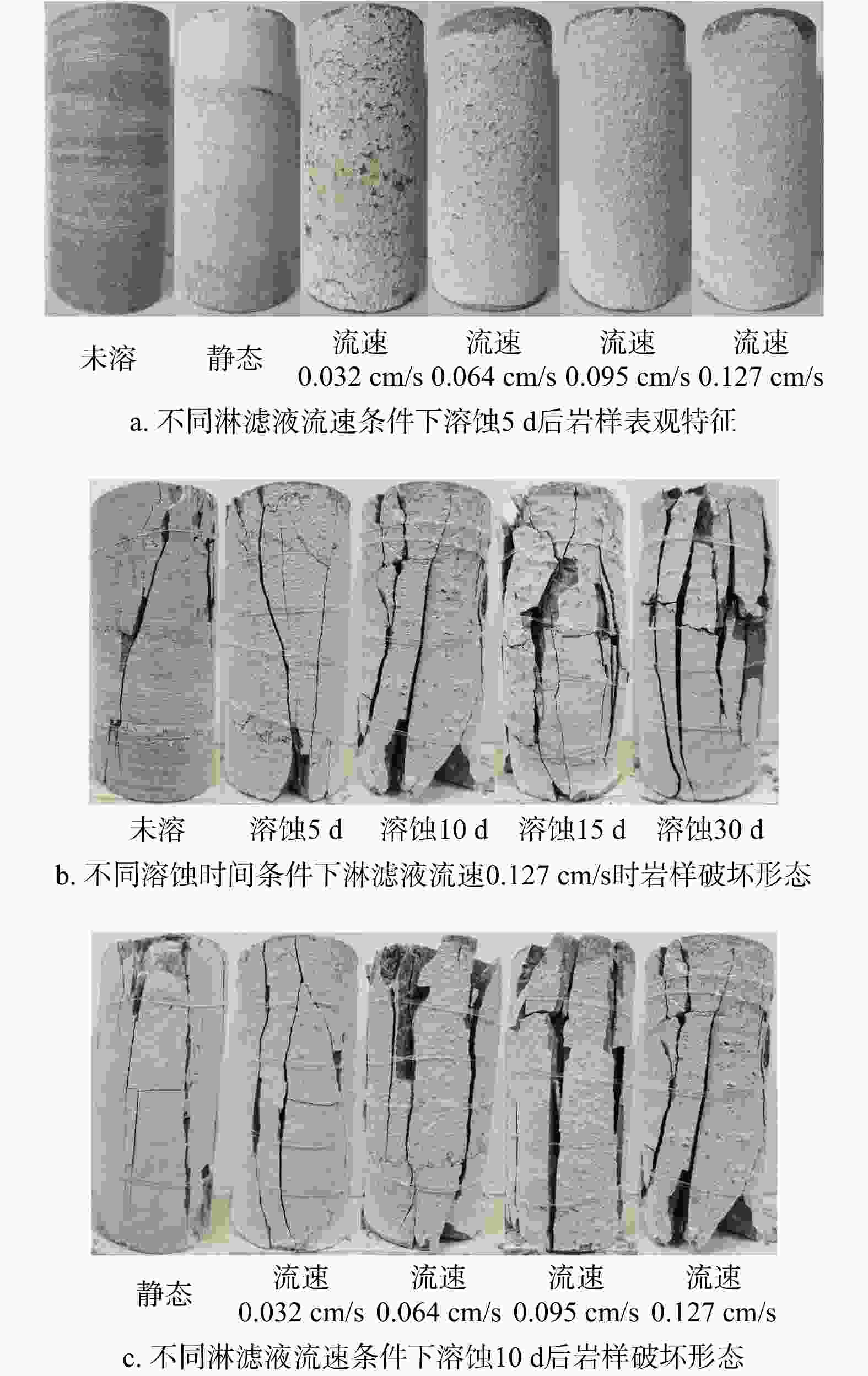 图 2  岩样在不同溶蚀条件下的表观特征(a)与破坏形态(b,c)