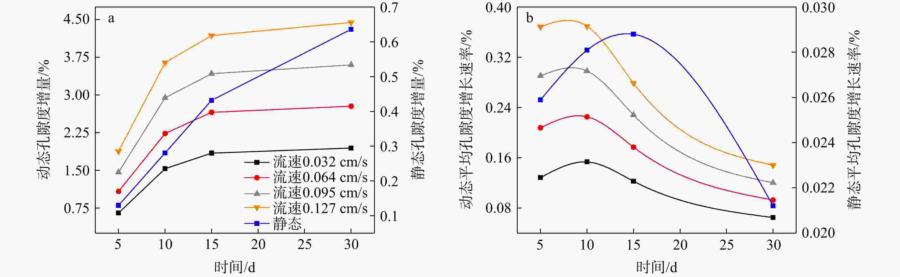 Figure 4.  Variation characteristics of porosity increment (a) and average porosity growth rate (b)