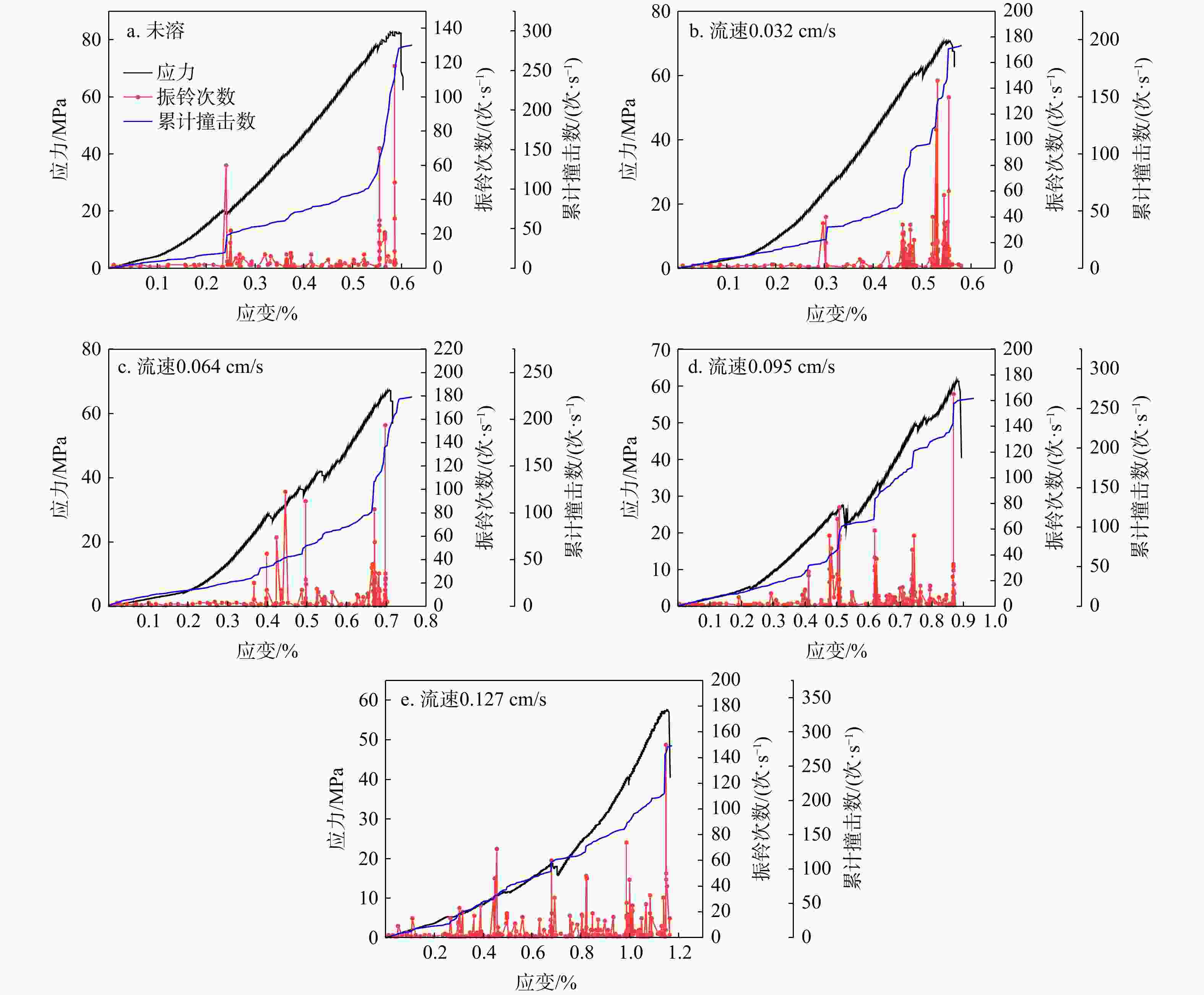图 8  不同淋滤液流速下未溶及溶蚀5 d时应力−应变−声发射计数图