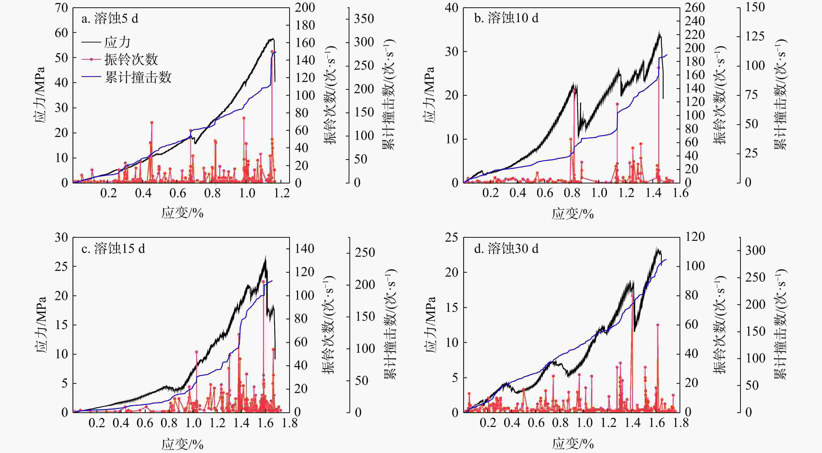 Figure 9.  Stress-strain curves and cumulative acoustic emission curves of samples at a acidic leachate flow rate of 0.127 cm/s under different dissolution time