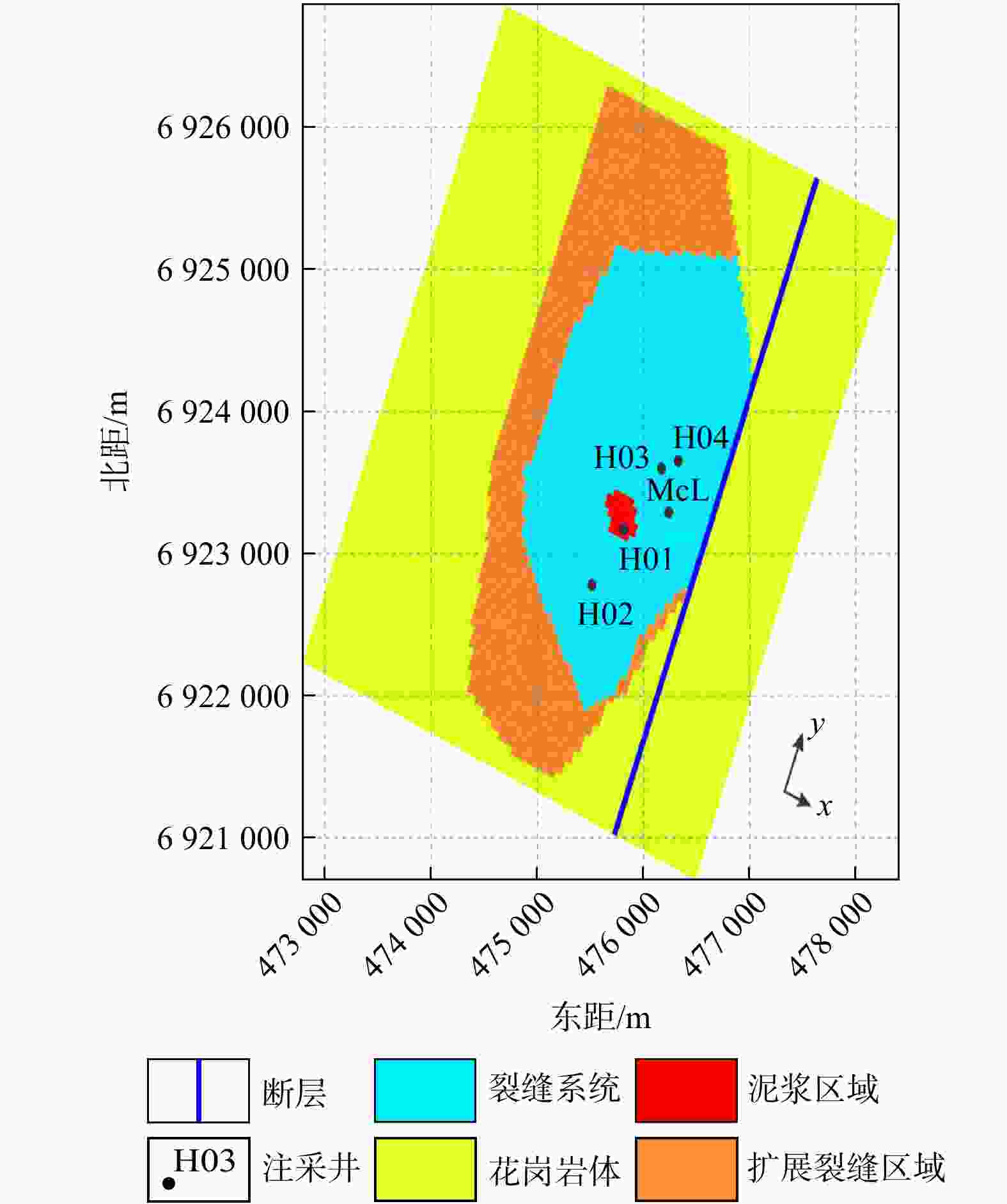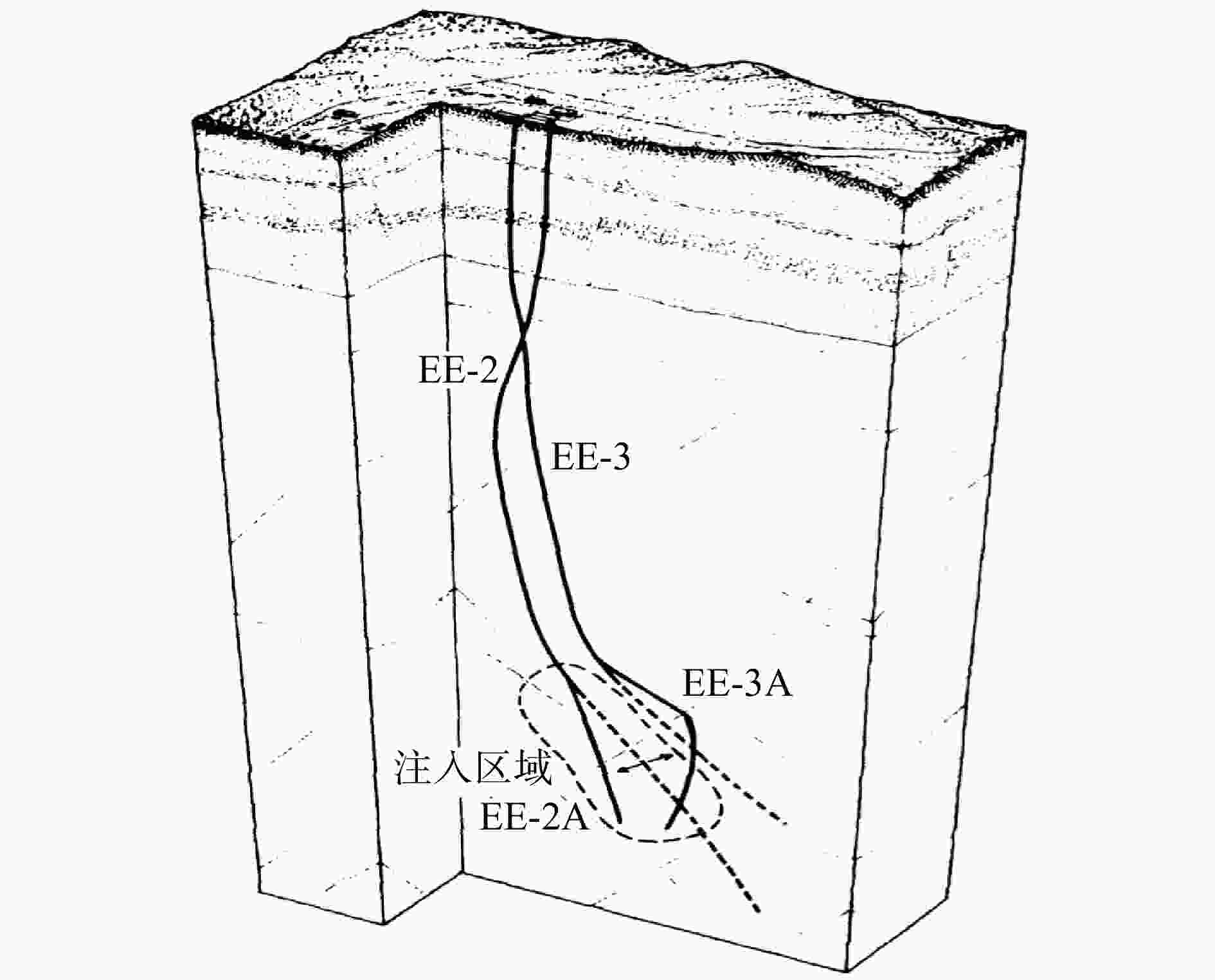 EE-2,EE-3,EE-2A和EE-3A均为注采井,其中EE-2A和EE-3A分别为在EE-2和EE-3基础上侧钻的井(原因是原井连通不佳,因此改变井轨迹去增大连通概率);黑色虚线圈闭范围为注入区域;黑色箭头为注入流体的流动方向;黑色实线为侧钻井轨迹;黑色虚线为原井轨迹
