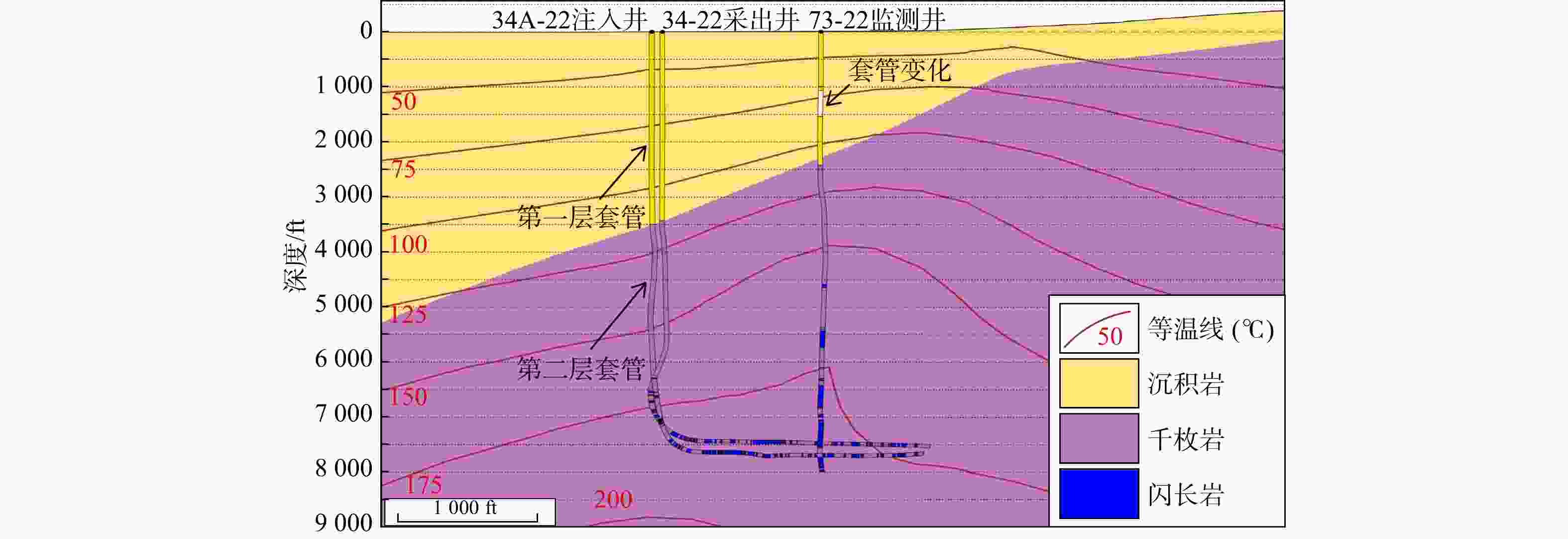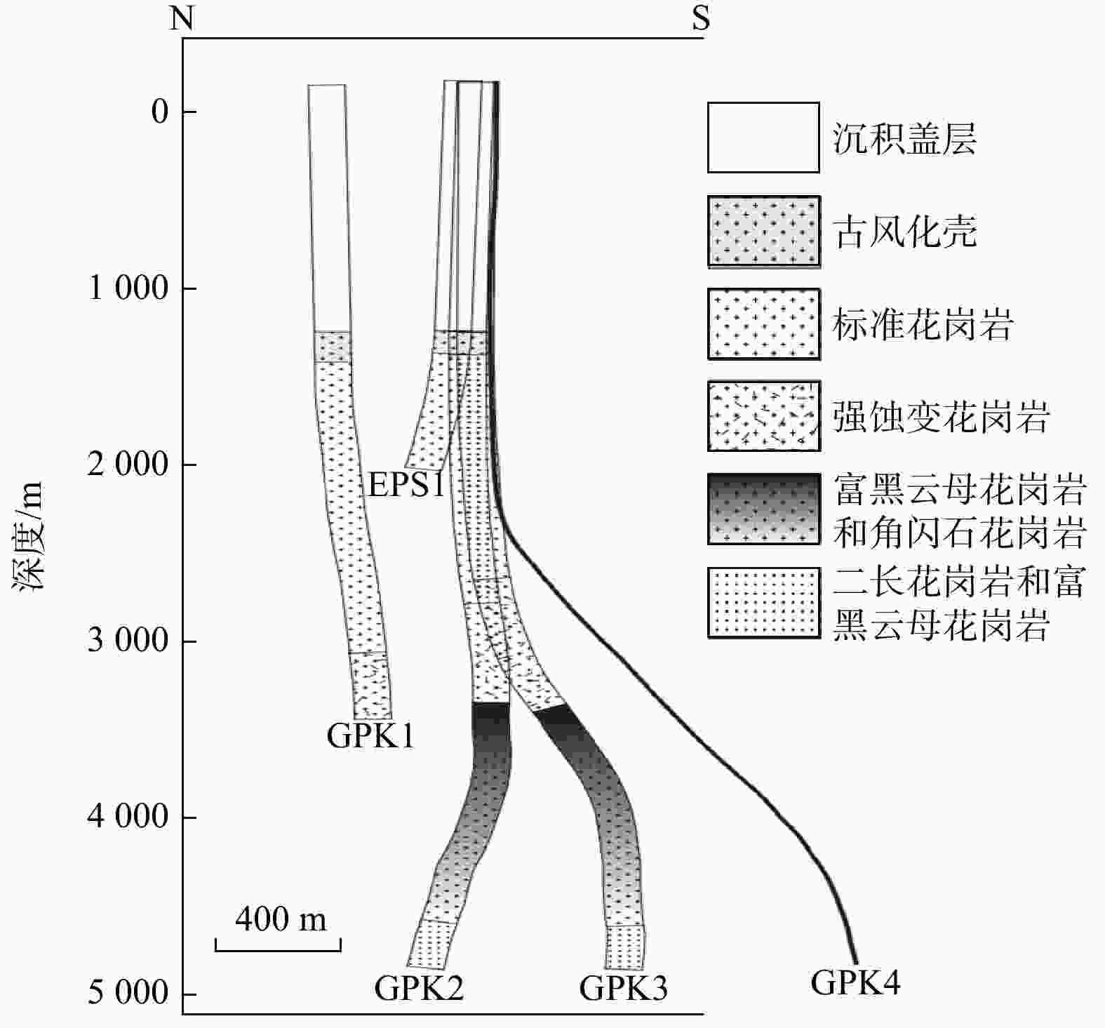 HDR-2和HDR-3均为生产井;SKG-2和HDR-1均为注水井;HDR-2A为HDR-2的加深井(1994年HDR-2堵塞深度约为1600 m,然后加深至2303 m);黑色垂直带为井套管;白色垂直区域为无套管井筒。