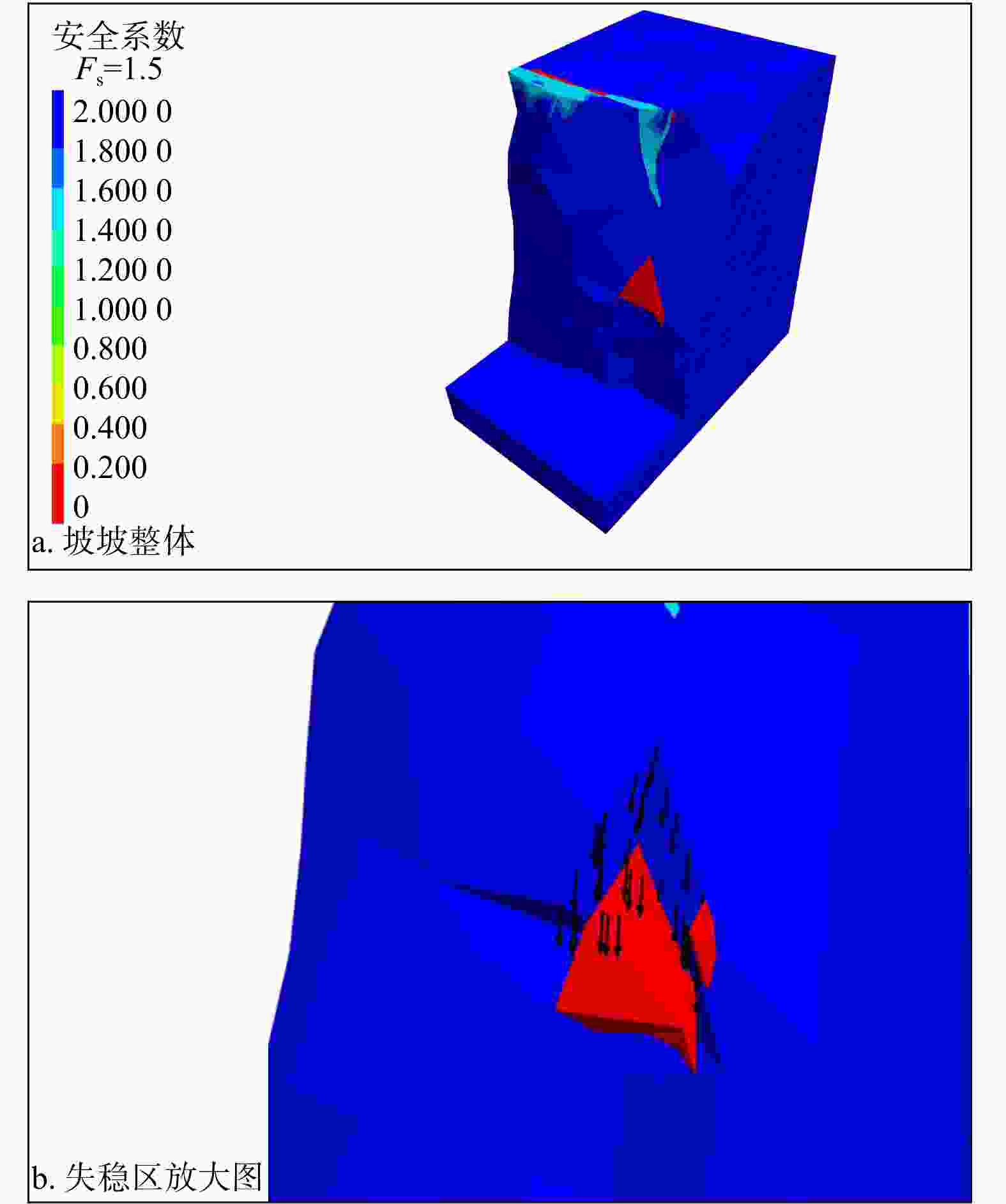 Results Under gravity conditions, the safety factor of the entire slope was approximately 1.5. The dangerous rock mass protruding from the slope crest exhibited significant vertical displacement and a low safety factor, indicating a potential instability zone.