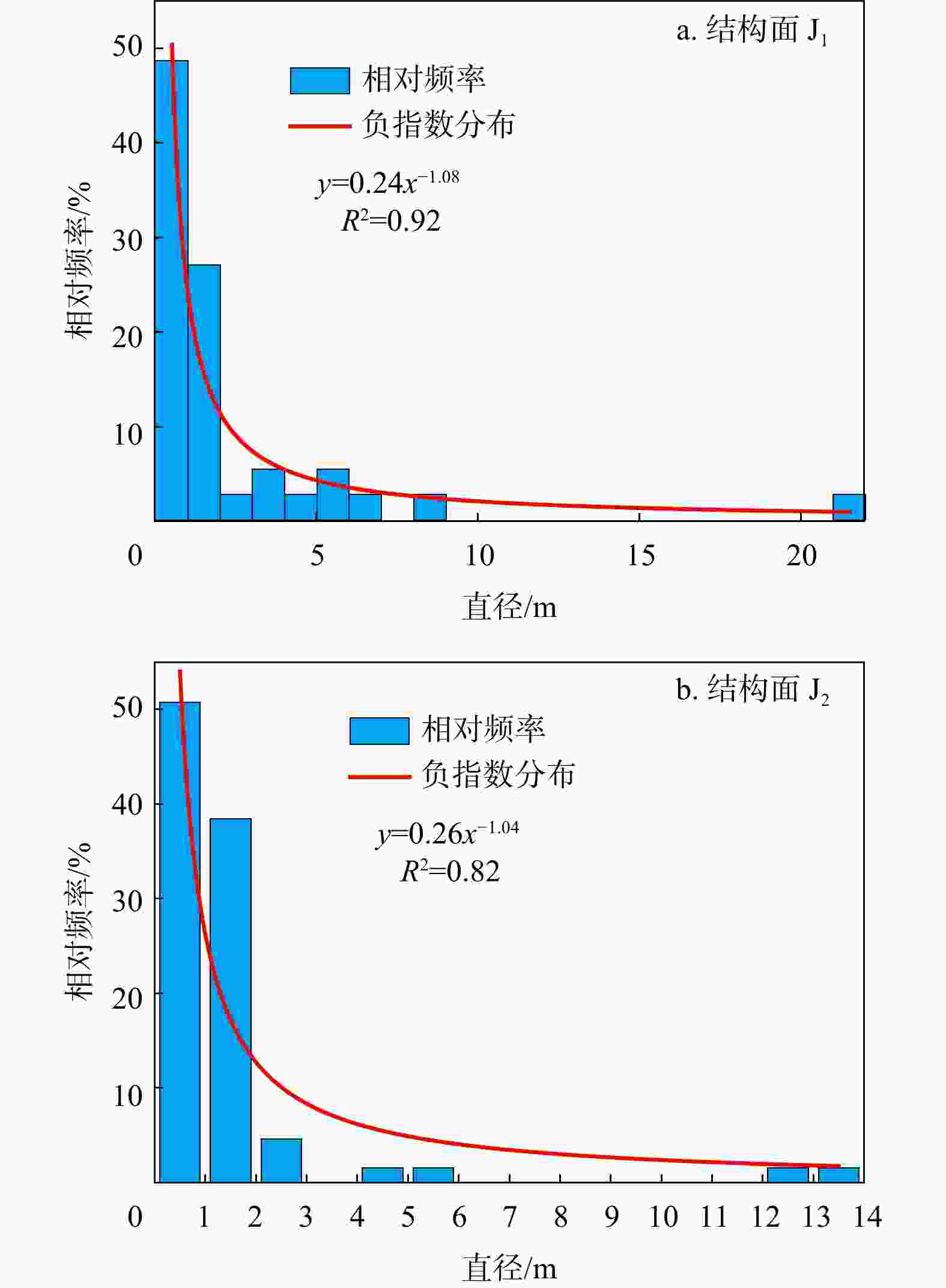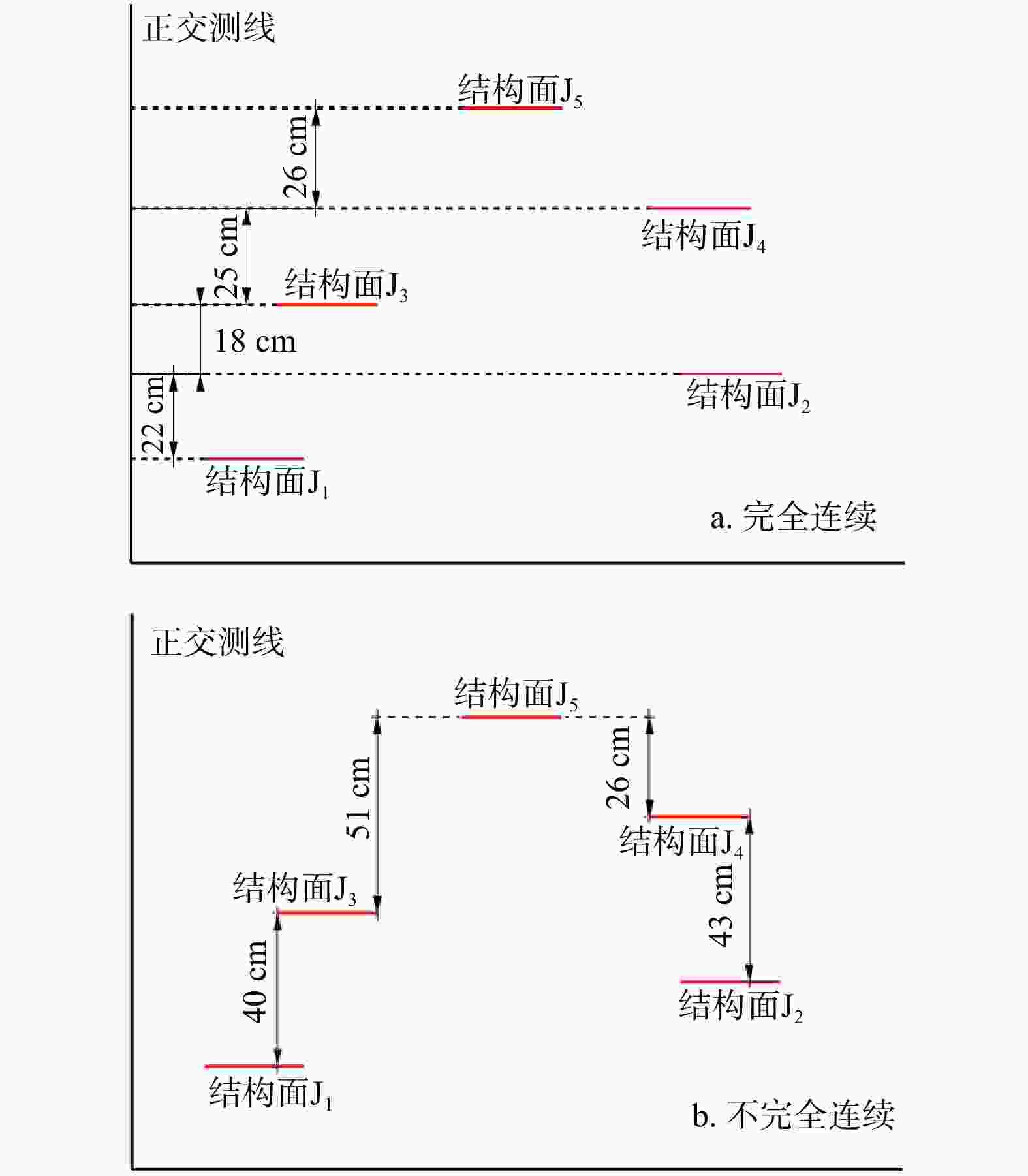 结构面组号 倾向/(°) 倾角/(°) 点云数量百分比/% J1 184.7 79.8 51.32 J2 126.6 85.1 34.48 J3 305.0 41.0 0.87 J4 41.9 62.5 3.26 表 2 结构面法向间距