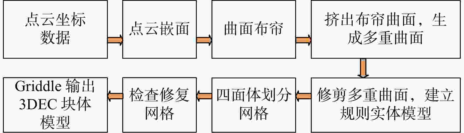 Methods 3D point cloud data of a highly steep rock slope were acquired via 3D laser scanning technology. After filtering and preprocessing of the point cloud data, the open-source program Discontinuity Set Extractor (DSE) was used to semiautomatically recognize and classify the point cloud data, obtaining key parameters and clustering information of the structural planes of the rock slopes, such as occurrence, trace length, and spacing. By fitting the point cloud clustering information, a probability distribution model was created, and a discrete fracture network (DFN) model was constructed. Furthermore, a 3D block discrete element model of the highly steep slope was developed via the "Rhino-Griddle-3DEC" integrated modeling method, which is based on the point cloud data. The model was used to investigate the stability of the slope and potential failure areas.