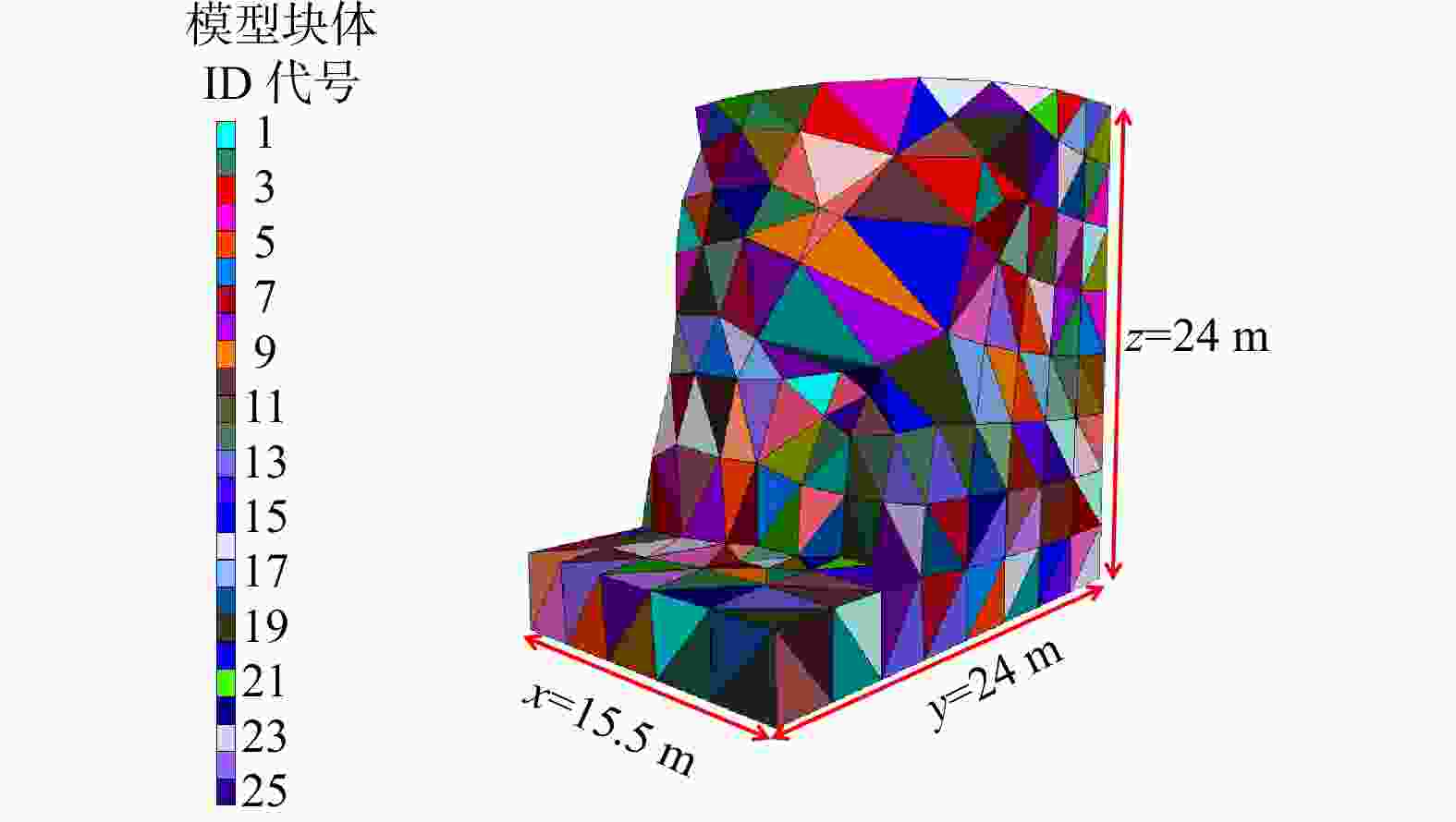优势结构面组号 属性 分布 参数 J1 产状 F分布 倾向:184.7°,倾角:79.8°,K=100 位置 随机分布 在空间中均匀分布 尺寸 负指数分布 指数:1.08,尺寸范围:0.5~21 m 密度 P10 0.21 J2 产状 F分布 倾向:126.6°,倾角:85.1°,K=100 位置 随机分布 在空间中均匀分布 尺寸 负指数分布 指数:1.04,尺寸范围:0.5~13 m 密度 P10 0.11 表 4 岩块和结构面物理力学参数