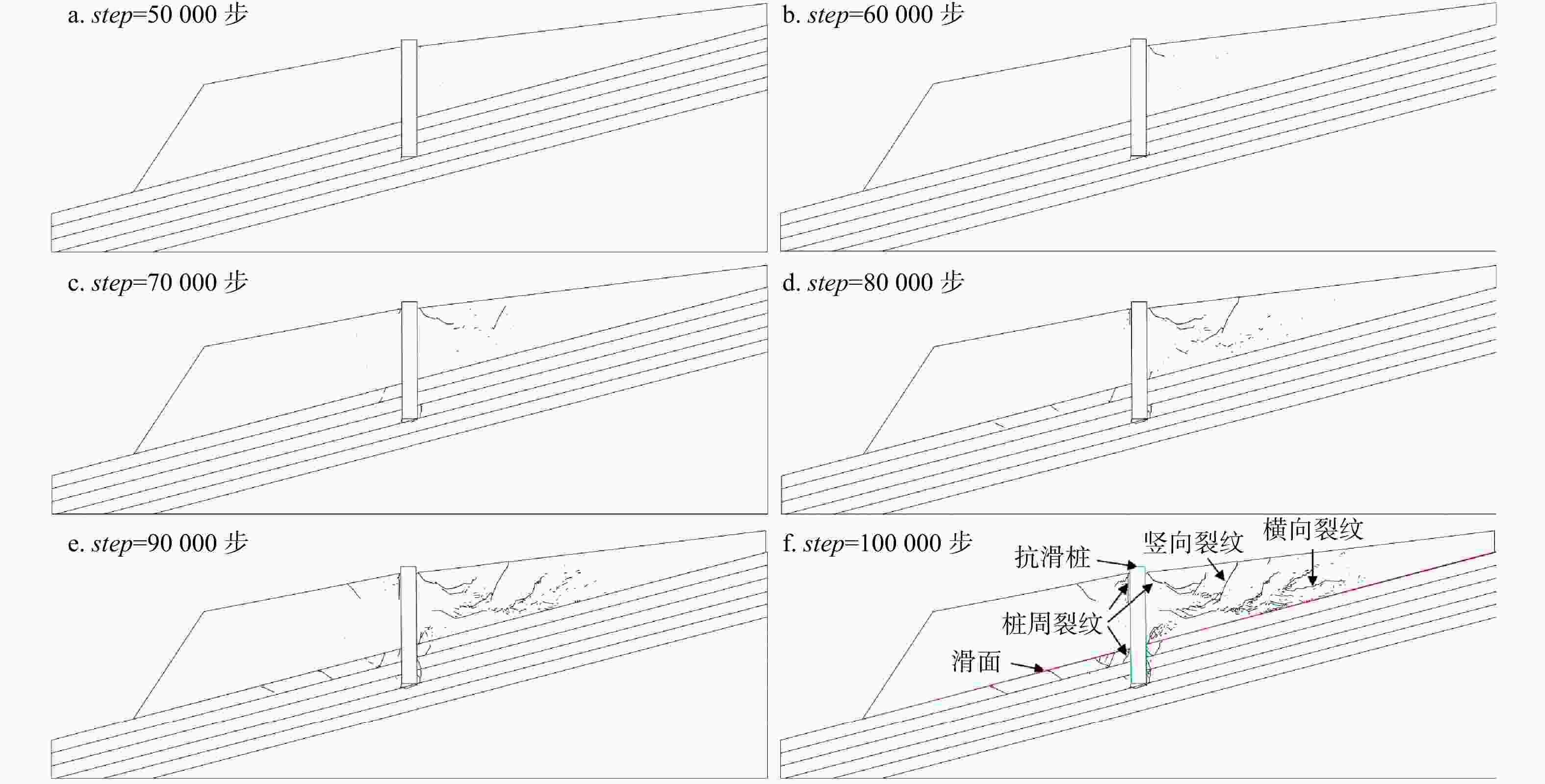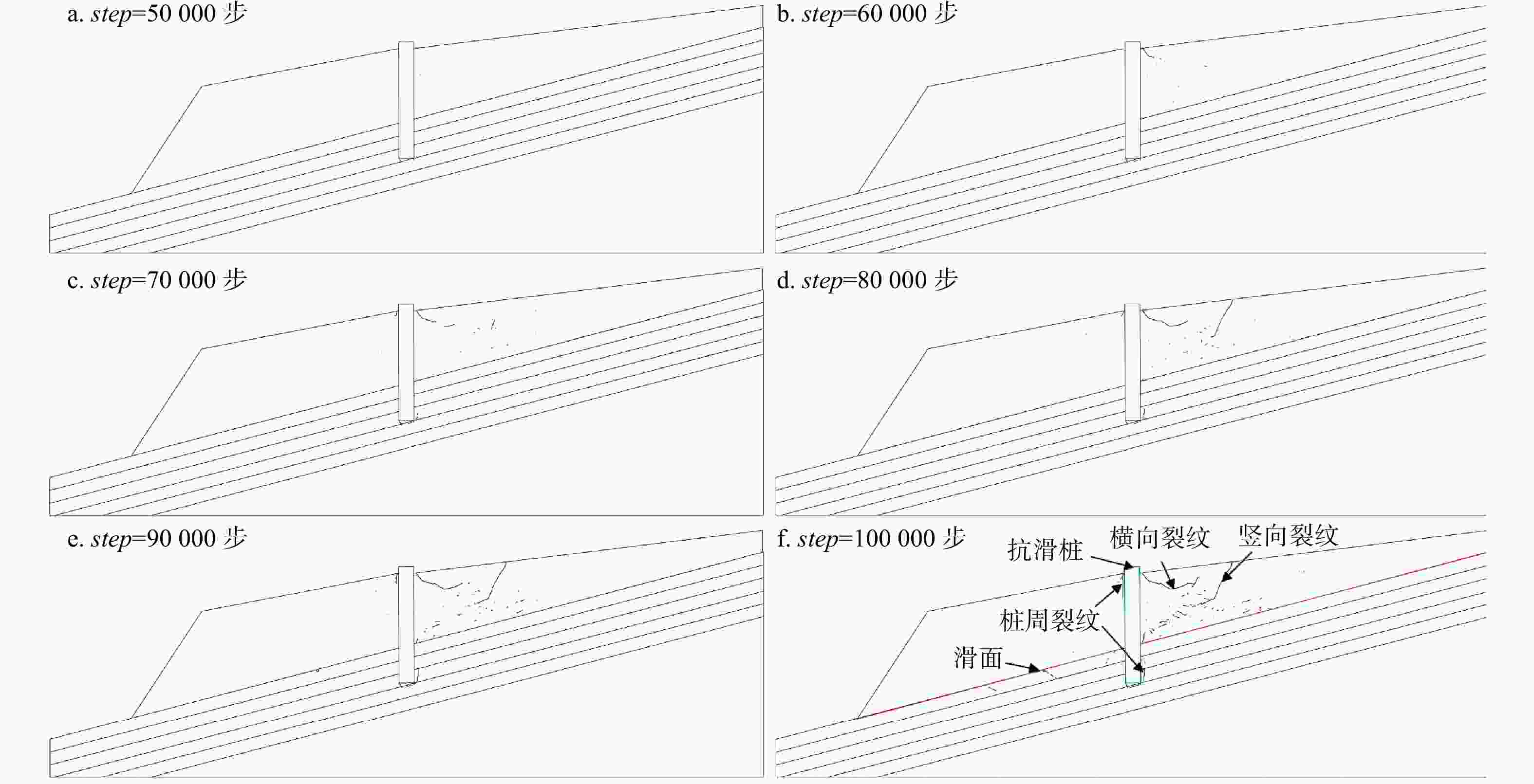 图 9  天然条件下滑坡裂纹动态演化过程(step. 模拟运算的步数,下同)