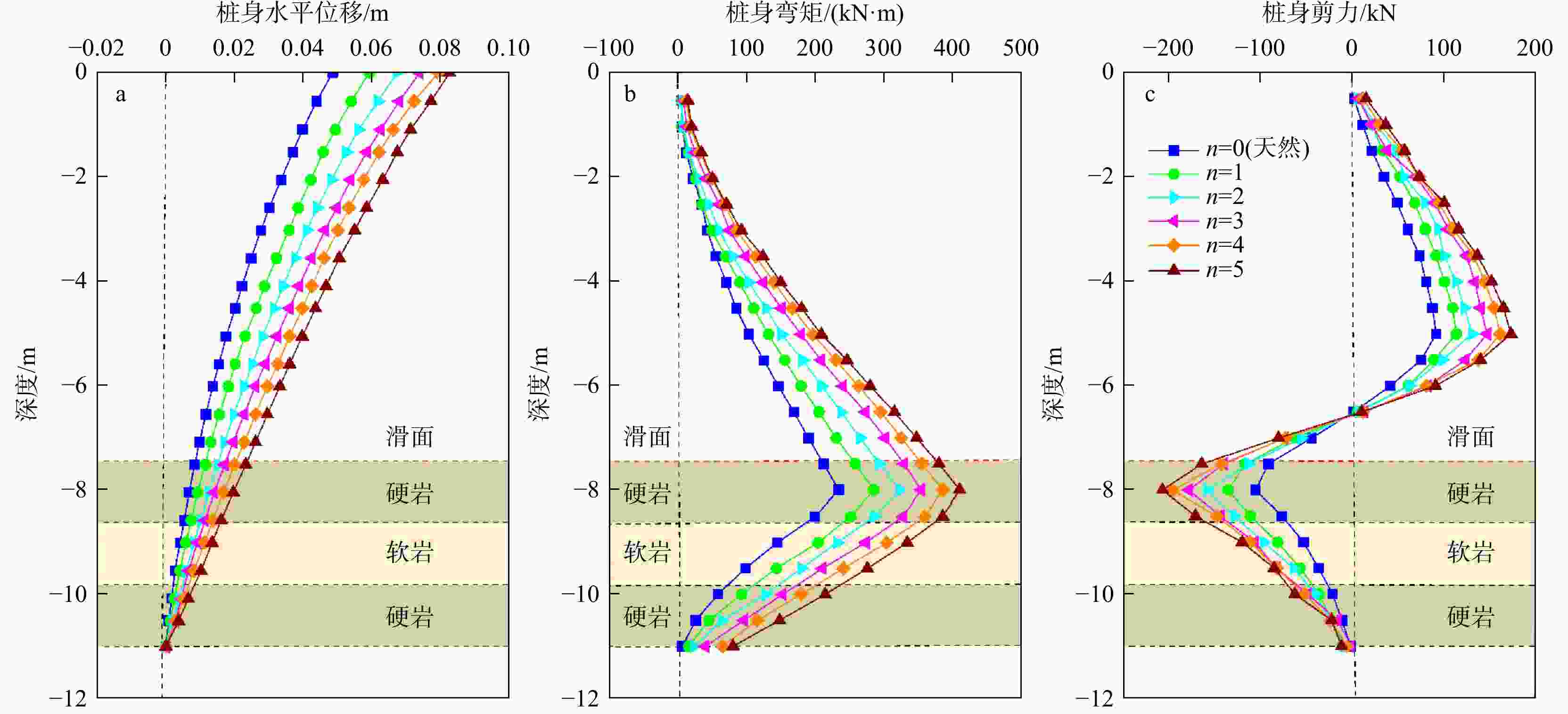图 12  不同干湿循环作用下桩身水平位移(a)、弯矩(b)和剪力(c)分布情况