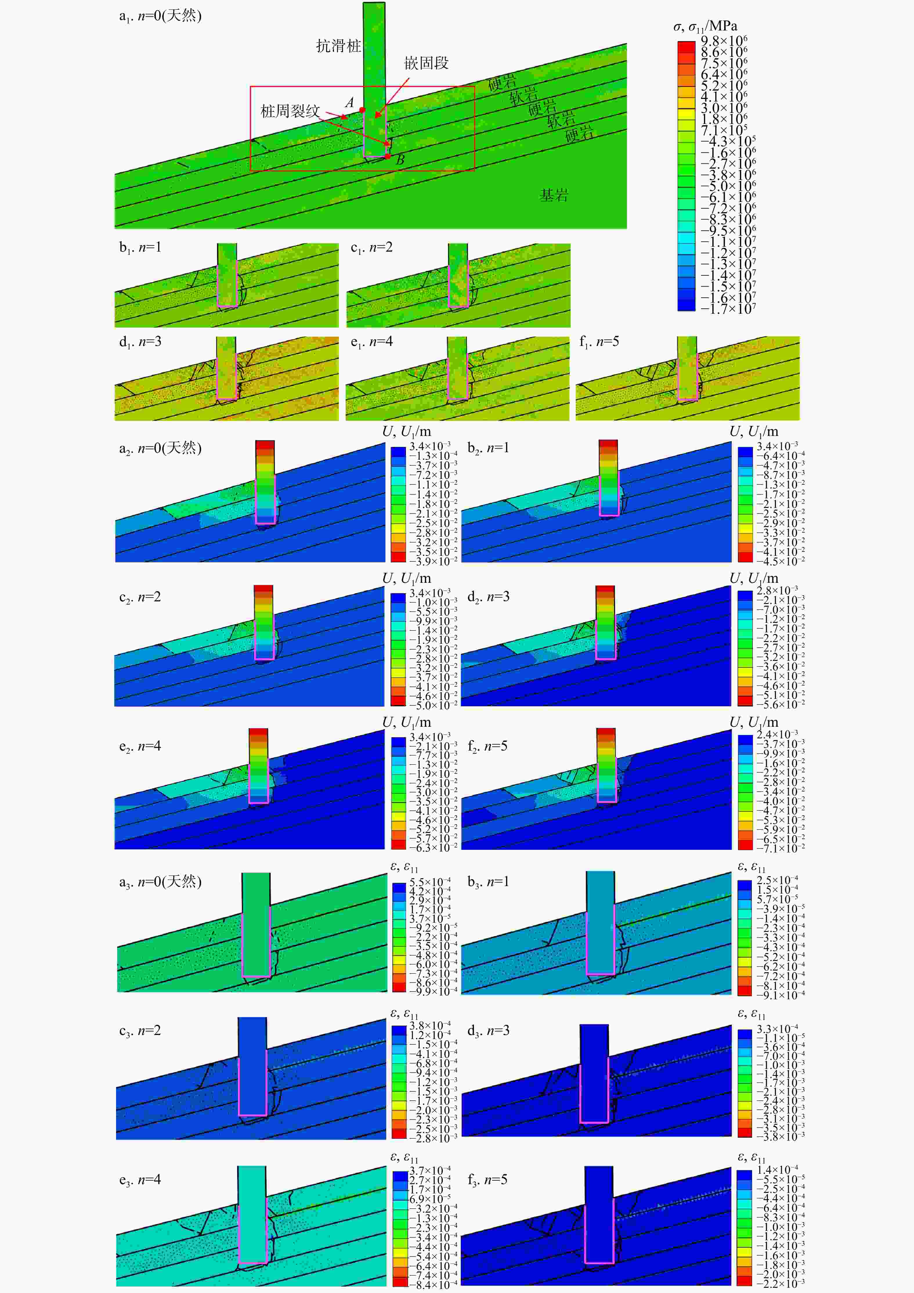 图 13  不同干湿循环作用下桩身嵌固段软硬相间地层的应力(a1~f1)、位移(a2~f2)和应变(a3~f3)分布云图(σ. 应力;σ11. x方向应力;A. 桩前侧基岩顶面应力点;B. 桩底后侧基岩应力点;下同)
