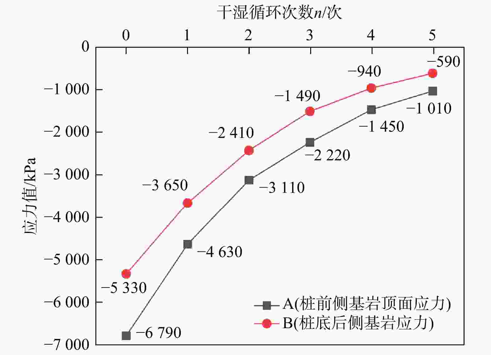 Figure 14.  Stress values at A and B points under different wetting-drying cycles