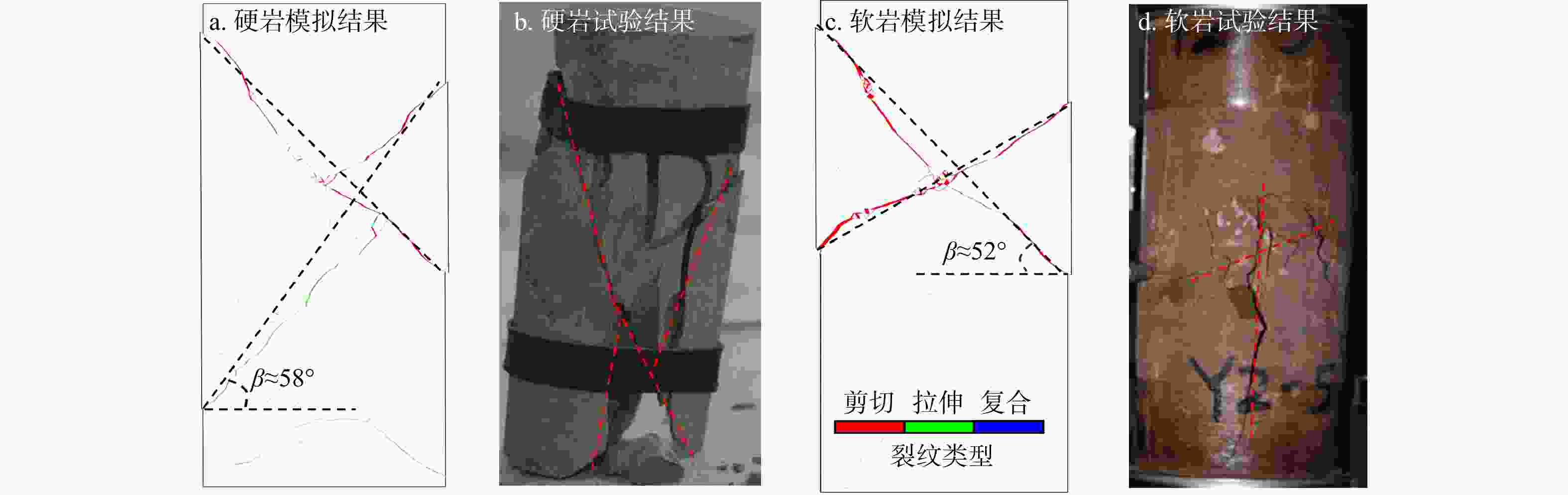 图 3  单轴压缩模拟和试验结果(β. 剪切面破裂角)
