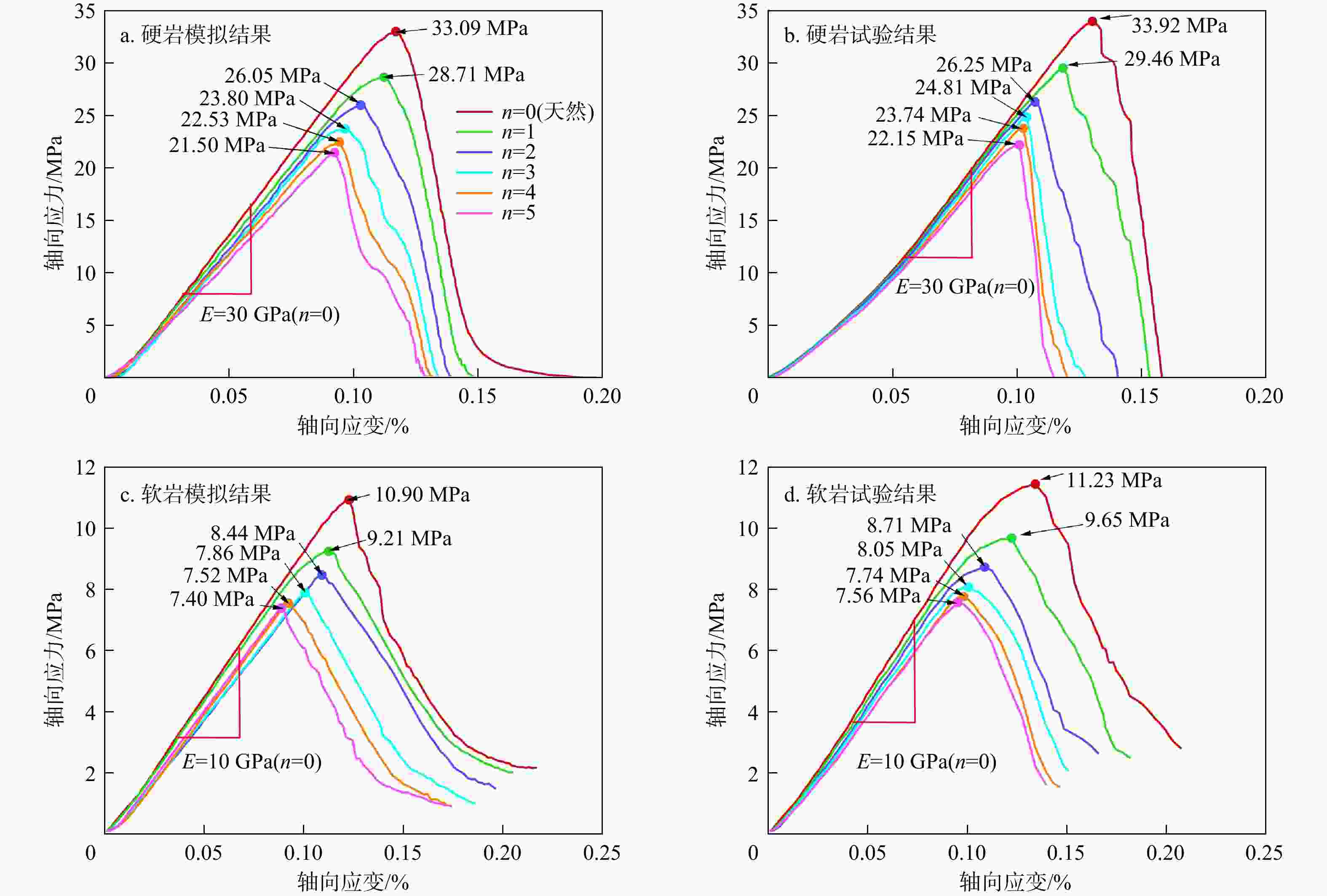 图 4  不同干湿循环作用下单轴压缩结果的应力−应变曲线(E. 弹性模量;n. 干湿循环次数;下同)