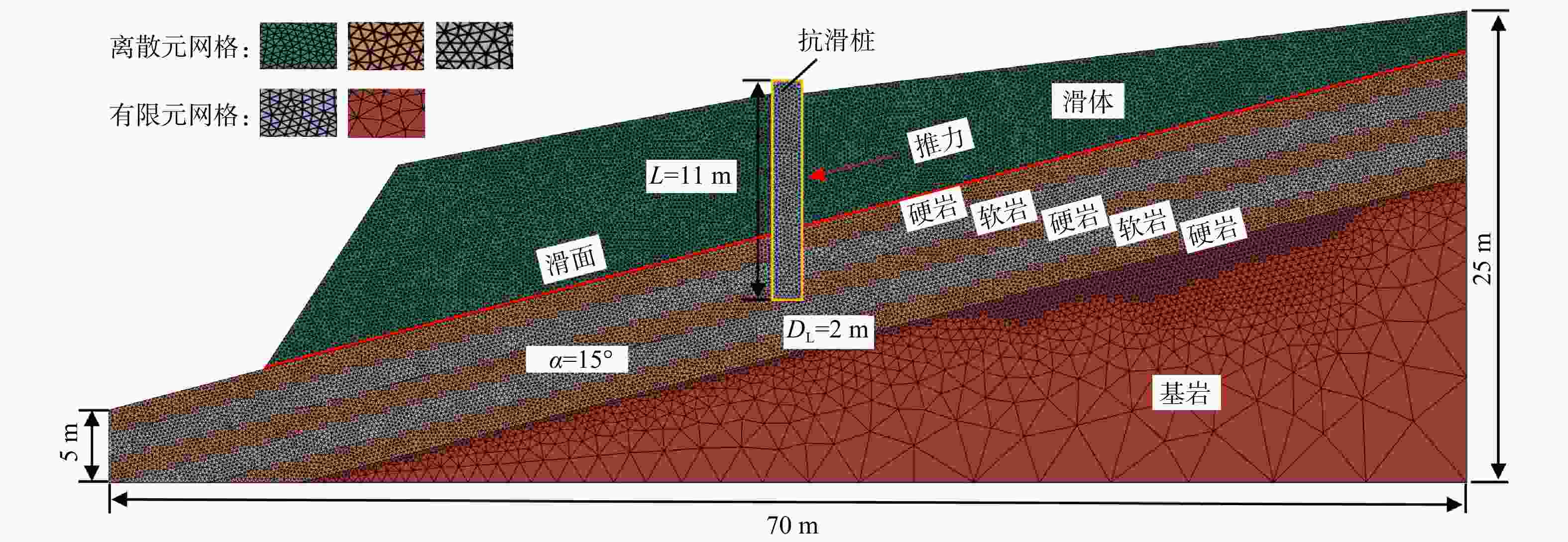 图 6  滑坡−抗滑桩体系有限−离散元法(FDEM)数值计算模型
