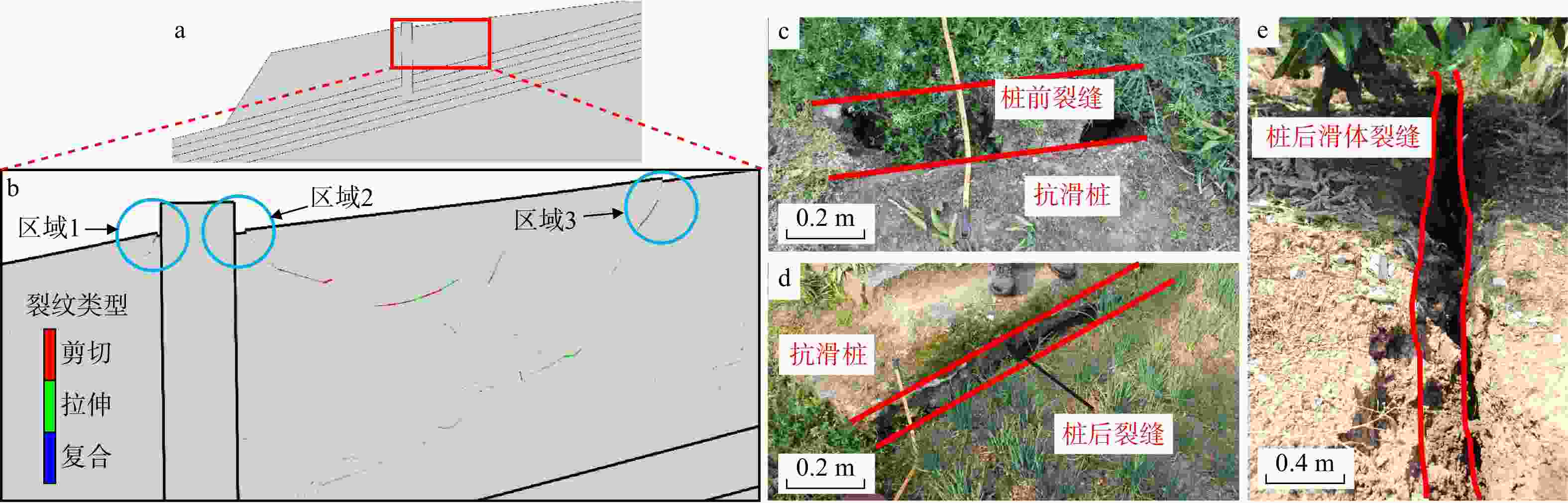 a. 模型整体裂纹分布图; b. 模型局部裂纹分布图; c~e. 现场裂缝图,分别对应b图中区域1、区域2、区域3的模拟裂纹