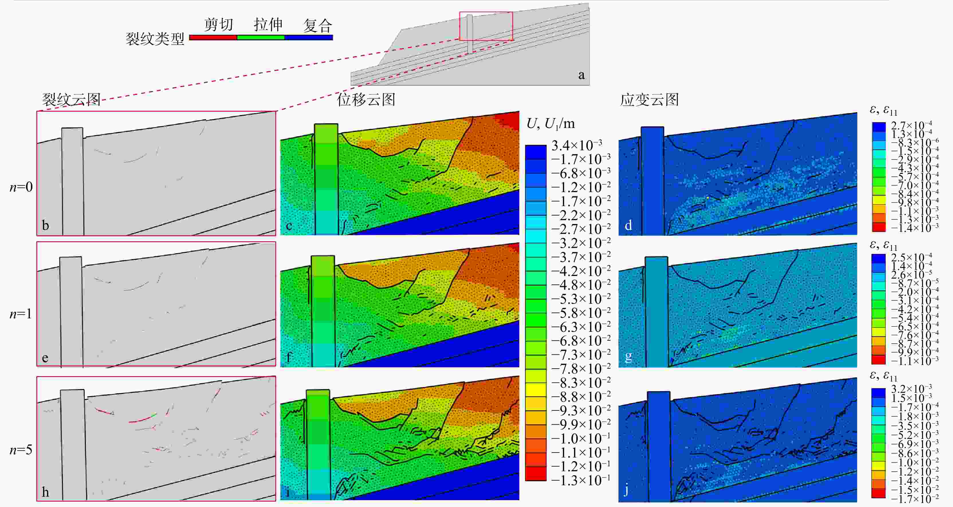 a. 模型整体裂纹分布图;b,e,h. 分别为n=0,1,5时的裂纹云图;c,f,i. 分别为n=0,1,5时的位移云图;d,g,j分别为n=0,1,5时的应变云图. U. 位移;U1. x方向位移;ε. 应变;ε11. x方向应变;下同
