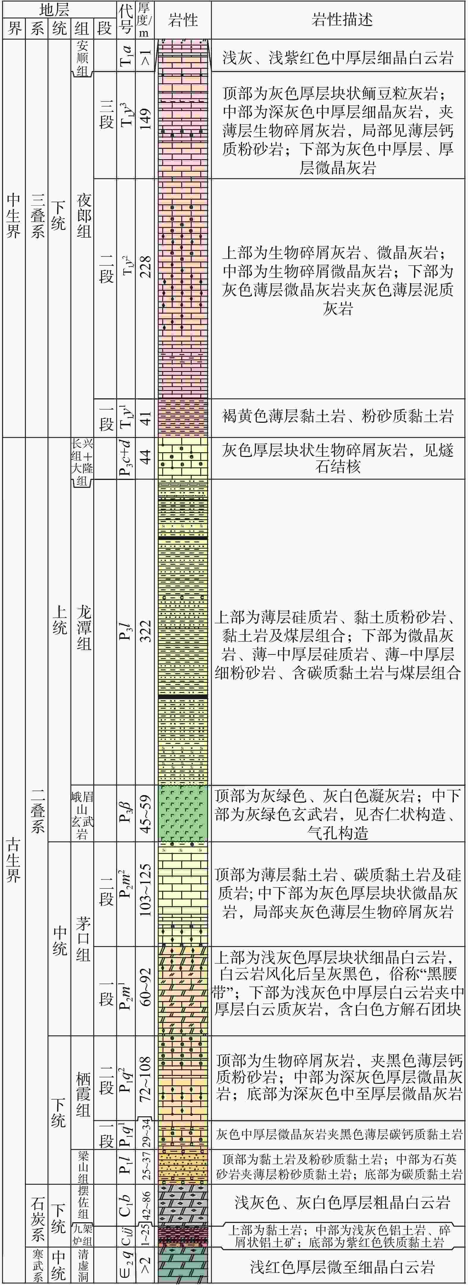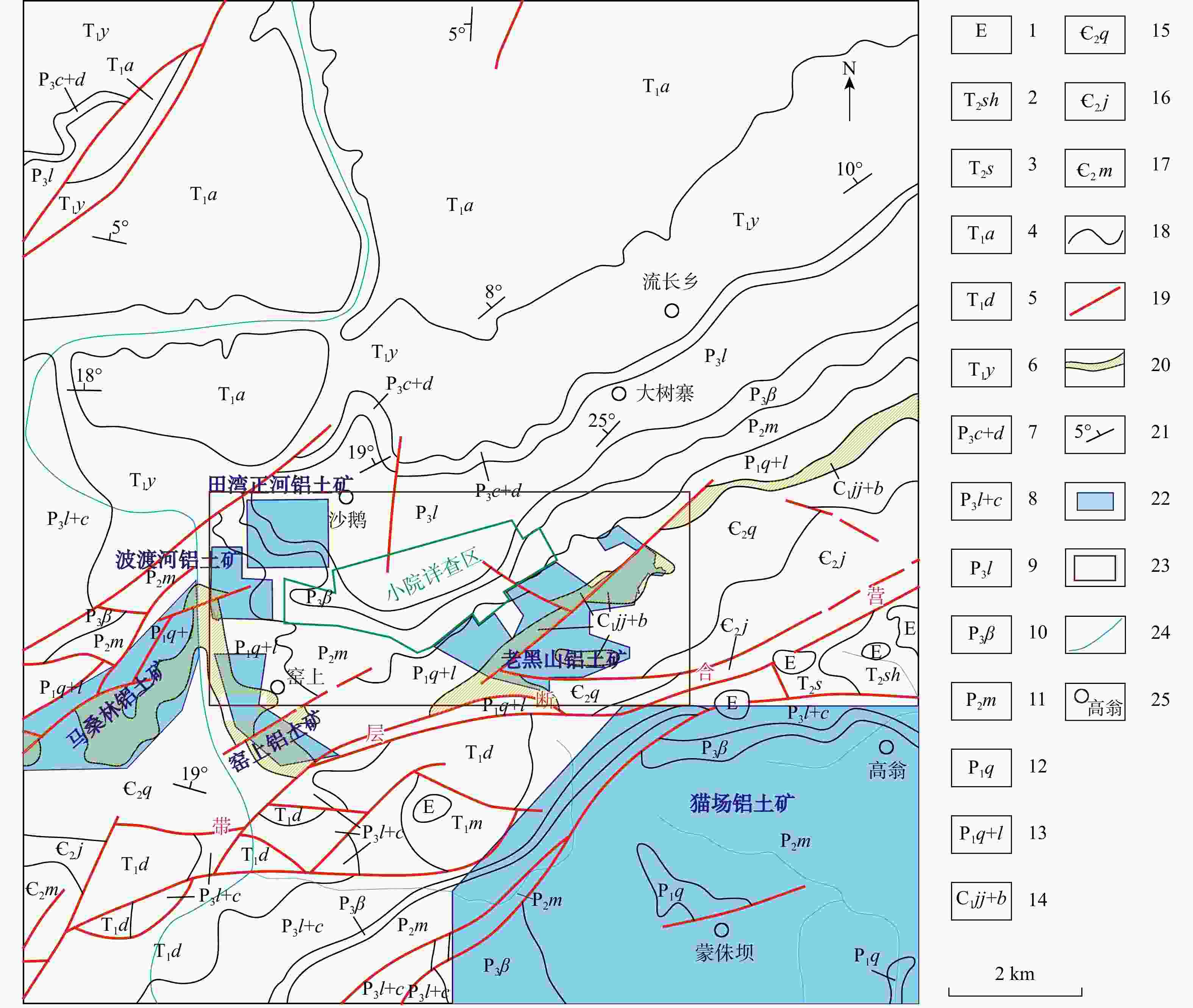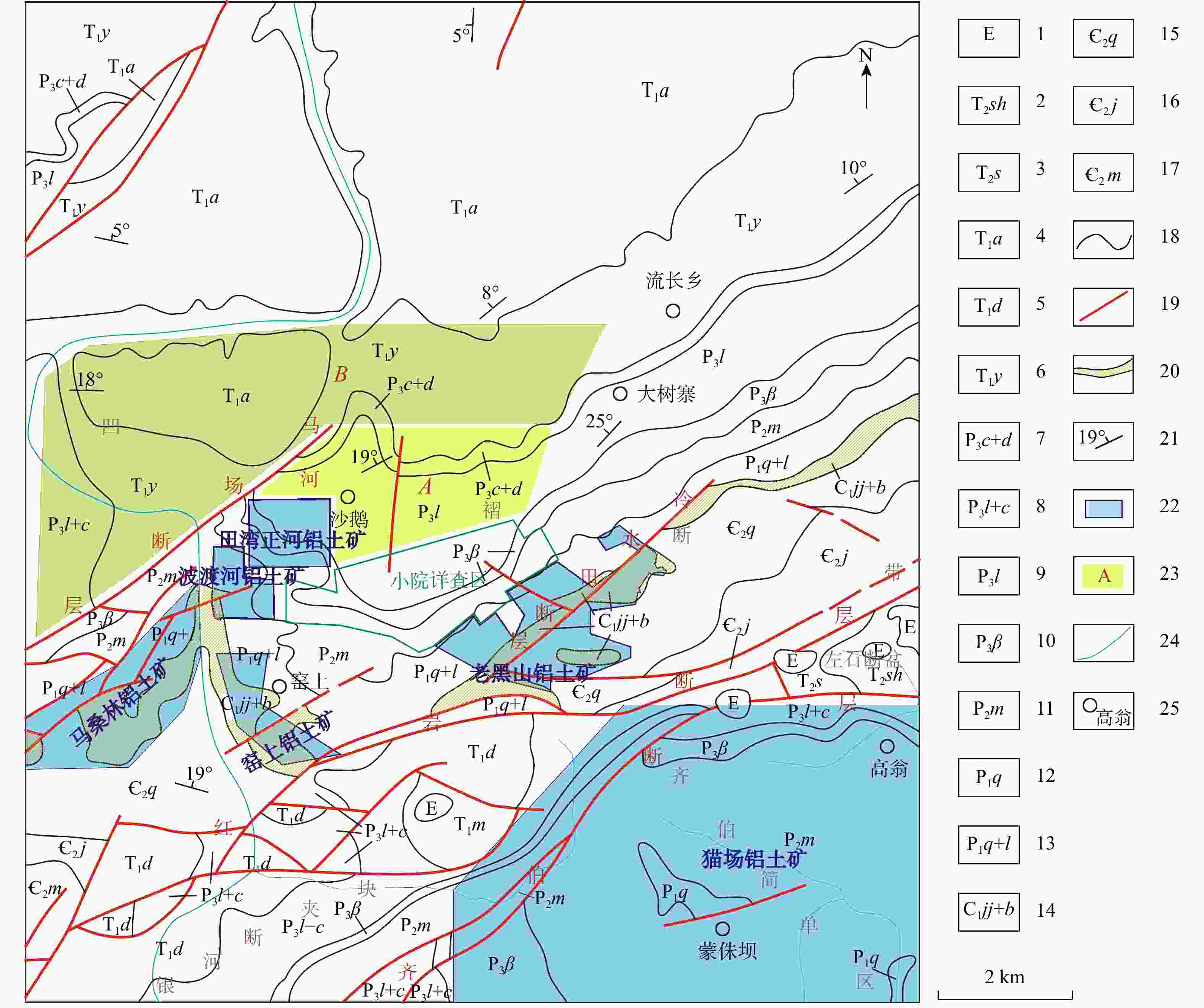 1. 古近系;2. 中三叠统狮子山组;3. 中三叠统松子坎组;4. 下三叠统安顺组;5. 下三叠统大冶组;6. 下三叠统夜郎组;7. 上二叠统长兴组+大隆组;8. 上二叠统龙潭组+长兴组;9. 上二叠统龙潭组;10. 峨嵋山玄武岩;11. 中二叠统茅口组;12. 下二叠统栖霞组;13. 下二叠统栖霞组+梁山组;14. 下石炭统九架炉组+摆佐组;15. 中寒武统清虚洞组;16. 中寒武统金顶山组;17. 中寒武统明心寺组;18. 地层界线;19. 断层;20. 铝土矿系露头;21. 岩层产状;22. 铝土矿区范围;23. 研究区范围;24. 水系;25. 地名