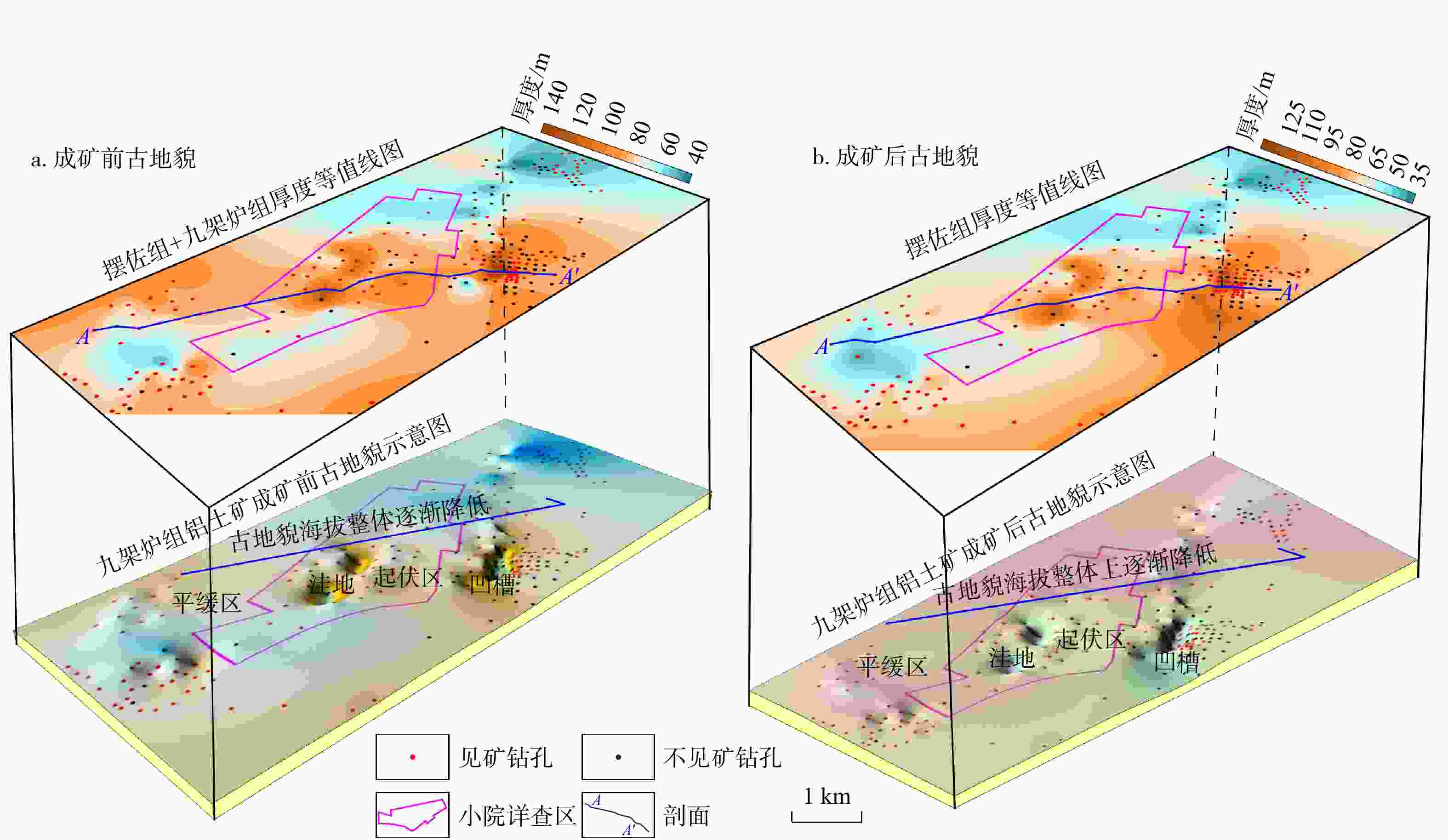 b +jj )厚度、摆佐组(C1b )厚度恢复了九架炉组沉积前后的古地貌特征。结果表明:铝土矿体沿古地貌降低的方向间隔分布,单个矿体的形态受控于洼地、凹陷等具体形状;沿古地貌降低方向上,局部地形较低洼处是铝土矿体形成的有利区域;预测了茶园、十字2个铝土矿找矿远景区。研究成果为后续铝土矿资源勘查提供了参考。Abstract:Ancient karst landforms play a key role in controlling the shape and scale of bauxite deposits, which is of great significance for the planning of engineering layouts in mineral exploration.