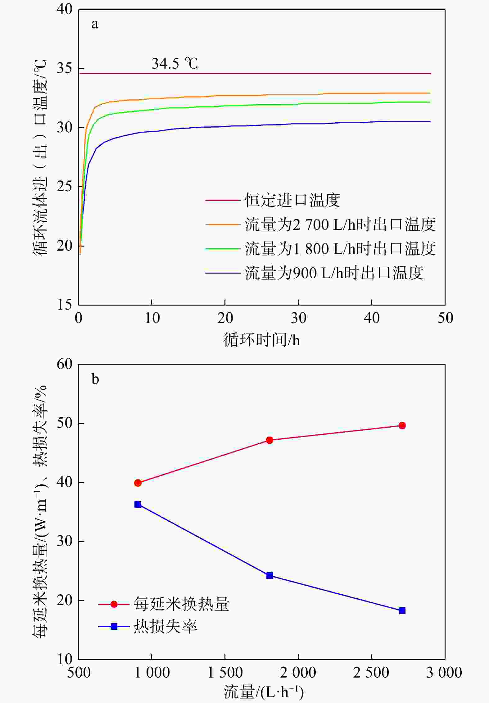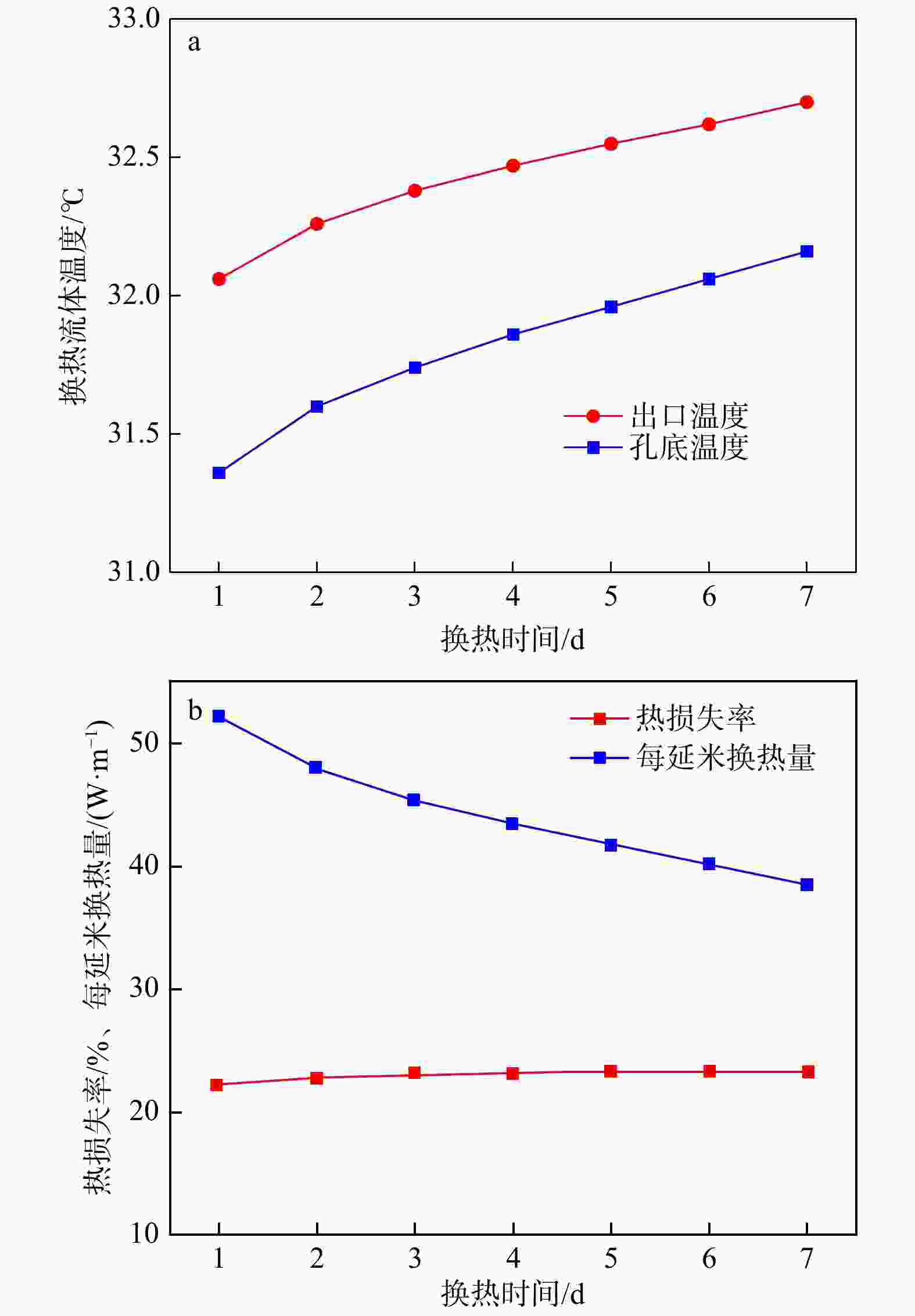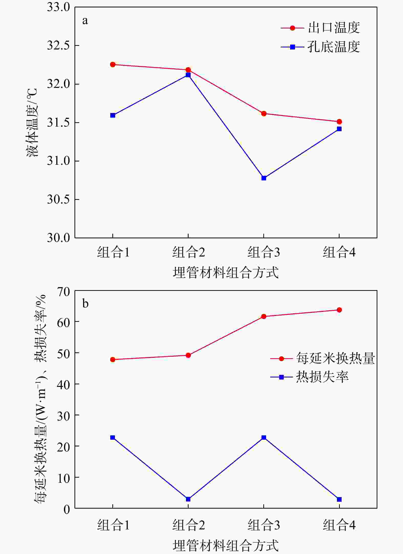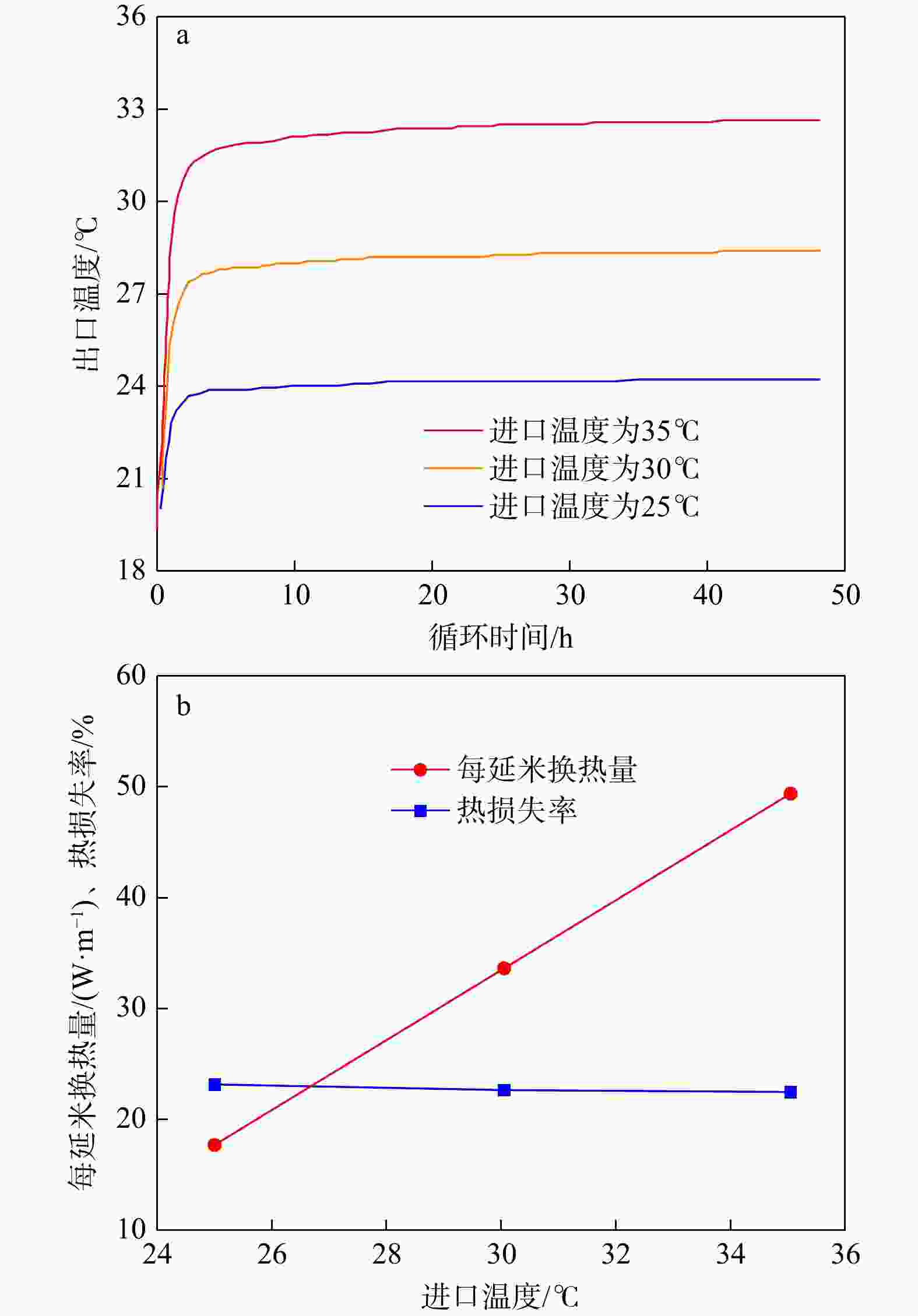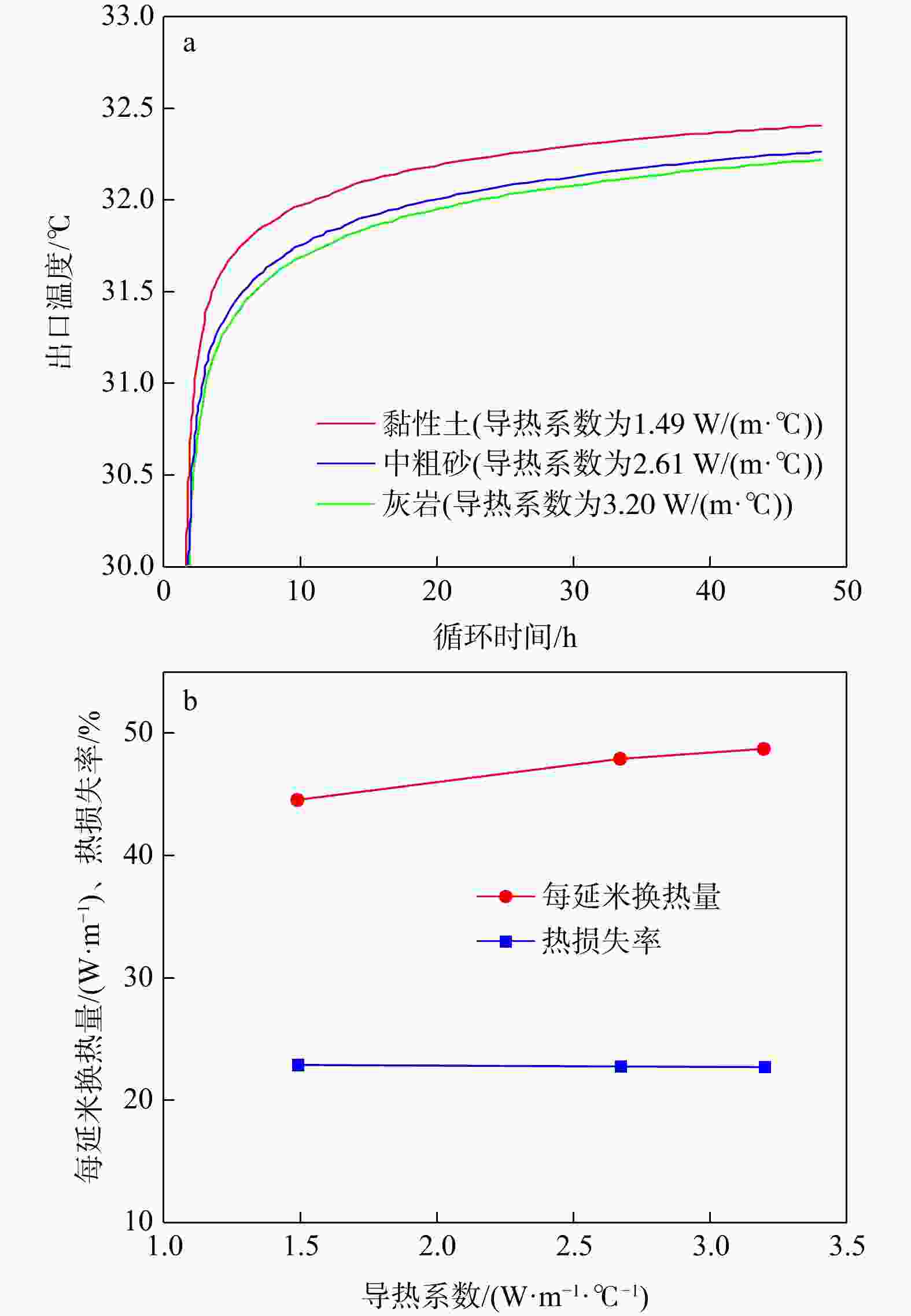 Figure 10. Outlet temperature variation with circulating time under different thermal conductivities of backfill materials (a) and heat exchange rate per meter and heat loss rate variation with thermal conductivities of backfill materials (b)