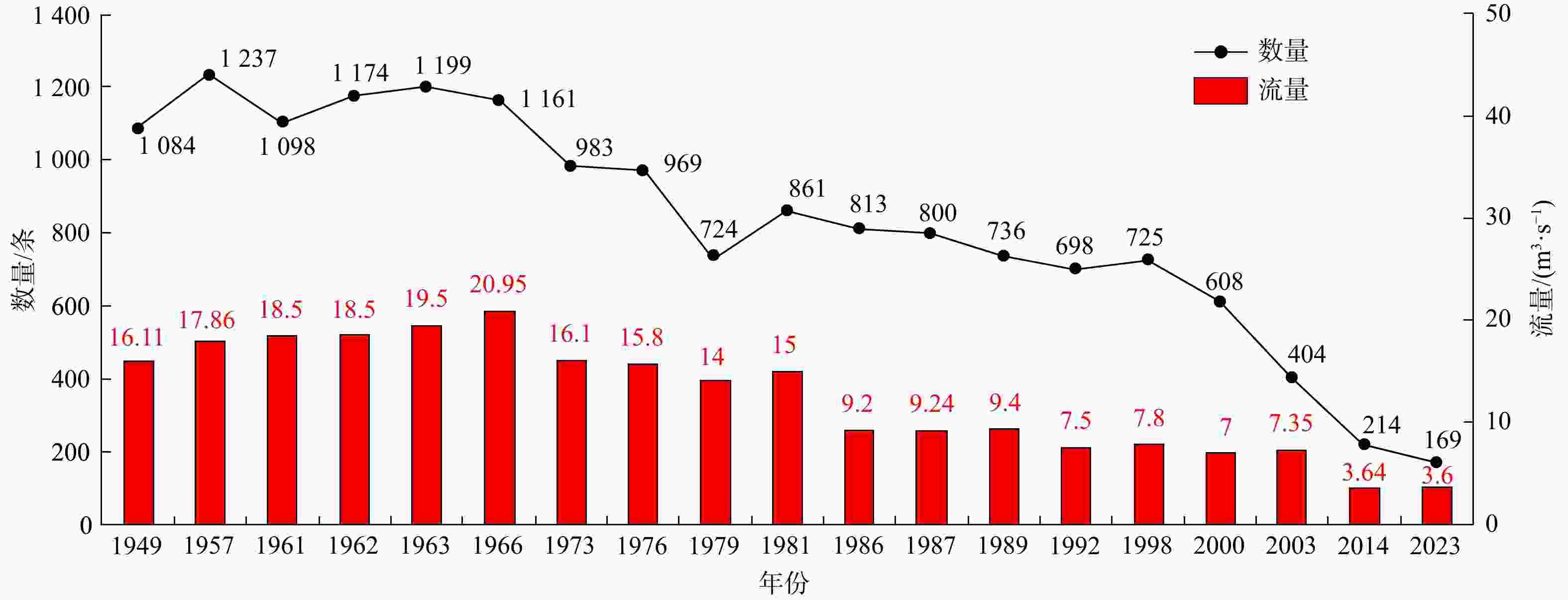 农业 工业 生活 生态 共计 用水量/亿m3 9.79 0.53 0.51 0.82 11.65 占比/% 84.0 4.6 4.4 7.0 100.0 表 2 2003、2014和2023年吐鲁番盆地坎儿井的数量和流量
