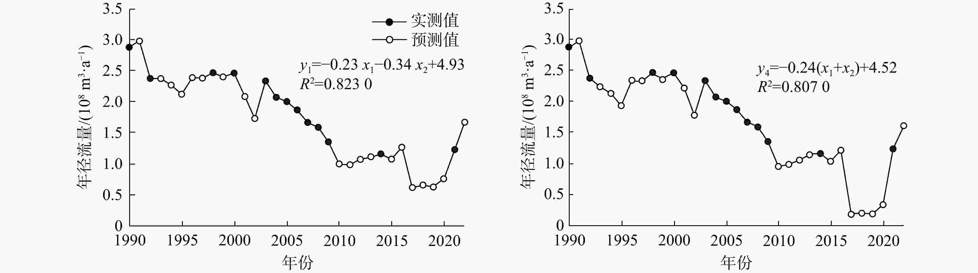 年份 实测值y/(108 m3·a−1) 预测值y1/(108 m3·a−1) 预测值y4/(108 m3·a−1) 预测值y5/(108 m3·a−1) 相对误差a1/% 相对误差a4/% 相对误差a5/% 1990 2.8760 2.6586 2.6963 2.6775 −7.6 −6.2 −6.9 1992 2.3652 2.5946 2.6338 2.6142 9.7 11.4 10.5 1998 2.4598 2.4488 2.4586 2.4537 −0.4 0.0 −0.2 2000 2.4600 2.6035 2.5654 2.5844 5.8 4.3 5.1 2003 2.3190 1.9363 1.8785 1.9074 −16.5 −19.0 −17.7 2004 2.0624 1.9336 1.8724 1.9030 −6.2 −9.2 −7.7 2005 1.9931 2.0839 2.0270 2.0554 4.6 1.7 3.1 2006 1.8543 1.6952 1.6569 1.6760 −8.6 −10.6 −9.6 2007 1.6556 1.3764 1.4337 1.4050 −16.9 −13.4 −15.1 2008 1.5800 1.5614 1.5625 1.5619 −1.2 −1.1 −1.1 2009 1.3466 1.7042 1.6615 1.6829 26.6 23.4 25.0 2014 1.1490 1.4185 1.3486 1.3836 23.5 17.4 20.4 2021 1.2200 1.3554 1.5320 1.4437 11.1 25.6 18.3 表 6 坎儿井年径流量回归分析统计