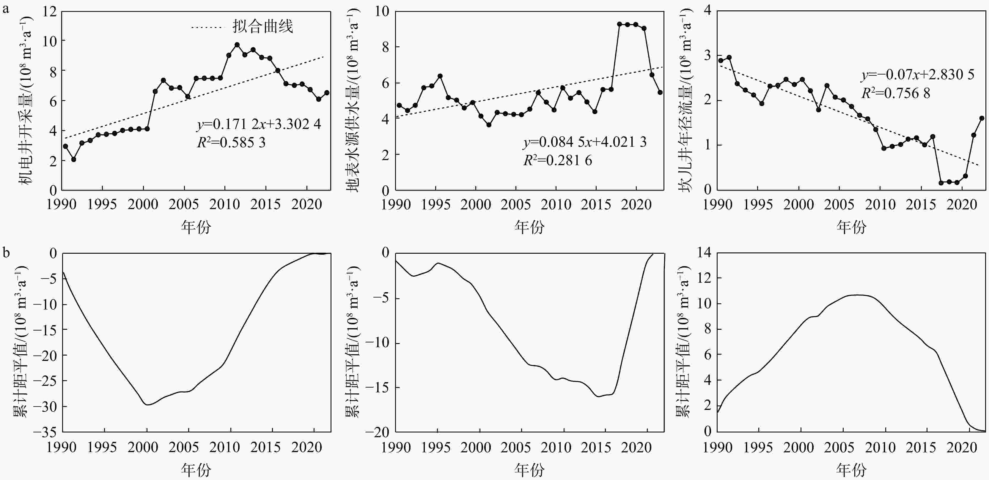 Methods Based on 13 years of discontinuous annual karez runoff data in the study area for the period 1990−2022, combined with year-by-year data on the exploitation of electro-mechanical wells and water supply from surface water sources, statistical analyses were performed using SPSS 20 to interpolate missing data, and trend and mutation analyses were used to determine their change curves and mutation years.