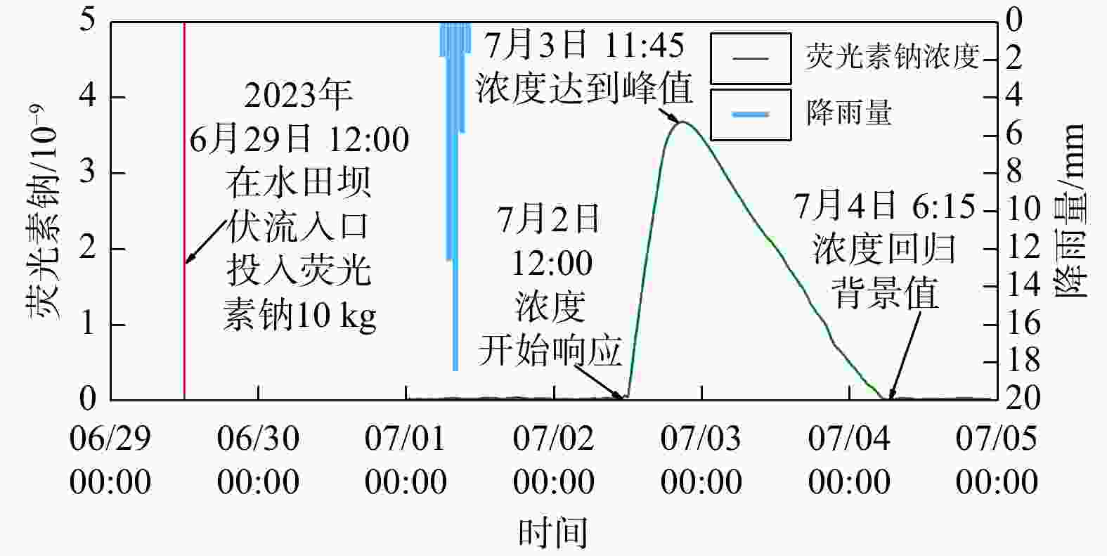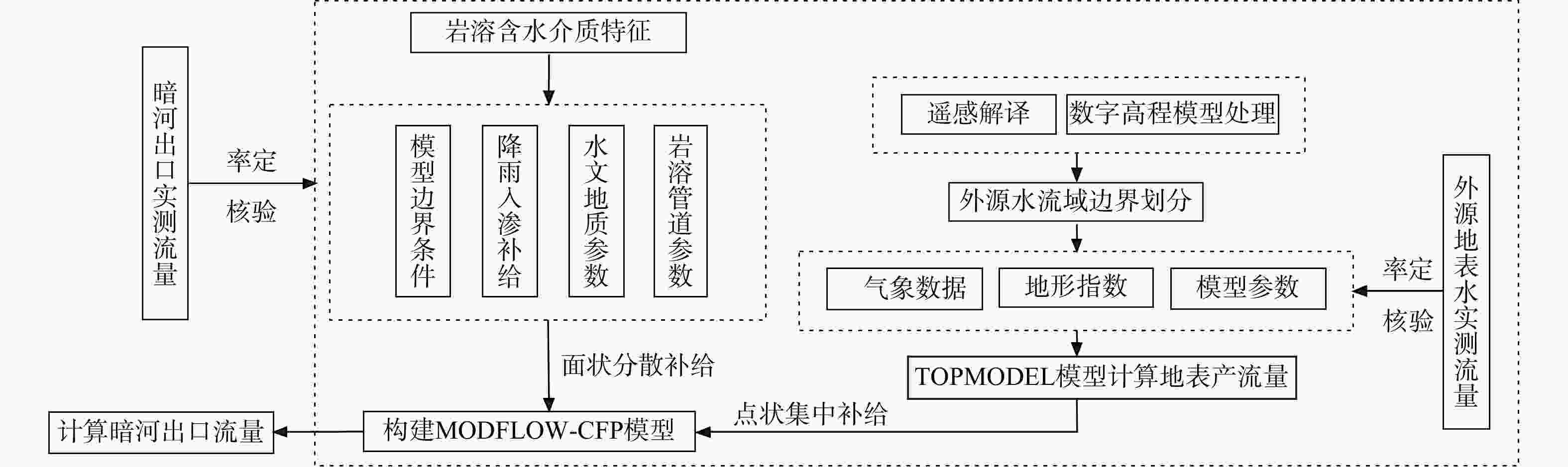 Methods Taking the Ganxi Yuquan Cave karst groundwater system in Enshi, Hubei as the study area, detailed investigation of the hydrogeological characteristics and recharge patterns of the karst groundwater system was conducted. Underground tracer tests and high-resolution monitoring of rainfall-surface-subsurface runoff dynamics were carried out. The MODFLOW-CFP numerical model was used to represent the dualmedium characteristics of karst fissures and conduits. Focusing on the concentrated inflow of external water from non-karst areas at the entrance of karst conduits, the surface water model TOPMODEL was used to quantitatively characterize the runoff generation and concentration processes of external water from non-karst catchment. This output was then set as the flow boundary condition at the conduit entrances in the MODFLOW-CFP model, achieving the coupling of surface water and groundwater models, and thereby improving the accuracy of representing external water recharge in the MODFLOW-CFP simulations.