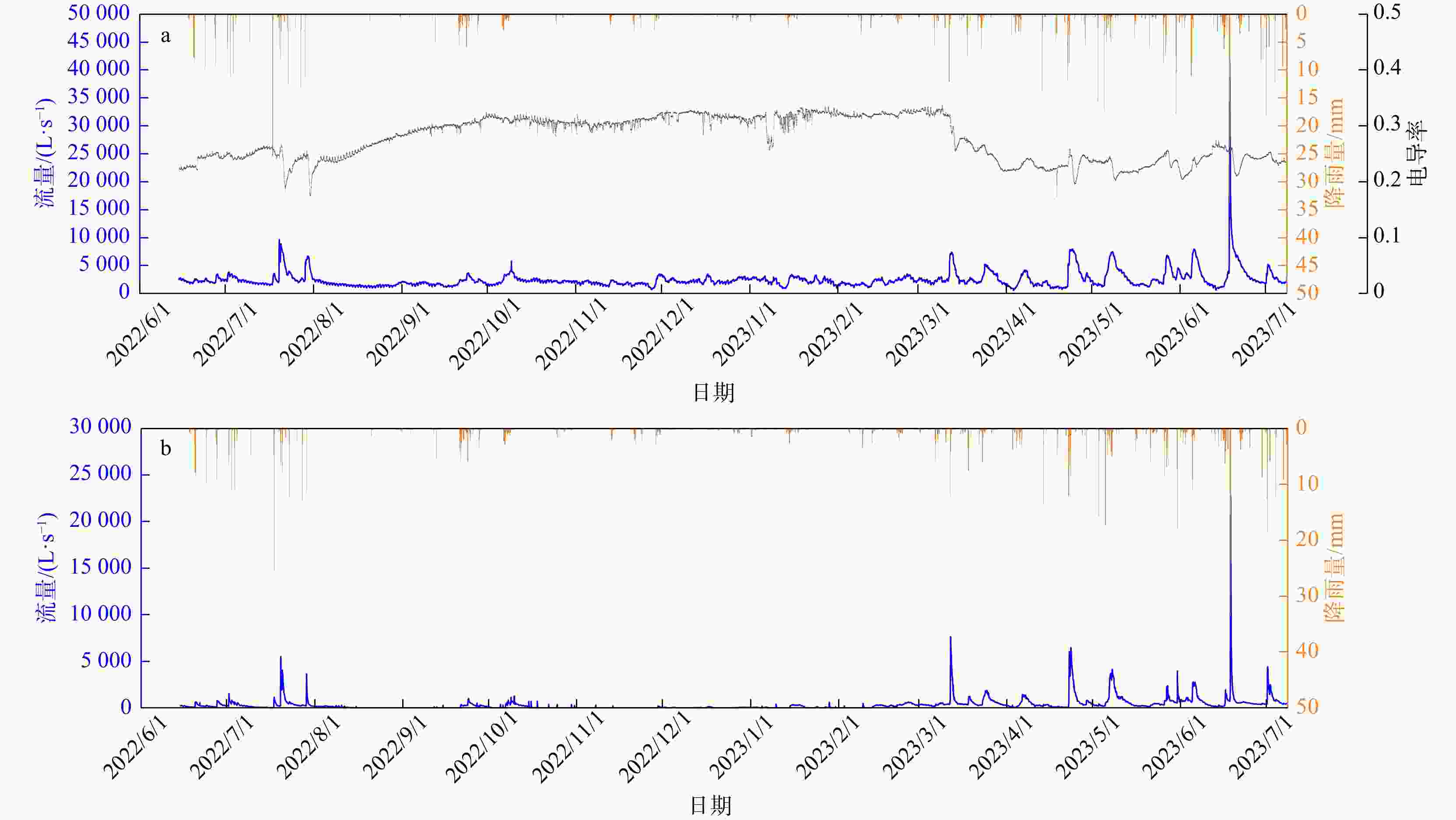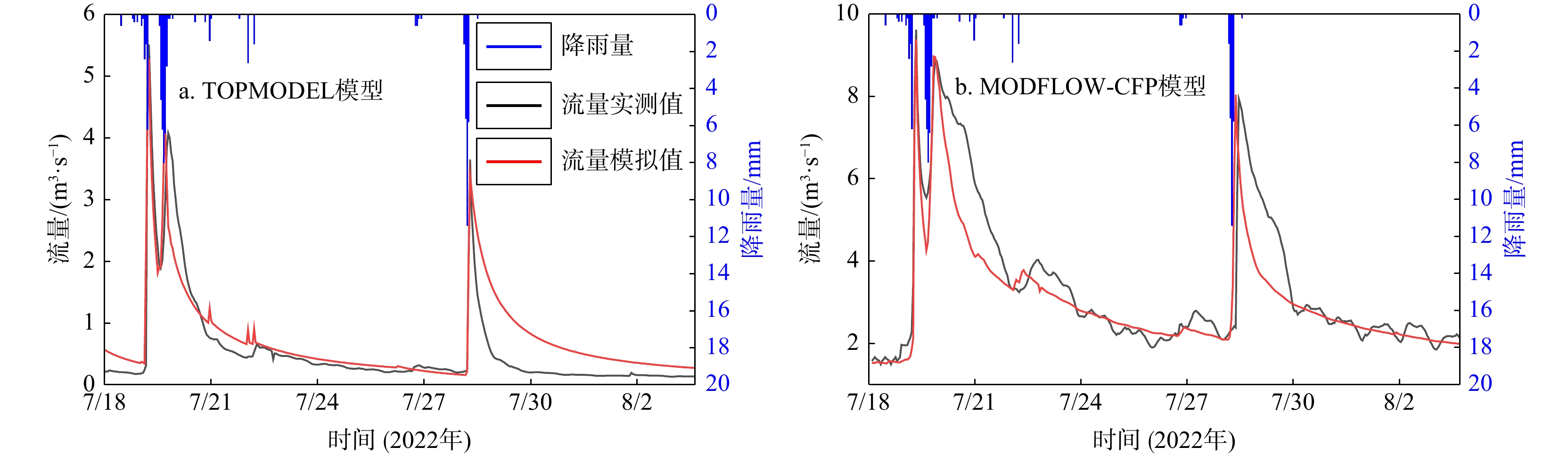 R 2为0.93,纳什效率系数NSE 为0.86。对模型的正确性进行检验,检验期模拟得到的暗河出口流量与实测值对比峰值相对误差在1.1%~2.5%,峰现时差在2 h内,相关系数R 2为0.91,纳什效率系数NSE 为0.77,有较好的拟合精度。本研究构建的TOPMODEL和MODFLOW-CFP耦合模型在外源水补给型岩溶水系统降雨−水文响应过程模拟上有着推广价值。Abstract:External water from non-karst areas is a common recharge source for karst groundwater system in Southwest China. The rapid and concentrated recharge of external water can lead to a unique hydrological response in the water-cycle processes of karst groundwater systems. Methods for investigation, monitoring, and numerically simulating for this special external-recharge process in karst groundwater systems remain insufficiently developed.