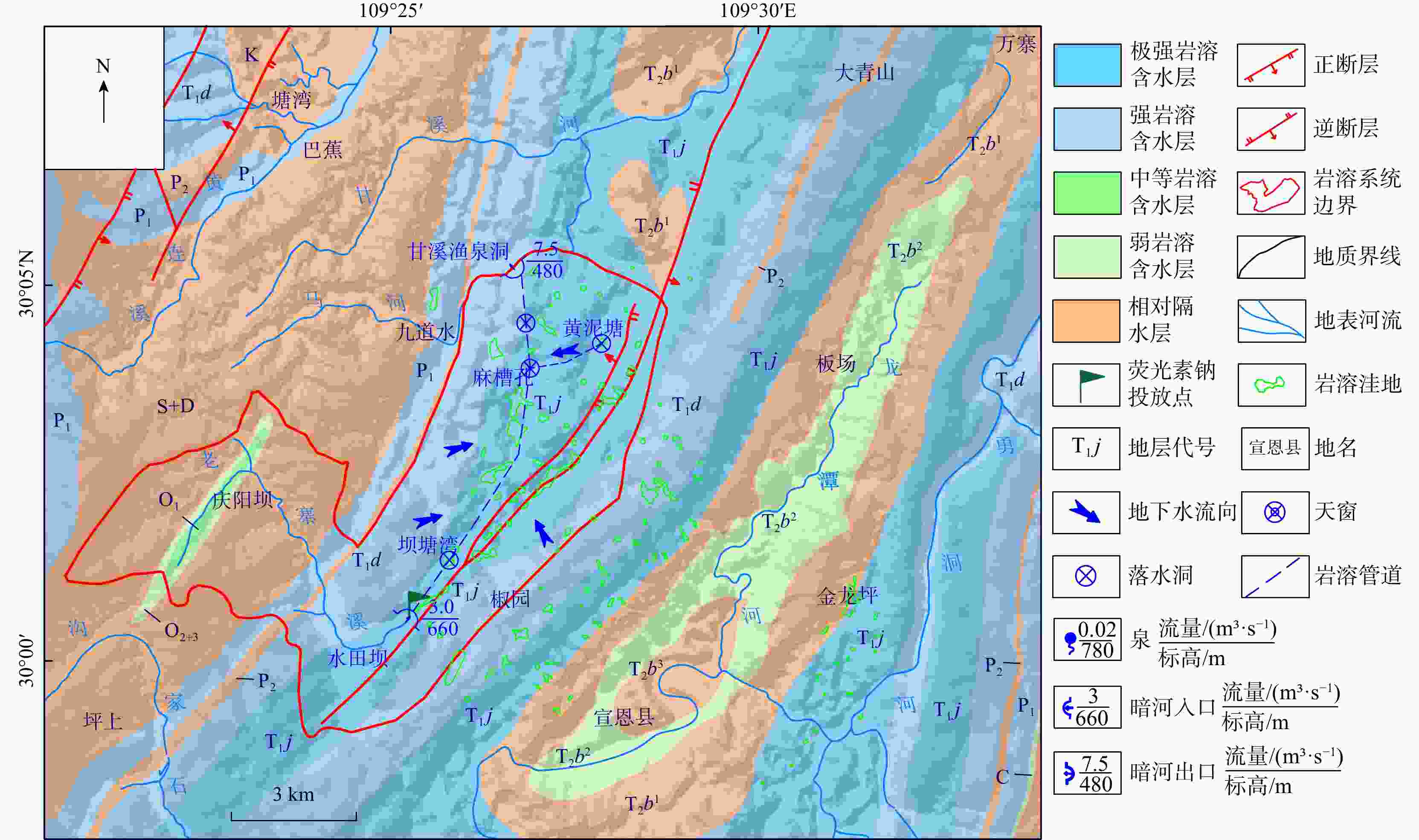 非岩溶区外源水是西南岩溶地下水系统较常见的补给来源,外源水的快速、集中补给方式使岩溶地下水系统的水循环表现出独特的响应,这种特殊补给方式的岩溶水系统调查、监测和数值模拟方法尚不够完善。为探究外源水补给型岩溶水系统数值模拟技术方法,以湖北省恩施市甘溪渔泉洞岩溶水系统为研究对象,在岩溶水系统含水介质特征、补给方式调查、地下水示踪试验以及高分辨率降雨−地表−地下径流的动态监测等工作基础上,采用MODFLOW-CFP数值模型刻画岩溶裂隙与管道双重介质特征,并针对岩溶管道入口处非岩溶区外源水集中灌入式补给的特点,采用地表水模型TOPMODEL来定量刻画非岩溶区外源水的产汇流过程,将其作为MODFLOW-CFP模型中岩溶管道入口的流量边界条件,实现地表−地下水模型的耦合,从而提高MODFLOW-CFP对外源水刻画的精度。研究结果表明:利用TOPMODEL和MODFLOW-CFP模型模拟甘溪渔泉洞暗河出口流量,与实测值对比峰值相对误差在0.7%~19.7%,峰现时差在3 h内,相关系数