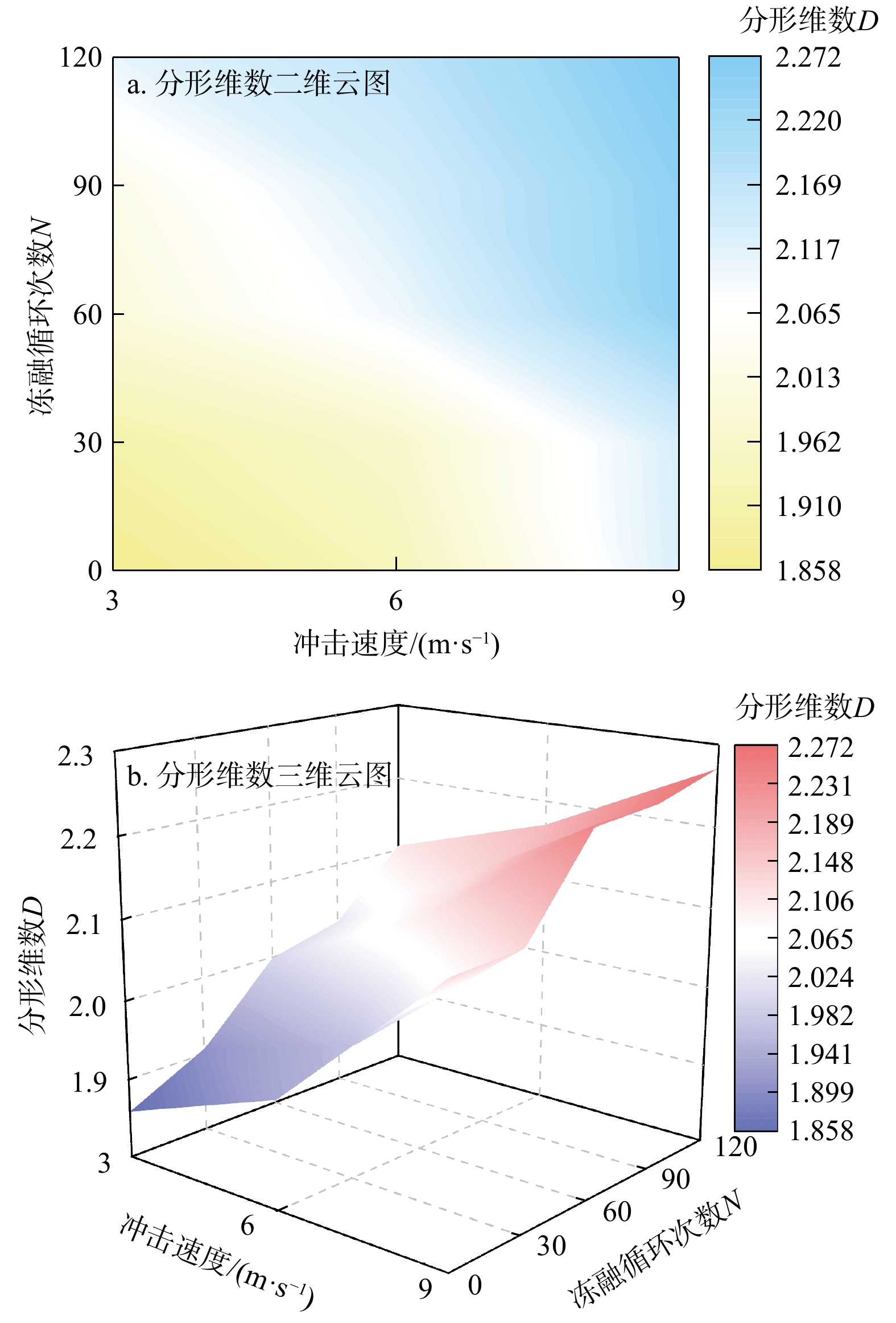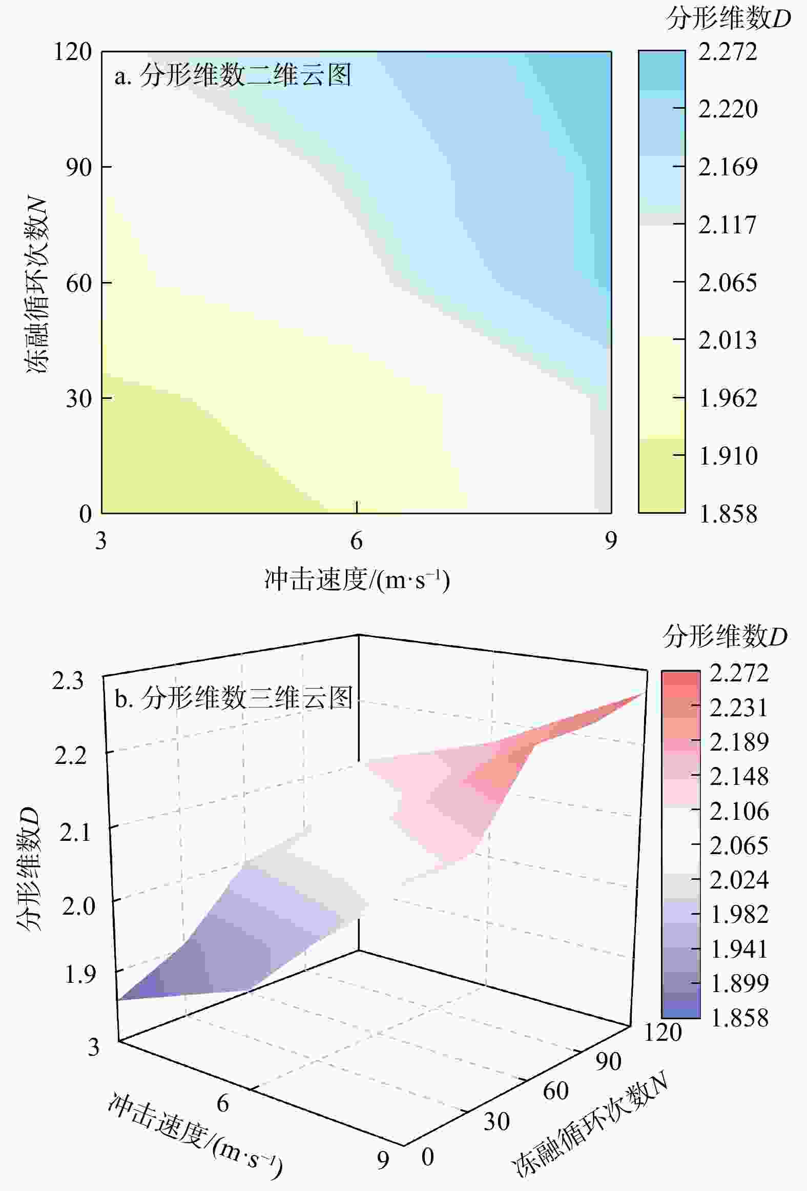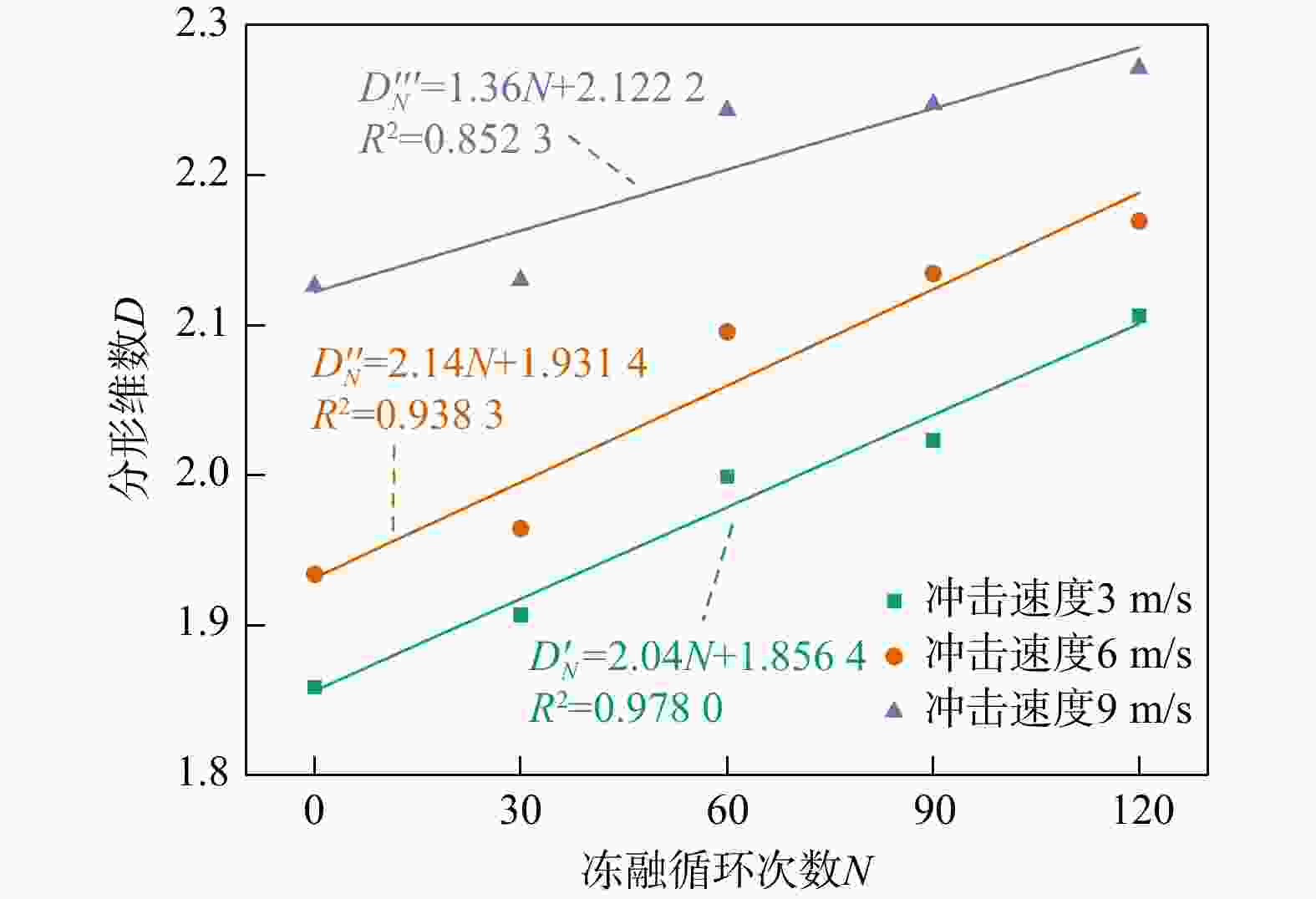 冲击速度/(m·s−1) $\sigma_0 $/MPa λ 3 144.2665 0.0036 6 182.6647 0.0035 9 210.9563 0.0034 表 4 不同冲击速度下冻融砂岩试样分形维数的参数(a, b)