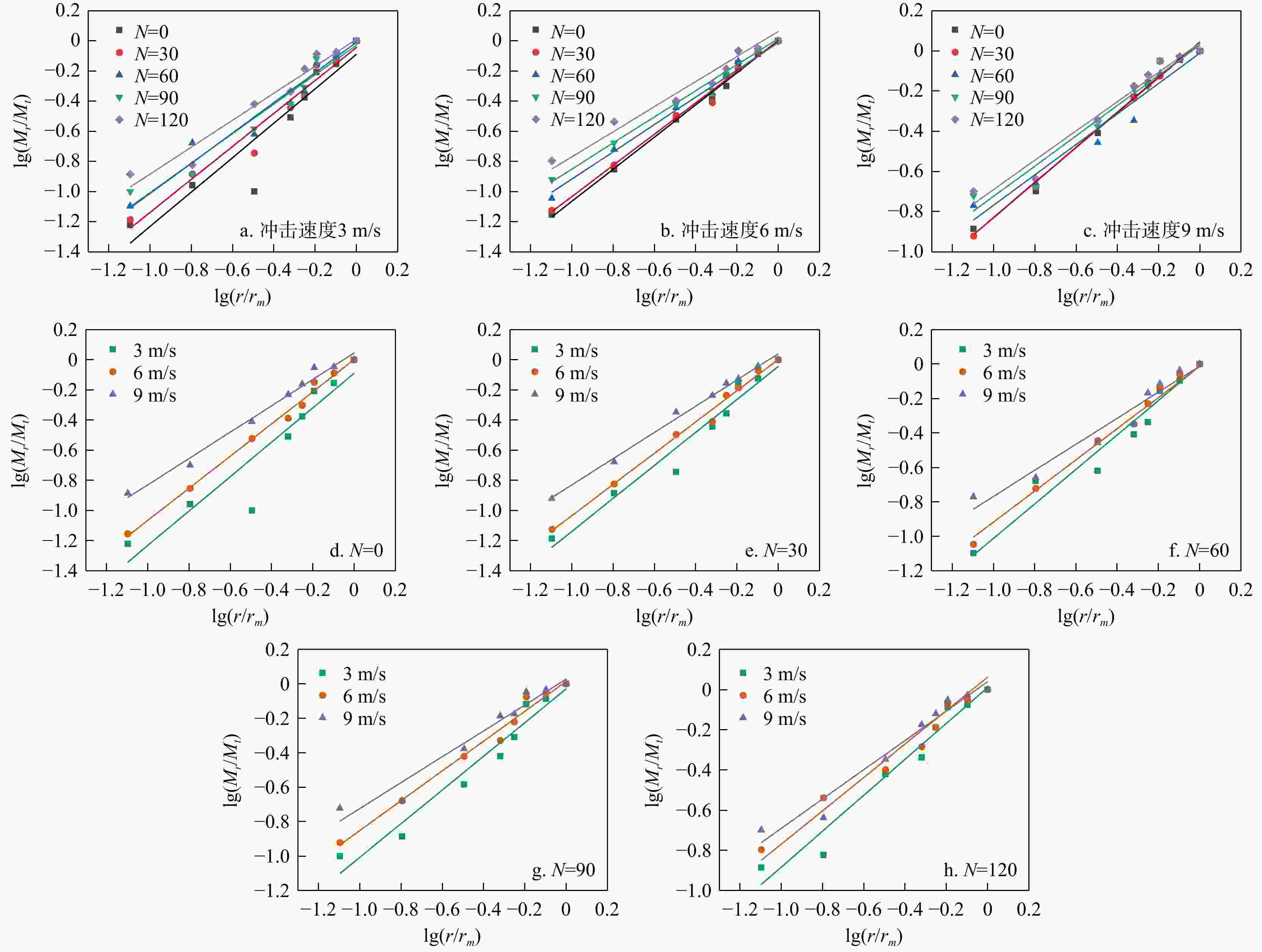 模量/GPaDY-3-0 3 0 144.27 1.68 315.65 DY-3-30 30 132.53 5.05 80.73 DY-3-60 60 118.36 5.38 88.19 DY-3-90 90 101.21 5.21 77.11 DY-3-120 120 94.98 5.49 37.73 DY-6-0 6 0 182.66 8.77 144.11 DY-6-30 30 171.67 8.17 24.17 DY-6-60 60 145.56 12.66 23.60 DY-6-90 90 132.05 9.76 69.10 DY-6-120 120 119.45 8.17 21.52 DY-9-0 9 0 210.96 9.80 102.42 DY-9-30 30 189.23 9.43 111.01 DY-9-60 60 172.36 7.72 57.17 DY-9-90 90 158.67 14.81 86.52 DY-9-120 120 137.98 10.11 62.95 注:“DY-6-30”中“DY”表示动态压缩;下同 表 2 lg(Mr/Mt)–lg(r/rm)曲线公式拟合及分形维数计算结果