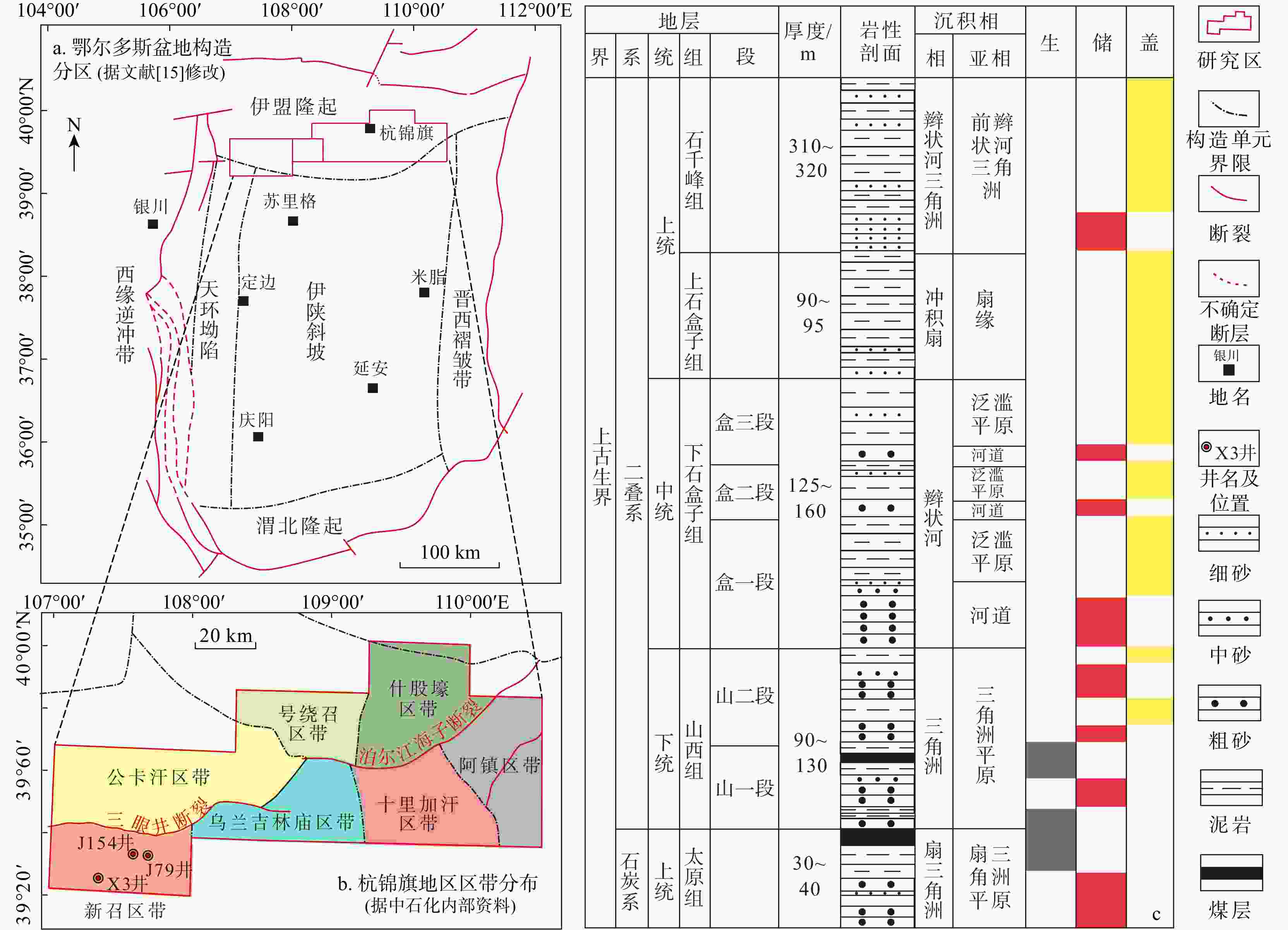 图 1 研究区构造位置(a, b)及上古生界地层综合柱状图(c)(c图据文献[17]修改)
