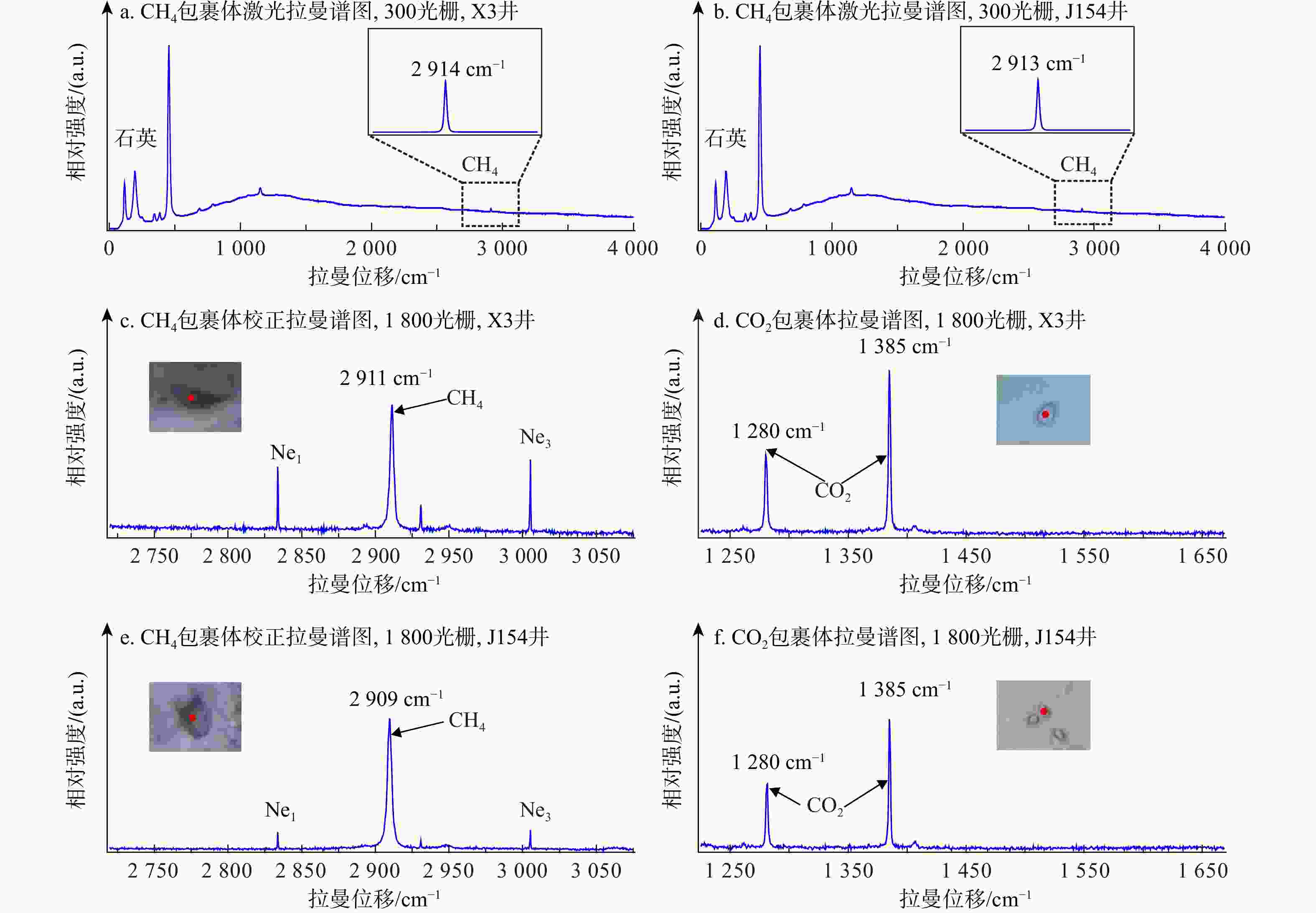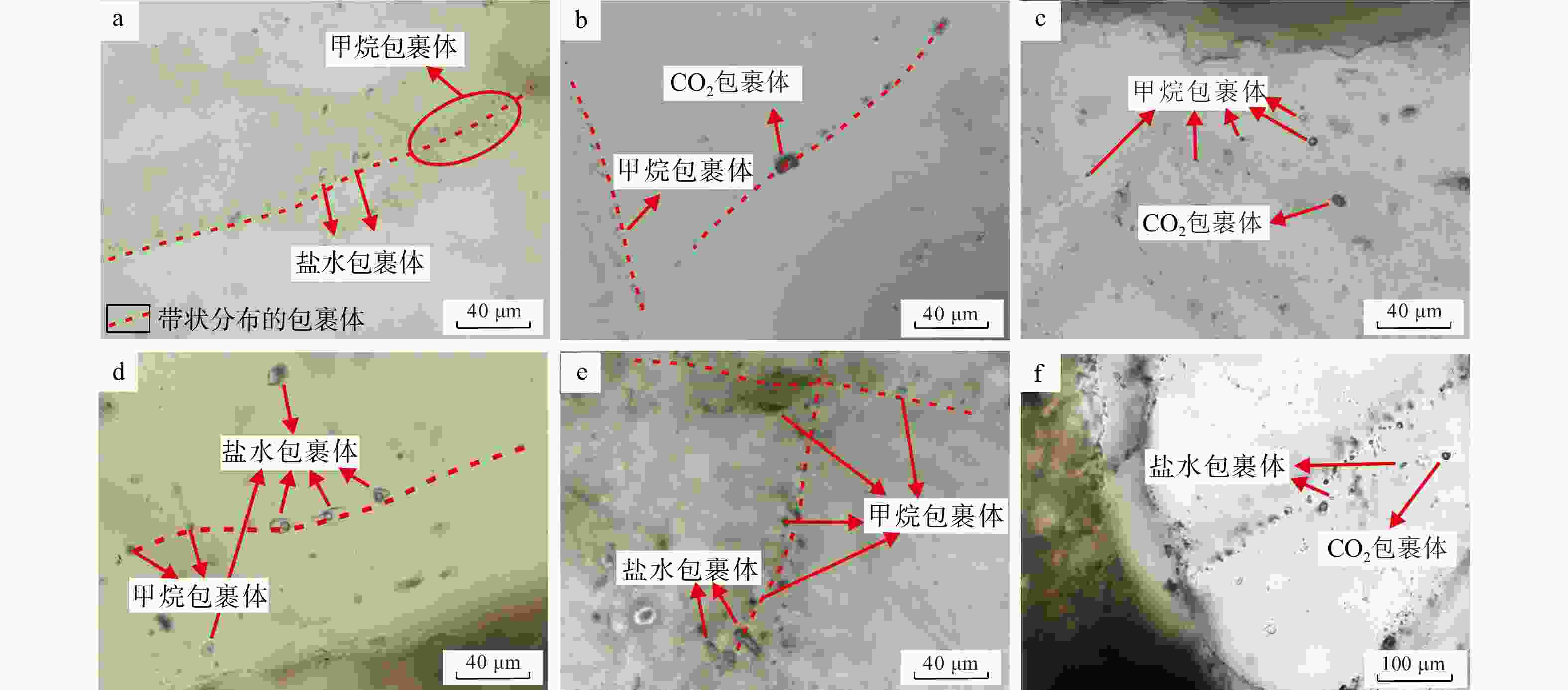 3794.9 m,山二段;b. 带状分布的CH4包裹体和CO2包裹体,X3井3794.9 m,山二段;c. 零散分布的CH4包裹体和CO2包裹体,X3井3794.9 m,山二段;d. 甲烷包裹体和与其共生的盐水包裹体,X3井3796.7 m,山二段;e. 带状分布的CH4包裹体和与其共生的盐水包裹体,X3井3796.7 m,山二段;f. CO2包裹体和与其共生的盐水包裹体,J154井3523.4 m,山二段Figure 2. Distribution and morphological characteristics of fluid inclusions in quartz particles of tight sandstone in the Xinzhao area (single polarized light)