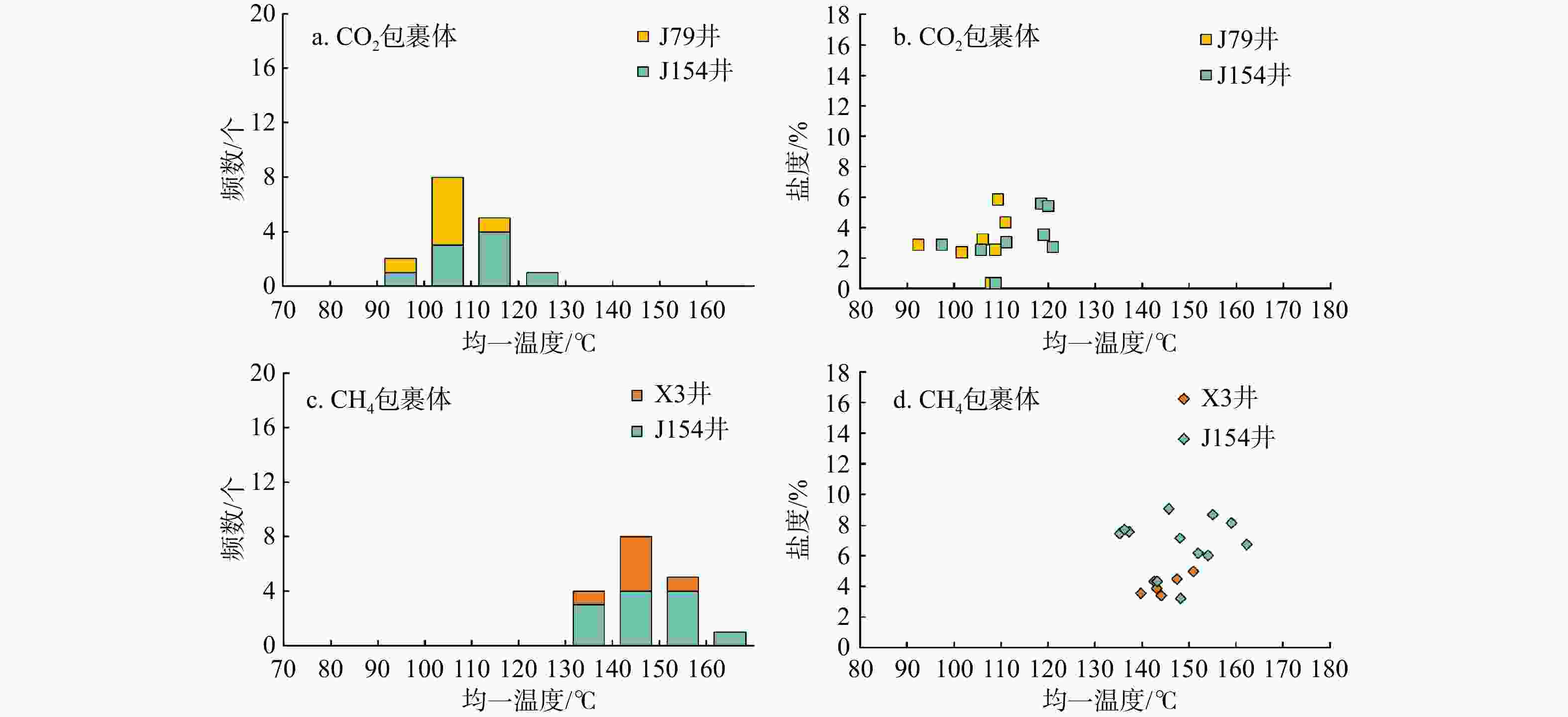 包裹体类型 井号 置信区间/℃ 中位数/℃ 平均数/℃ 相对标准偏差 CO2包裹体 J79井 101.5~109.3 107.8 105.2 0.06 J154井 105.8~119.5 111.0 111.9 0.07 CH4包裹体 J154井 138.7~154.8 148.2 148.0 0.06 X3井 141.9~148.3 148.3 144.7 0.03 表 2 新召地区山二段甲烷包裹体密度及捕获压力计算结果