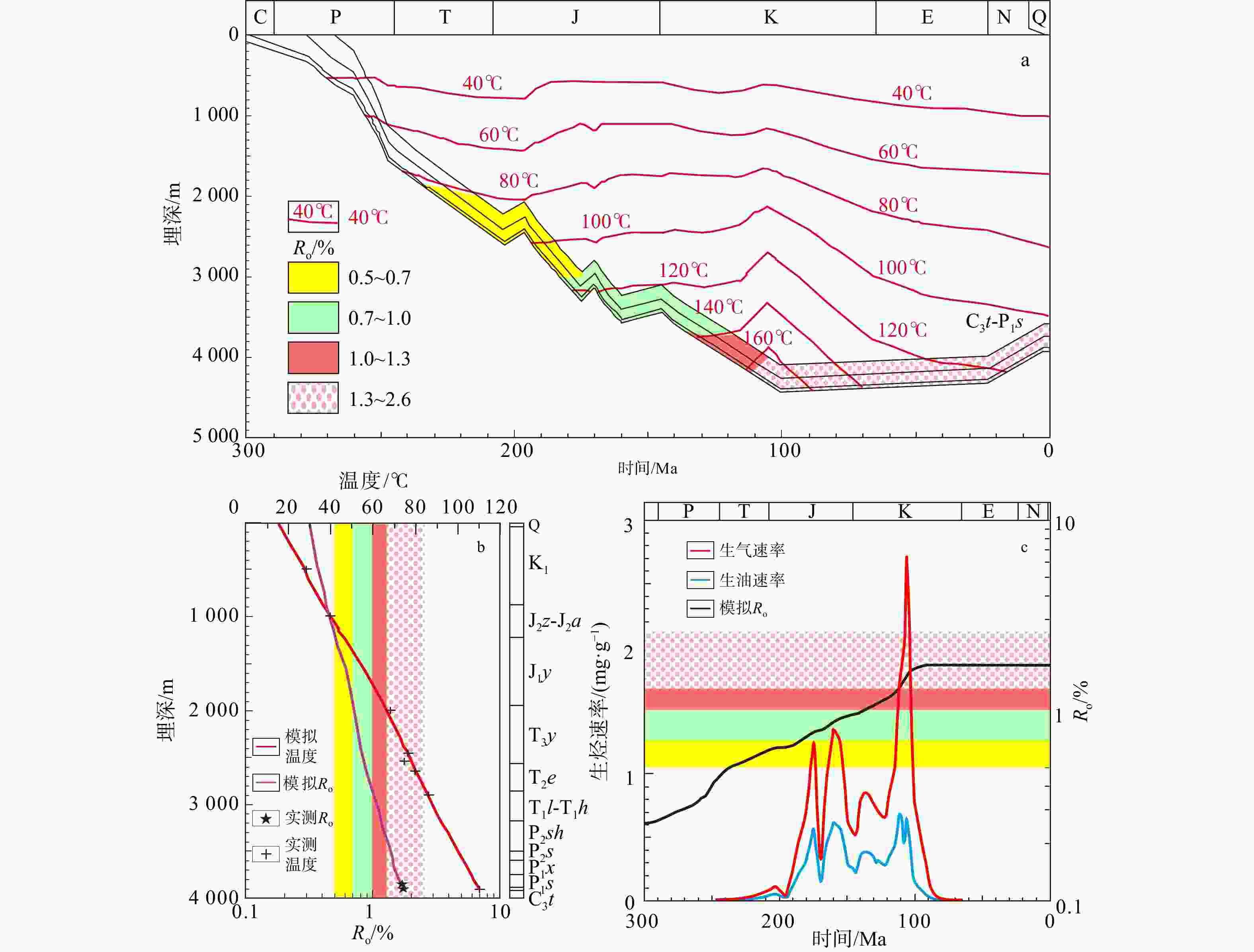 图 5 新召地区X3井埋藏史(a)−热史(b)−生烃史(c)模拟