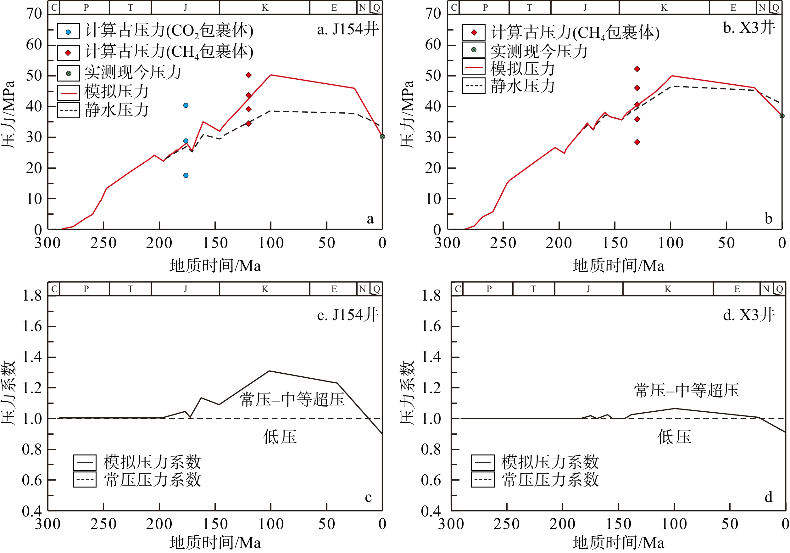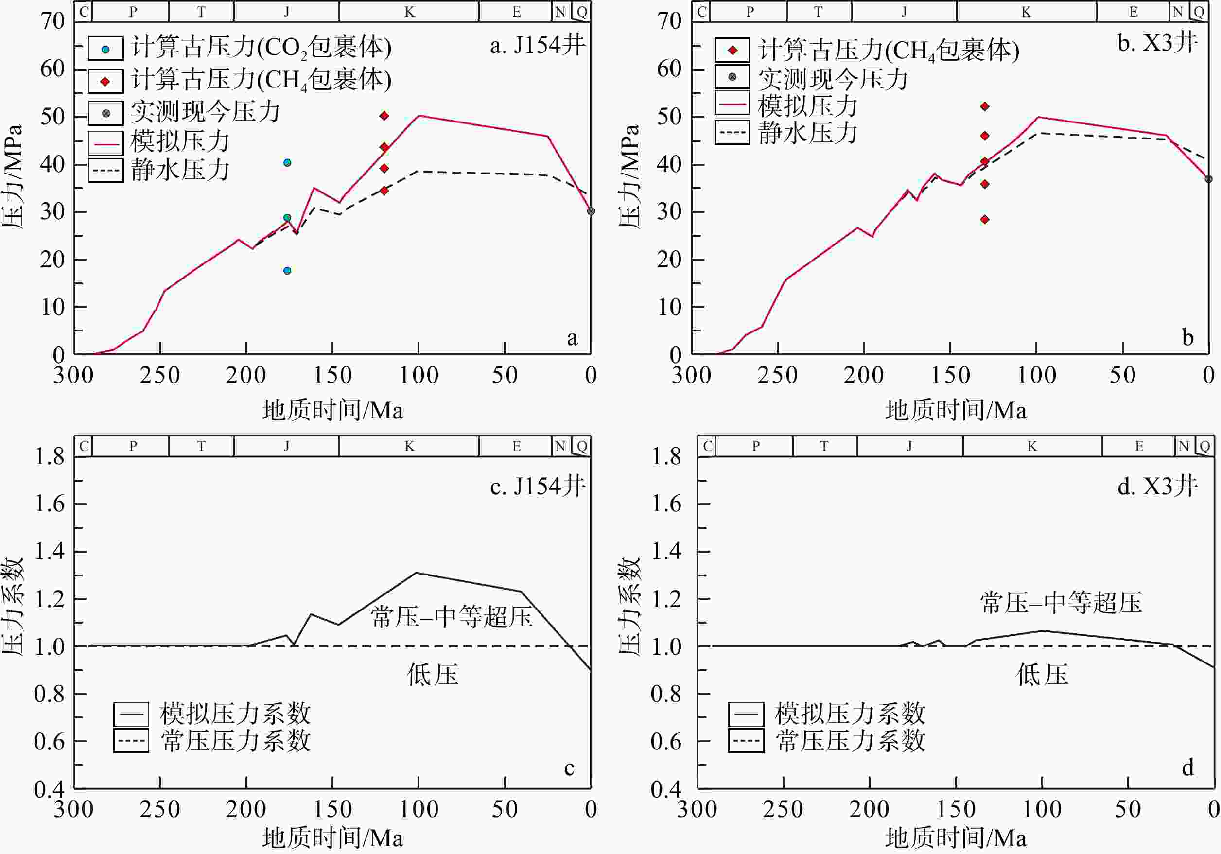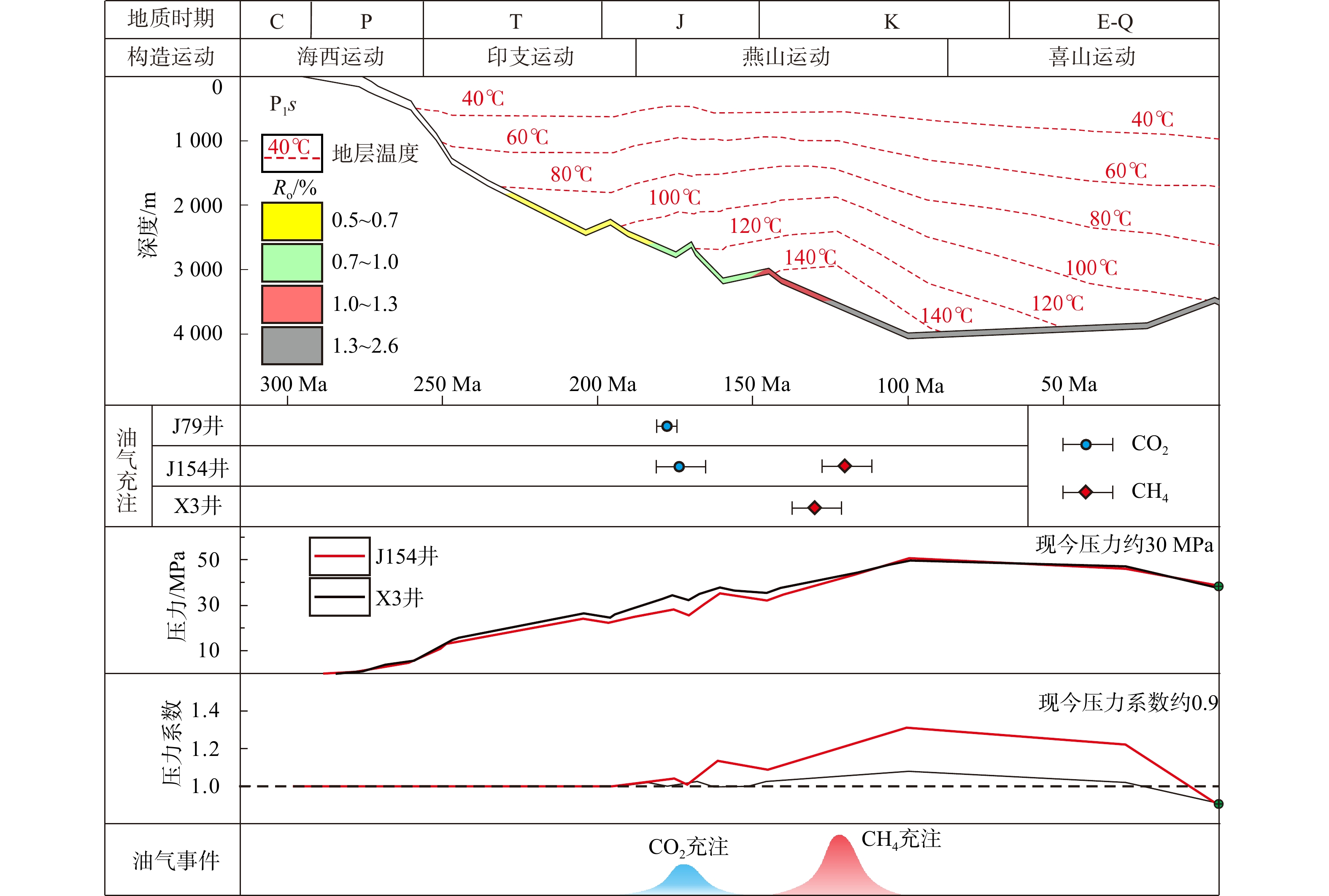 包裹体X3井 2921.9937 0.1703 143.6 40.86 1.02 2922.3414 0.1854 143.6 46.17 1.15 2920.9502 0.1267 143.6 28.10 0.70 2922.6894 0.2008 143.6 52.22 1.31 2921.6460 0.1555 143.6 36.15 0.90 J154井 2922.4952 0.1923 150.1 50.02 1.44 2922.1482 0.1767 150.1 44.10 1.27 2921.8010 0.1615 150.1 38.94 1.12 2921.4540 0.1469 150.1 34.42 0.99 注: 压力计算测点数共计36个,此处省略包裹体密度相同的测点;$\varDelta_{{\mathrm{CO}}_2} $,$v_{{\mathrm{CH}}_4} $分别为经式(1)和式(2)校正后的CO2包裹体的费米双峰间距和甲烷包裹体的拉曼散射峰波数 表 3 盆地模拟中的相关地质参数