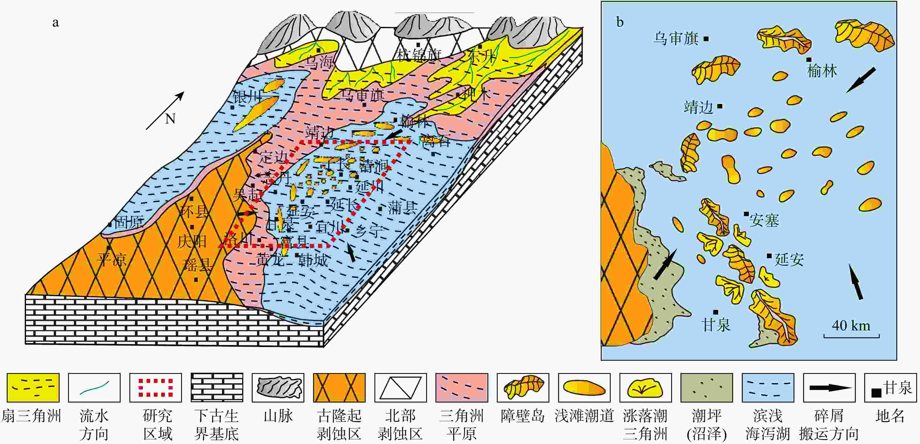 Figure 11. Paleogeographic background during the sedimentation of the Benxi Formation in the Ordos Basin (a) and distribution of source areas in the Yanchang Gas Field (b)