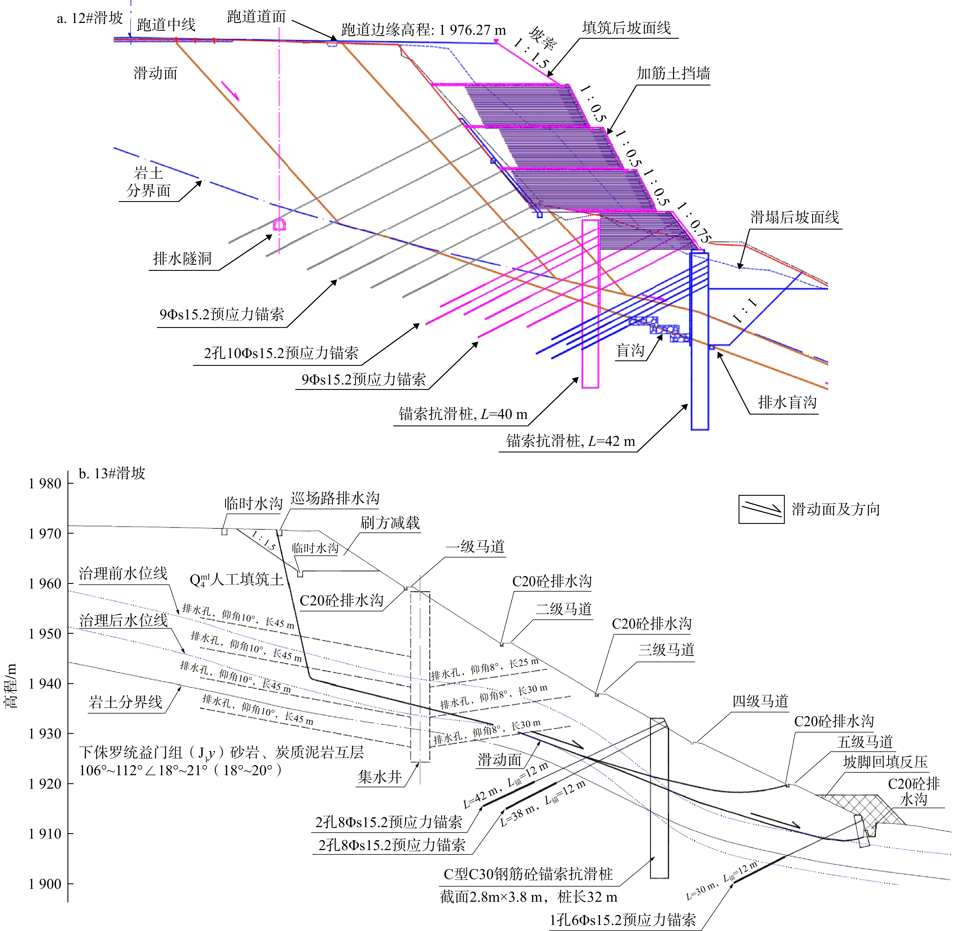 由于特殊的工程地质环境条件,山区机场修建产生了大量的高填方边坡工程,其面临的最大问题为运营阶段高填方边坡变形控制与长期稳定。以攀枝花机场为例,在系统回顾建设期及运营期地质灾害史的基础上,详述了运营期3处典型高填方滑坡发育特征。采用工程地质勘察结合现场岩土试验分析了高填方滑坡成因及演化机理,提出了控滑关键技术。结果表明,有利于地表水汇集的地形地貌和有利于降雨入渗特殊的上软下硬单向顺坡缓倾坡体结构是其产生的内因。降雨集中且短时暴雨多发,地下水丰富且容易富集于相对隔水层是其产生的诱发因素;攀枝花机场高填方边坡失稳演化机制可以概括为:强降雨长期入渗−地下水升高−基覆界面软弱面土体软化且抗剪强度衰减−推移式蠕滑−支挡结构失效−累进性滑移剪断−整体滑动。研究表明,山区机场高填方边坡修筑应重点解决基覆界面软弱层抗剪强度控制和地下疏排水工程设置问题。该高填方滑坡再整治采取了抗滑桩强支挡结合排水隧洞或集水井疏排地下水,治理工后监测表明排水效果良好。研究结果可为其他高填方工程变形机理研究及工程整治提供借鉴。