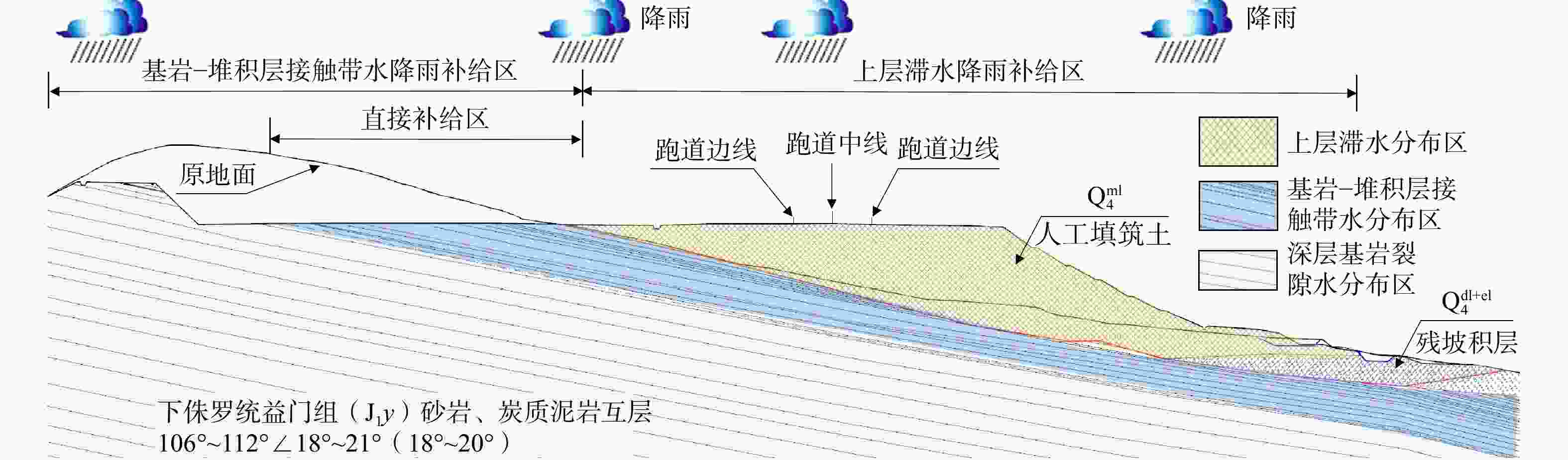 Results The results indicate that the internal causes including topography conducive to surface water concentration and the specific unidirectional gently inclined slope structure with soft upper and hard lower layers that facilitate rainfall infiltration. The triggering factors are characterized by concentrated rainfall, frequent short-term rainstorms, abundant groundwater, and the tendency to accumulate above relatively impermeable layers. The instability evolution mechanism of the high-fill slope at Panzhihua Airport can be summarized as follows: long-term infiltration of heavy rainfall, rising groundwater level, softening and shear strength degradation of the weak interface at the fill-bedrock contact, push-creep sliding, failure of retaining structures, progressive sliding and shearing, overall slope failure. The construction of high-fill slopes in mountainous airports should focus on controlling the shear strength of weak layers at the fill-bedrock interface and implementing underground drainage systems.